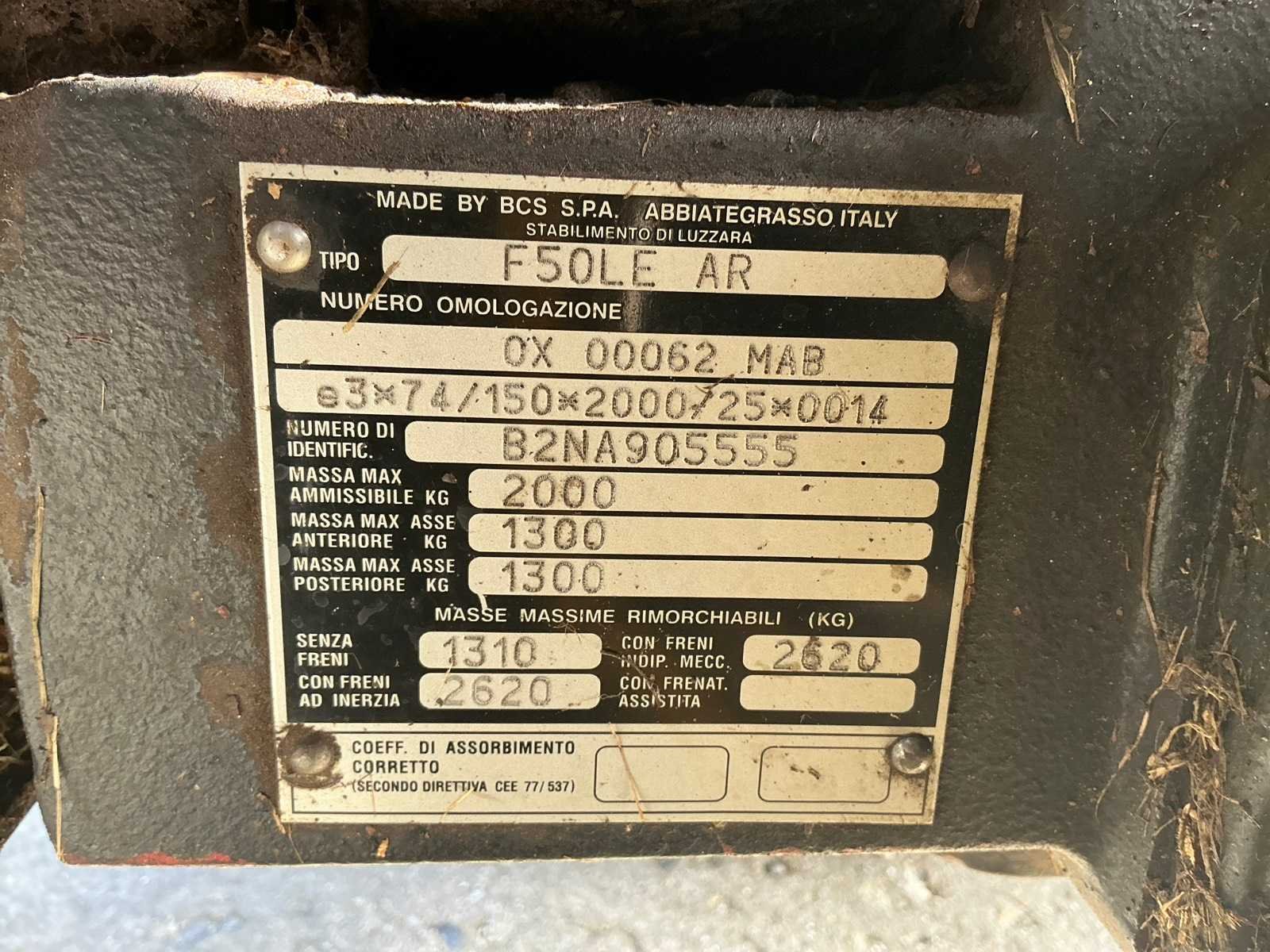 Deze Ferrari F50LE AR smalspoortractor is gebouwd door BCS S.p.A. in Italië en staat bekend om zijn wendbaarheid en betrouwbaarheid. Dankzij het compacte ontwerp is hij ideaal voor gebruik in boomgaarden, wijngaarden of andere smalle terreinen. PDe tractor beschikt over een maximaal toelaatbaar gewicht van 2000 kg, met een voorasbelasting van 1300 kg en achterasbelasting van 1300 kg. De maximale sleepmassa bedraagt 2620 kg met remmen. Uitgerust met vierwielaandrijving en brede landbouwbanden biedt deze machine uitstekende tractie en stabiliteit. Een degelijke en veelzijdige compacttractor die uitermate geschikt is voor professioneel gebruik in landbouw, tuinbouw of terreinonderhoud. Met 4 brede banden om elk terrein aan te kunnen. Steeds tijdig onderhouden door het bedrijf. Start en rijdt goed. Alles getest en video beschikbaar. Nee Merk: Ferrari Type: F50LE AR Serienummer: B2NA905555 Motorvermogen (kW): 36.8kW Afgelezen urenstand: 2149 Self drive export possible : true