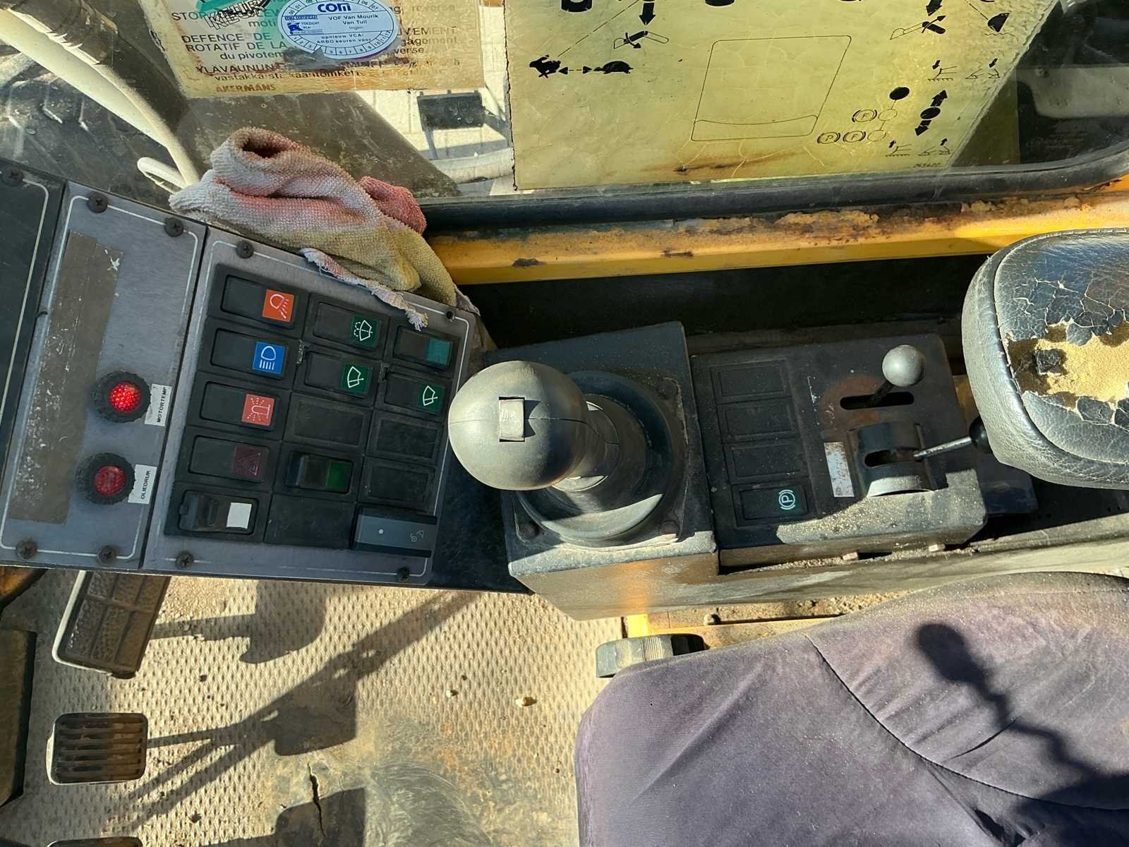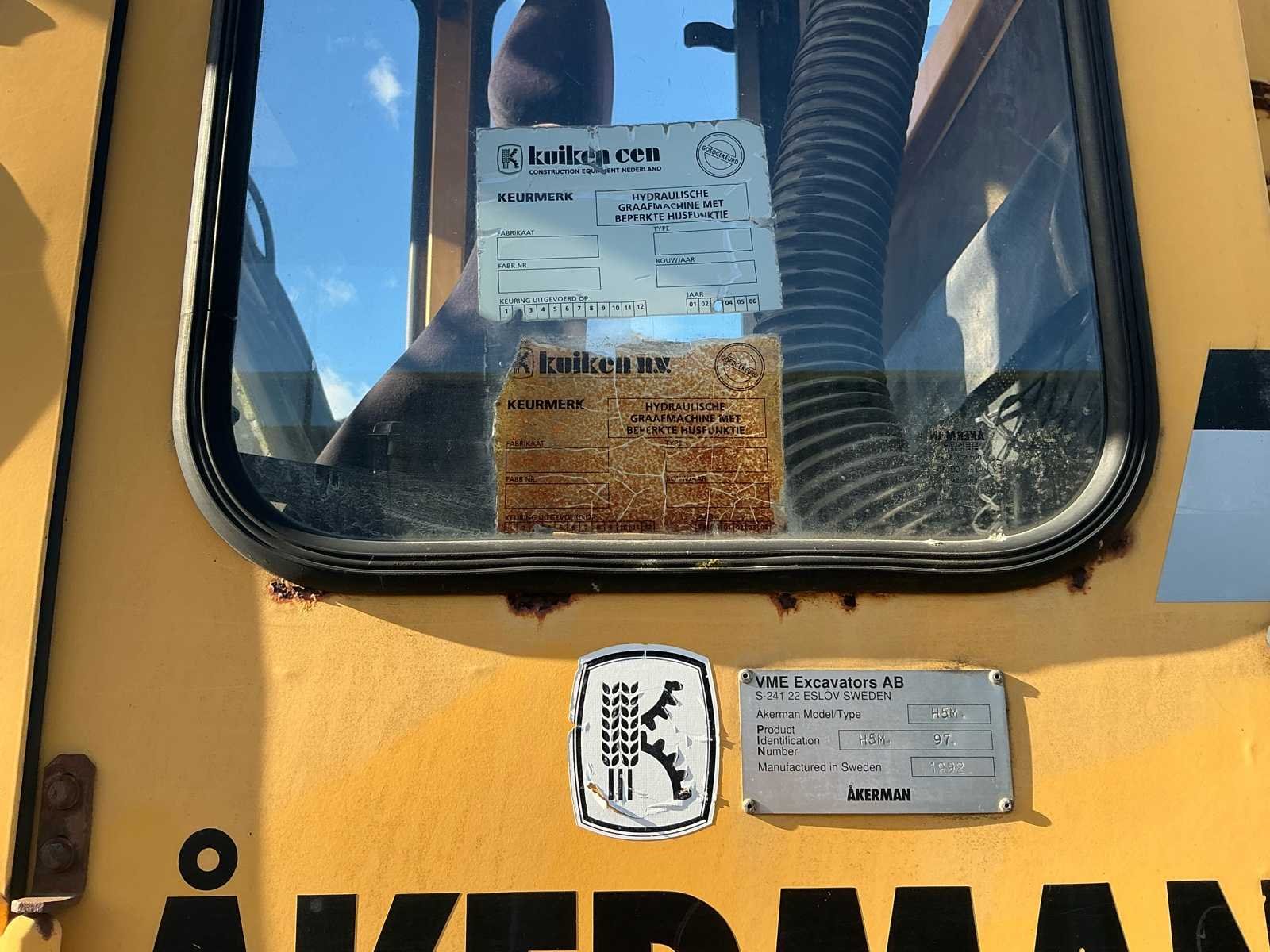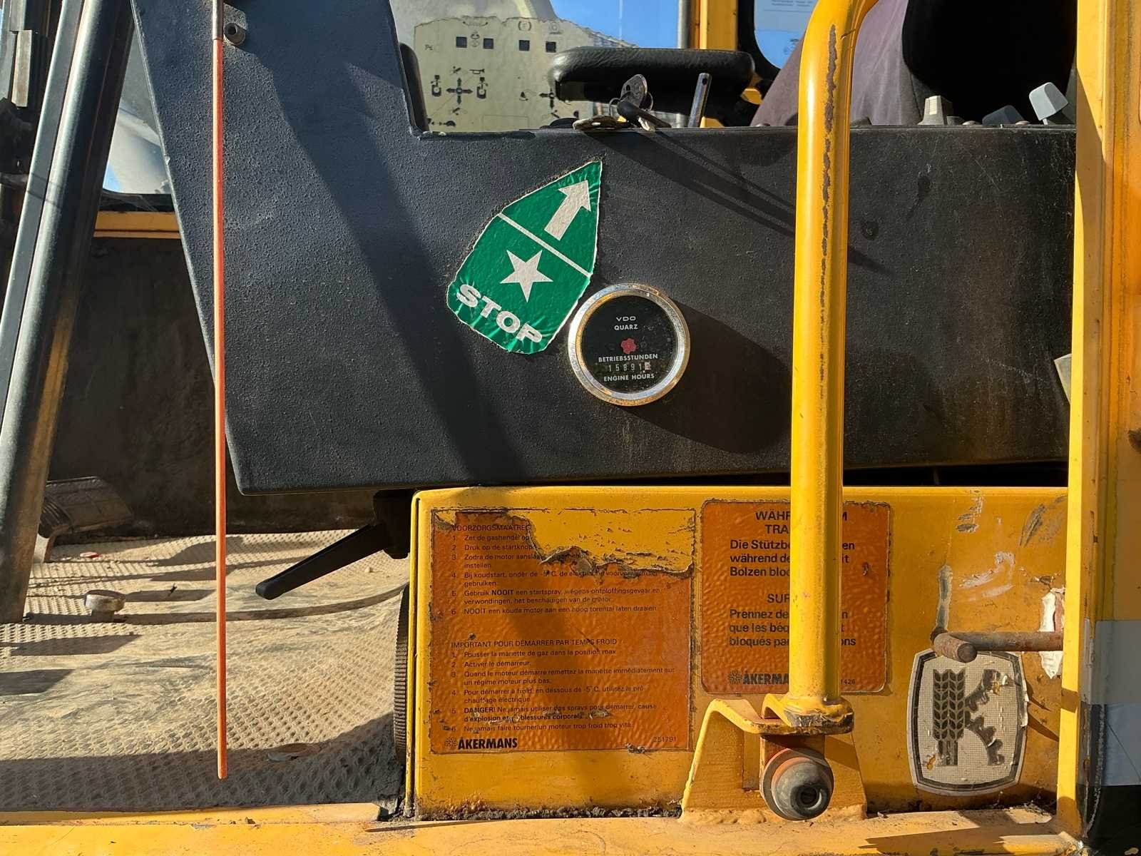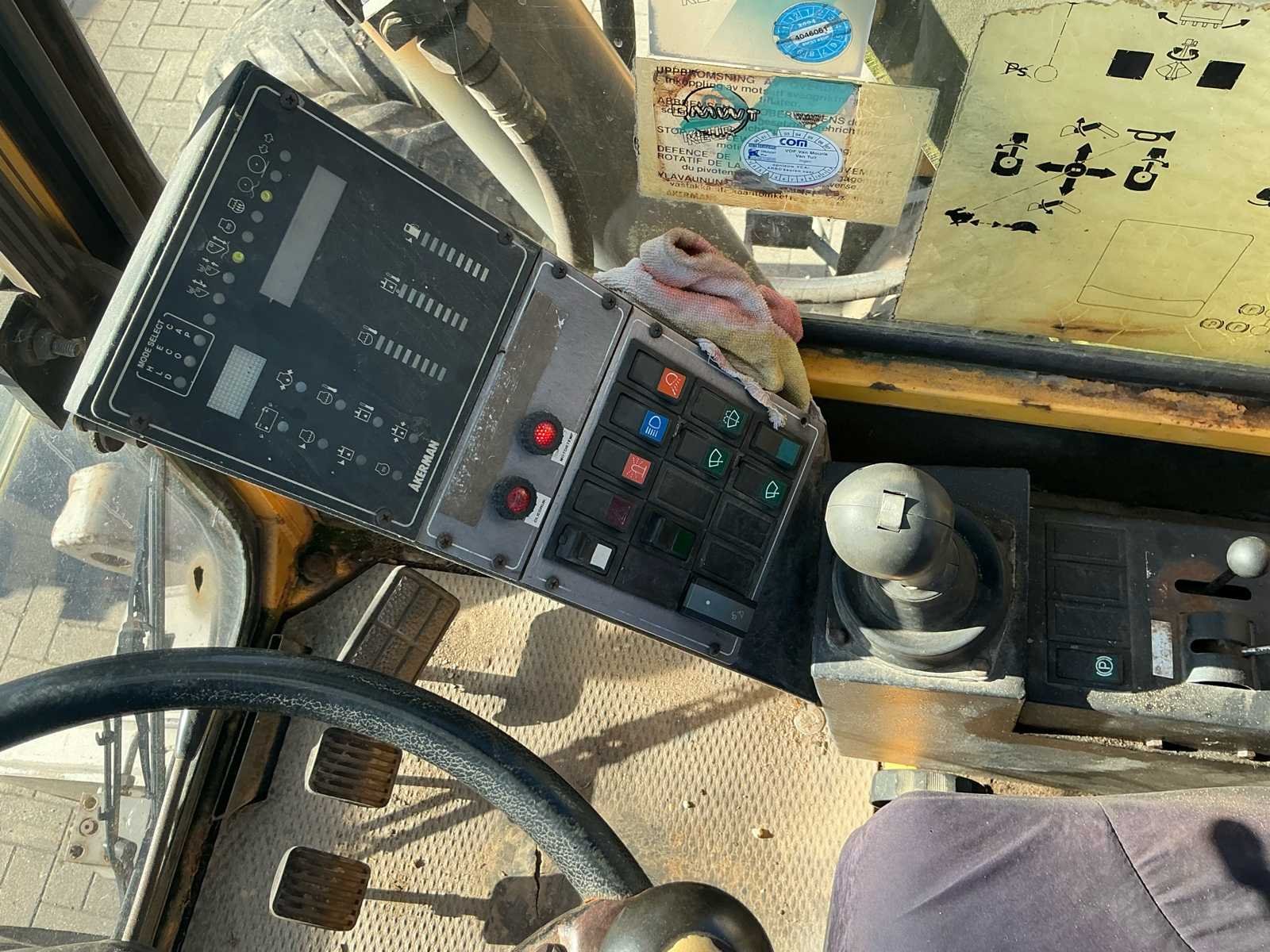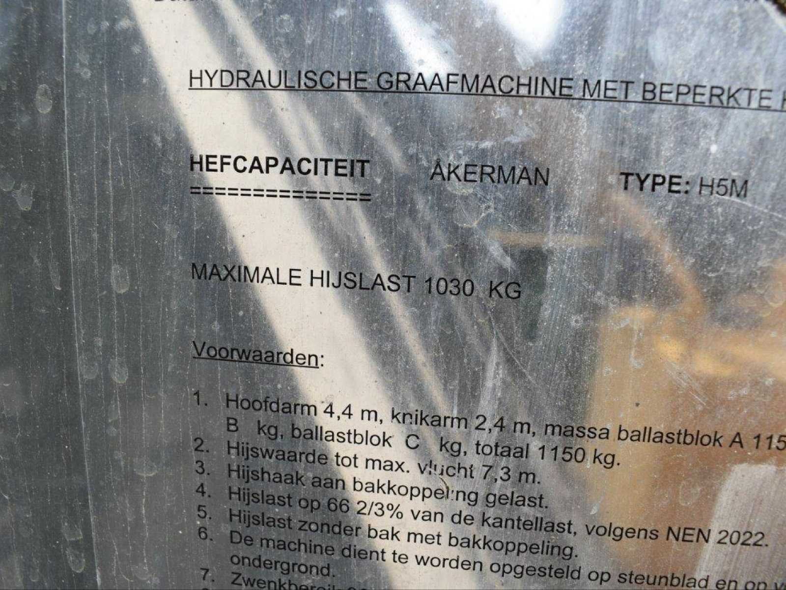 Åkerman H5M mobiele graafmachine – bouwjaar 1992 Hydraulische graafmachine met beperkte hijsfunctie, maximale hijslast 1.030 kg. Uitgerust met 4x4 en voor meer stabiliteit voorzien van dubbele wielen, verstelbare giek (4,4 + 2,4 m), en dieselmotor. Machine compleet met cabine, verlichting en hydraulische aansluitingen. Zie video voor demonstratie. Gewicht ca. 15.500 kg – hefhoogte 7,3 m – type H5M97. No Merk: Akerman Type: H5M Bandenkraan Serienummer: H5M97 Merk motor: Volvo TD 40 Motorvermogen (kW): 88kW Aantal cilinders: 4 Brandstof: Diesel Bedrijfsgewicht: 15500kg Gieklengte: 4400mm Max. werkbereik: 7300mm Cabine: true Afgelezen urenstand: 15891 Eigen gewicht: 14800kg Totale afmeting L: 7200mm Totale afmeting Breedte: 2350mm Totale afmeting Hoogte: 3000mm