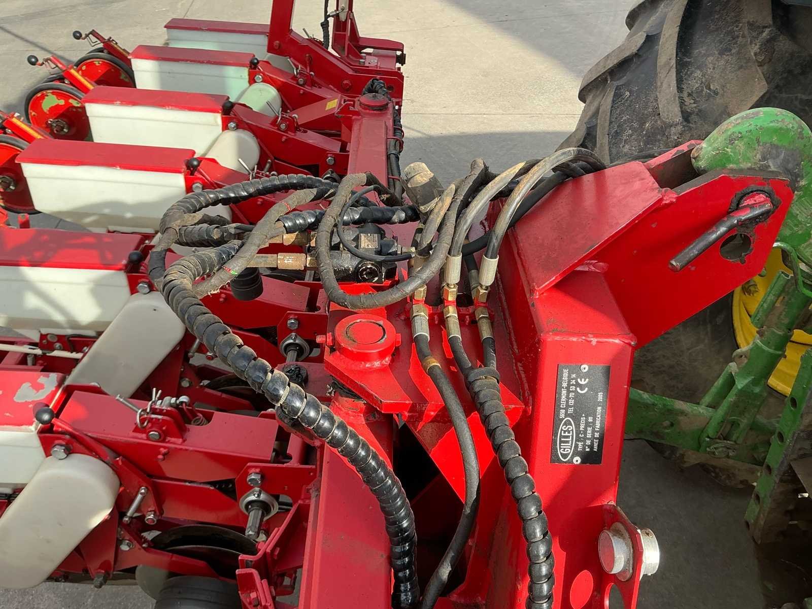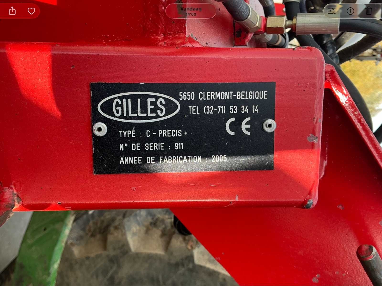 Rijafstand: 45 tot 75 cm instelbaar Aandrijving: Hydraulisch of mechanisch via tractor PTO Gewicht: ± 700–1200 kg afhankelijk van configuratie Gebruik: Zaaien van maïs, bieten, zonnebloemen of andere korrelgewassen. No Merk: Gilles Type: C-Precis+ Bouwjaar: 2005 Serienummer: 911 Werkbreedte: 6000mm Aantal rijen: 12