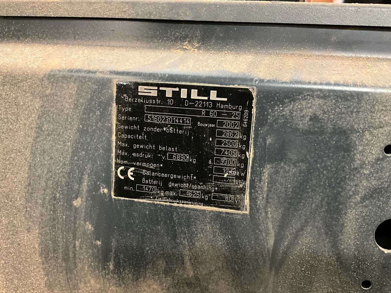 No Merk: STILL Type: R60-25 Bouwjaar: 2002 Serienummer: 516023014414 Brandstof: Elektronisch Aantal wielen: 4 Accu lader: true Eigen gewicht: 2862kg Luchtbanden: true