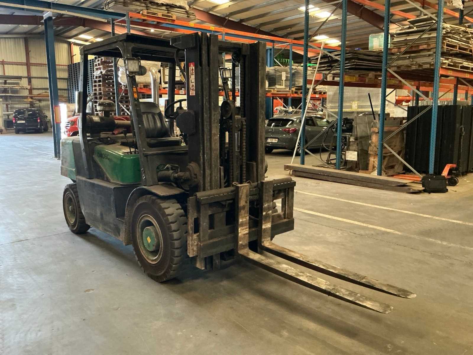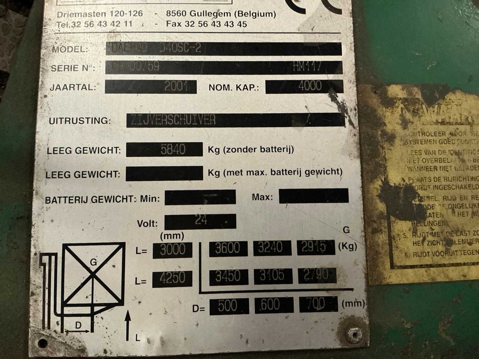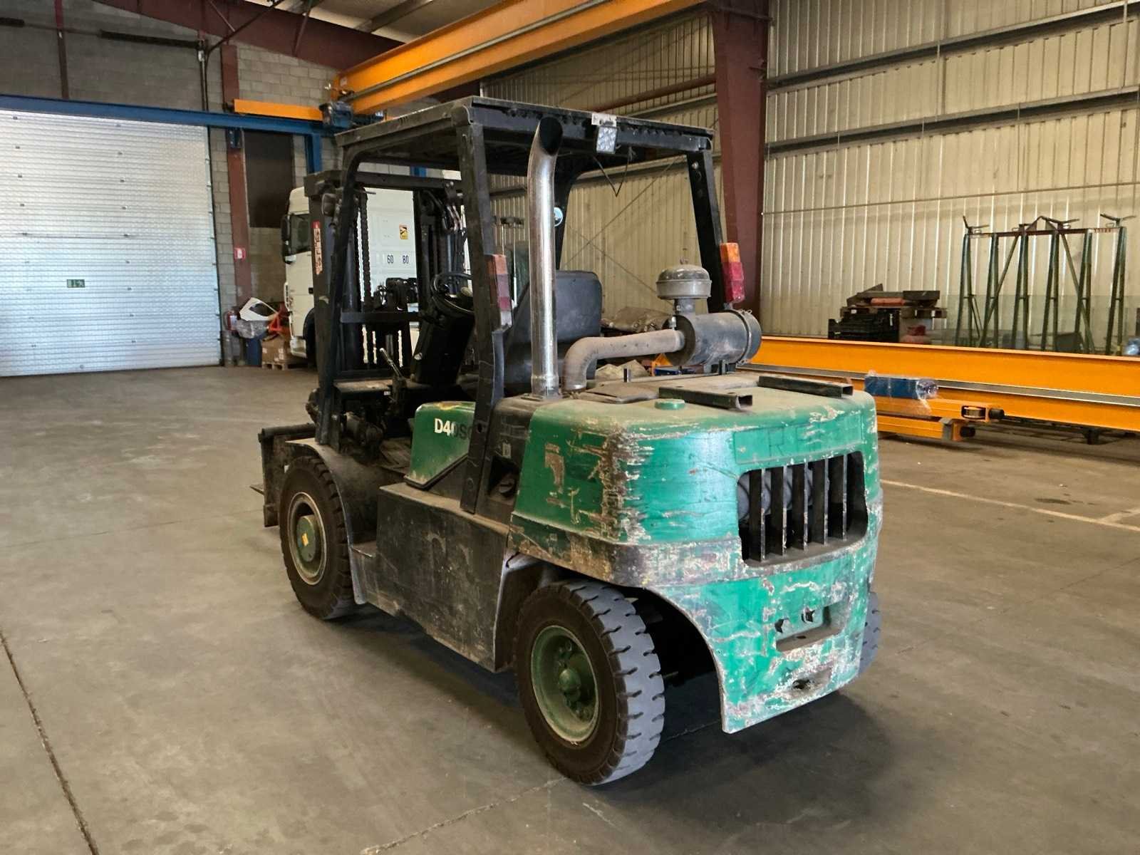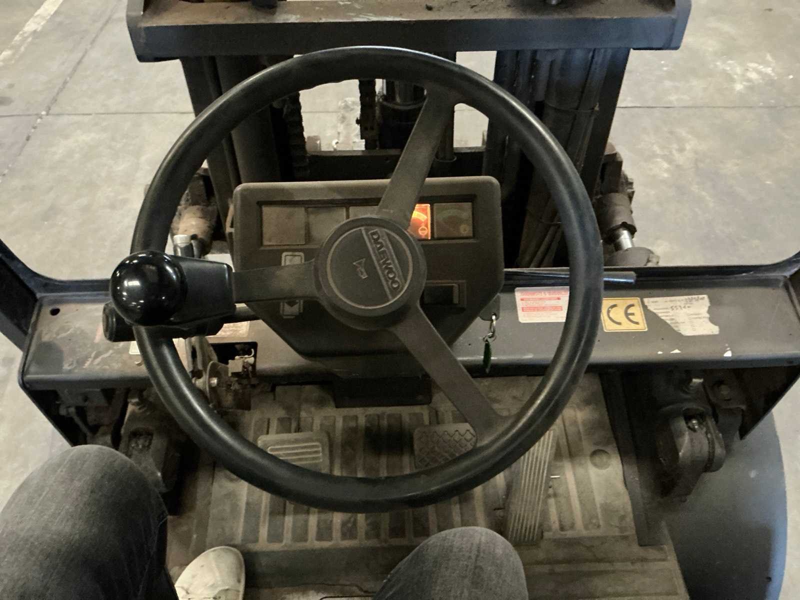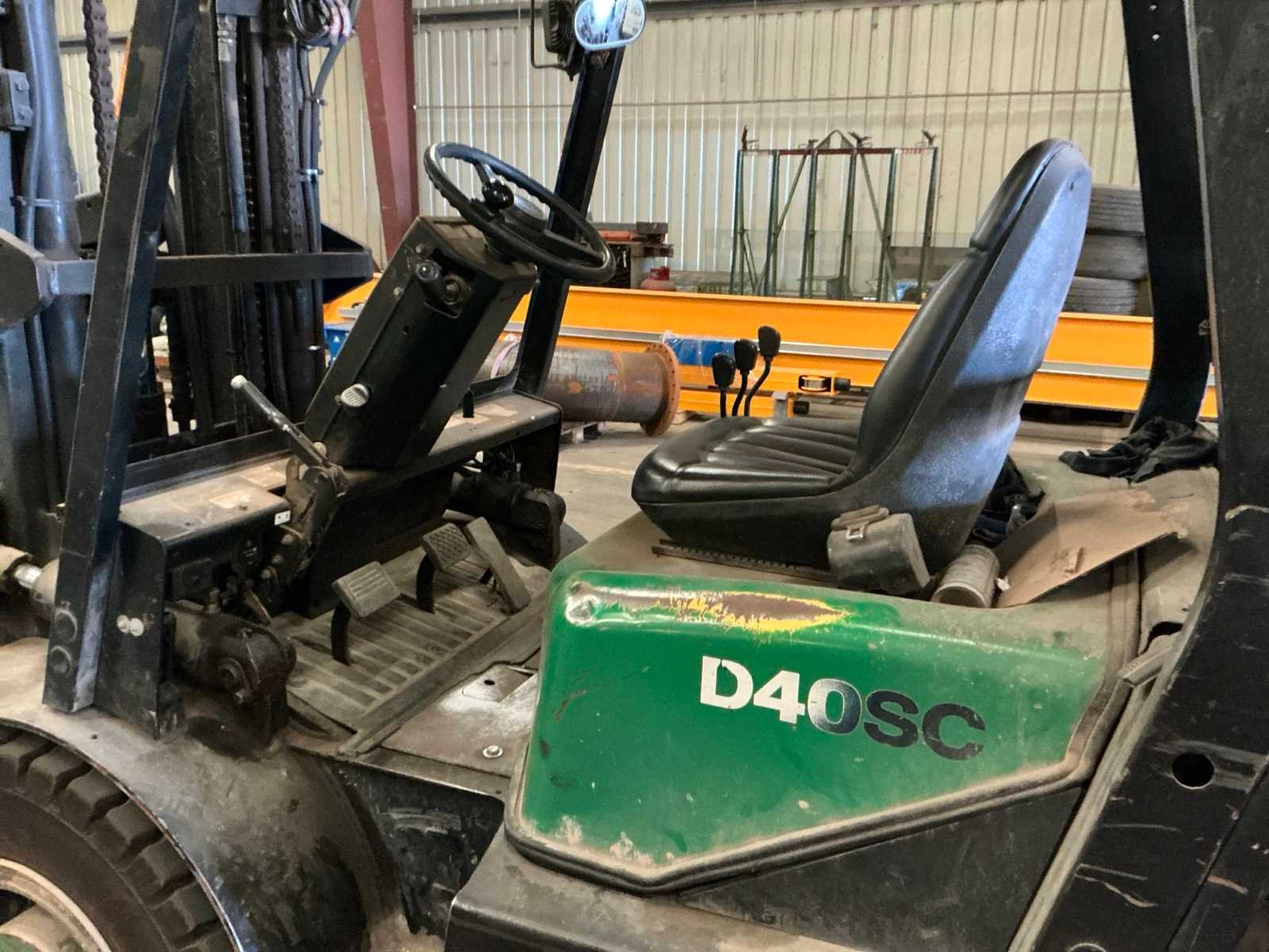 Olielek. Voorwaartse versnelling reageert traag. In werkende staat. Voorzien van zijverschuiver. Nee Merk: Daewoo Type: D40SC-2 Bouwjaar: 2001 Brandstof: Diesel Mast: Triple Soort band: Volrubber banden Afgelezen urenstand: 10730 Triple mast: true Eigen gewicht: 5840kg Hefvermogen: 4000kg Max. hefhoogte: 4250mm Vol rubber banden: true Diesel: true