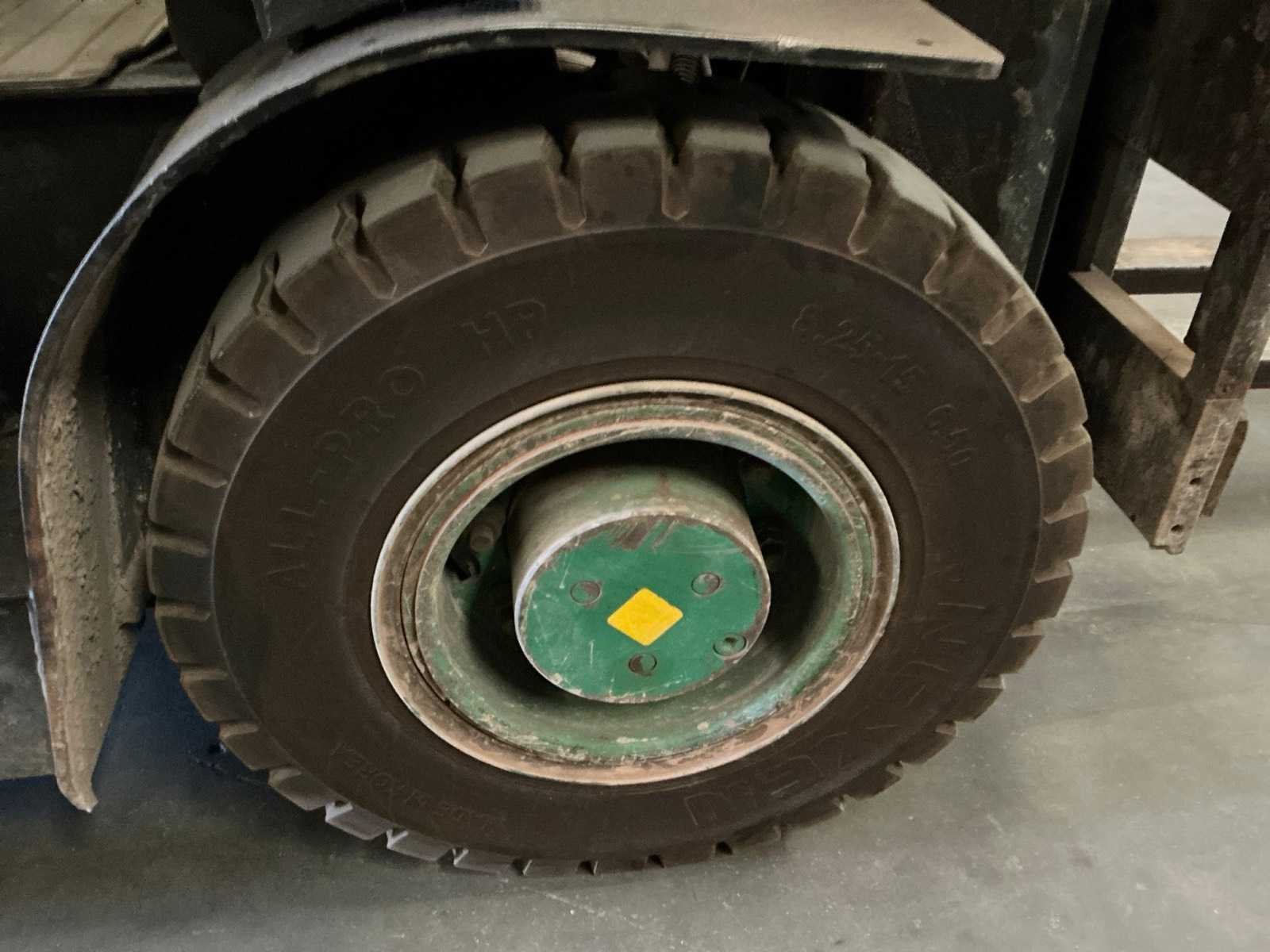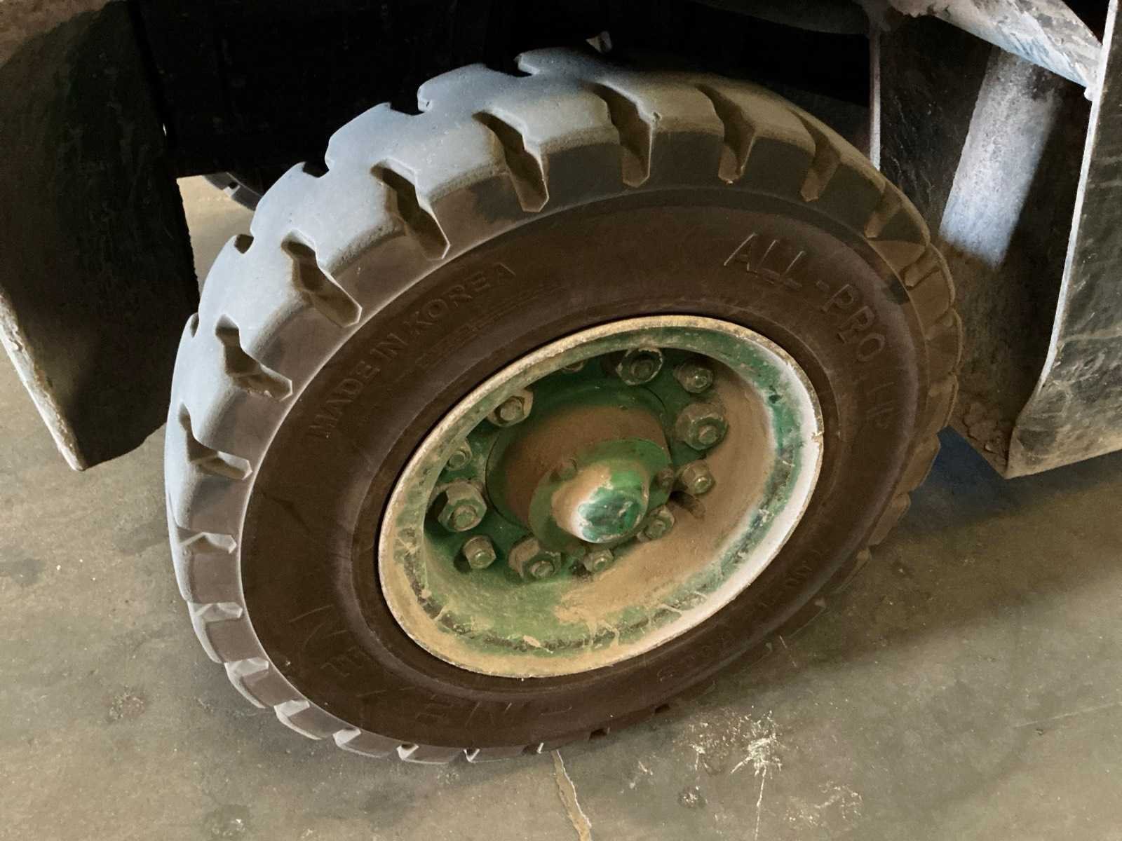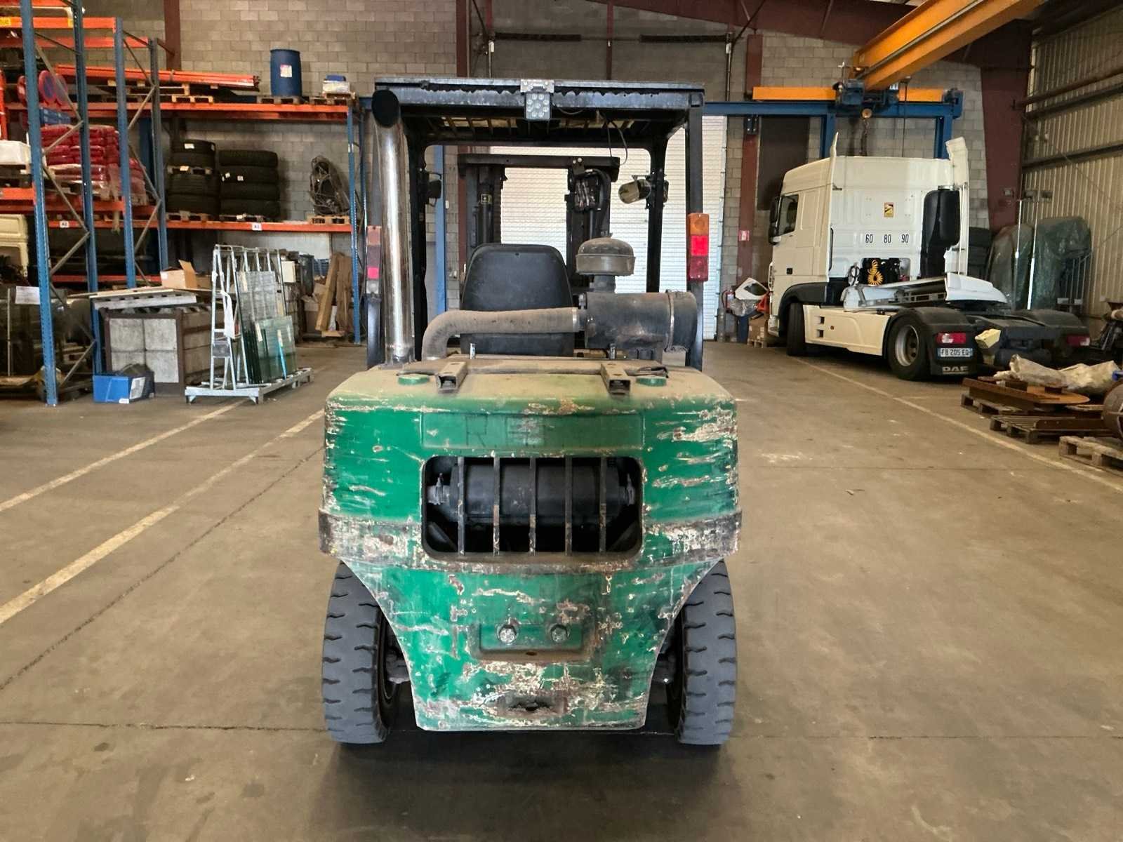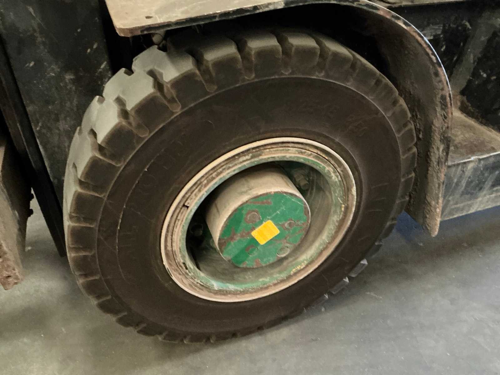 Olielek. Voorwaartse versnelling reageert traag. In werkende staat. Voorzien van zijverschuiver. Nee Merk: Daewoo Type: D40SC-2 Bouwjaar: 2001 Brandstof: Diesel Mast: Triple Soort band: Volrubber banden Afgelezen urenstand: 10730 Triple mast: true Eigen gewicht: 5840kg Hefvermogen: 4000kg Max. hefhoogte: 4250mm Vol rubber banden: true Diesel: true