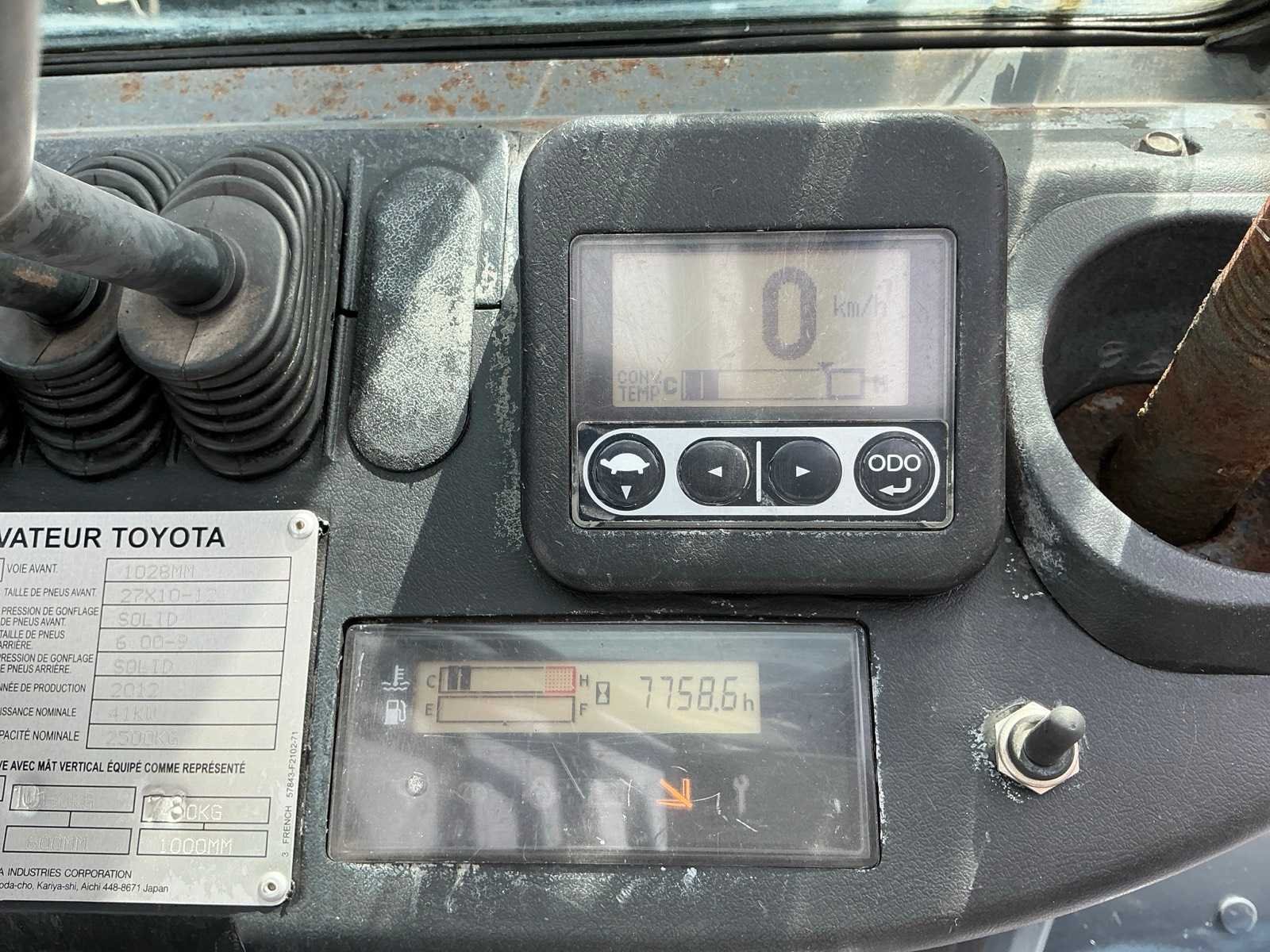 Nee Merk: Toyota Type: 02-8FDF25 Bouwjaar: 2012 Brandstof: Diesel Mast: Triple Soort band: Volrubber banden Aantal wielen: 4 Afgelezen urenstand: 7760 Side-shift: true Hydraulisch verstelbare lepels: true Triple mast: true Hefvermogen: 2500kg Lepellengte: 1200mm Vol rubber banden: true Minimale doorrijhoogte: 2600mm Diesel: true