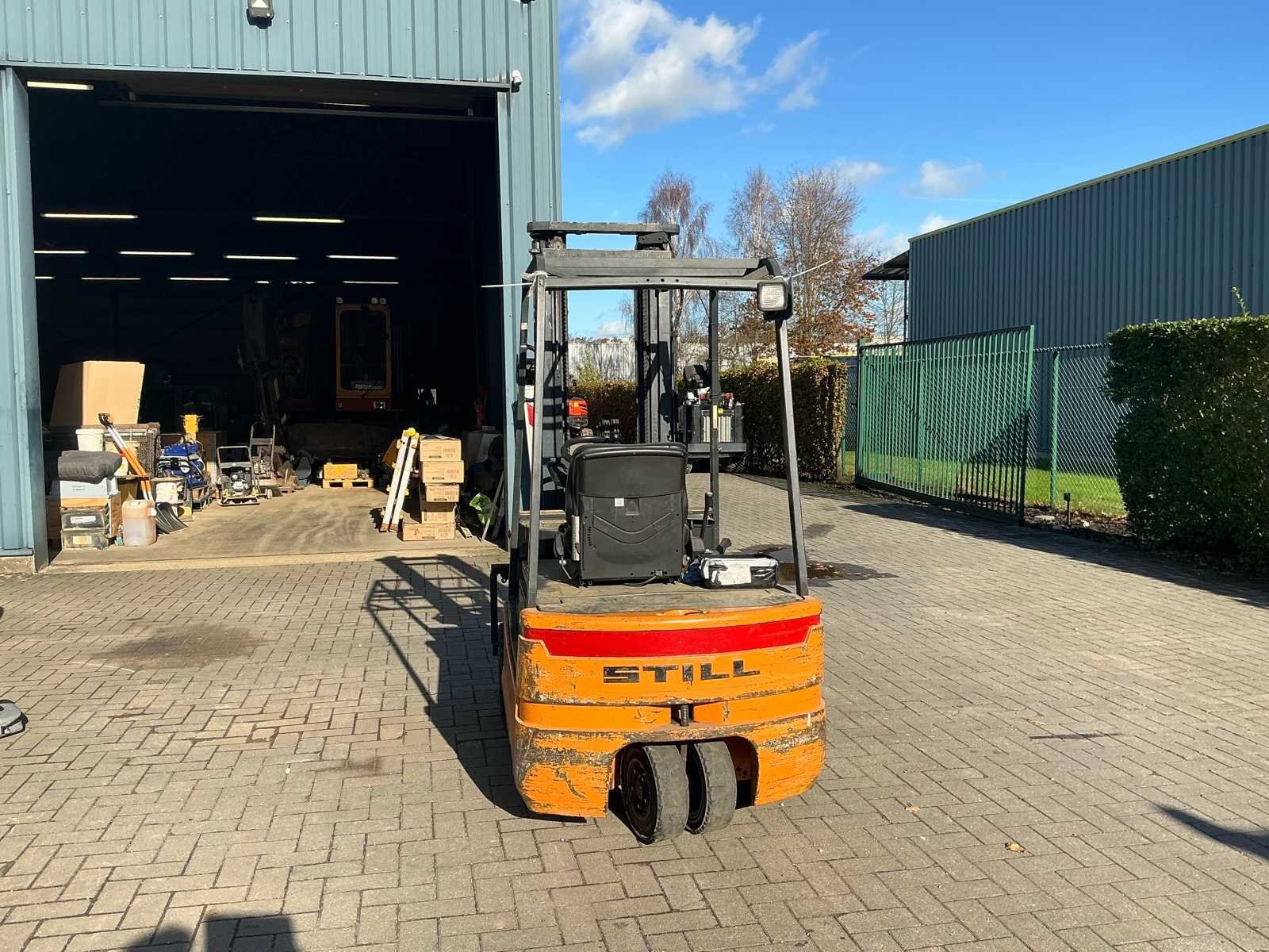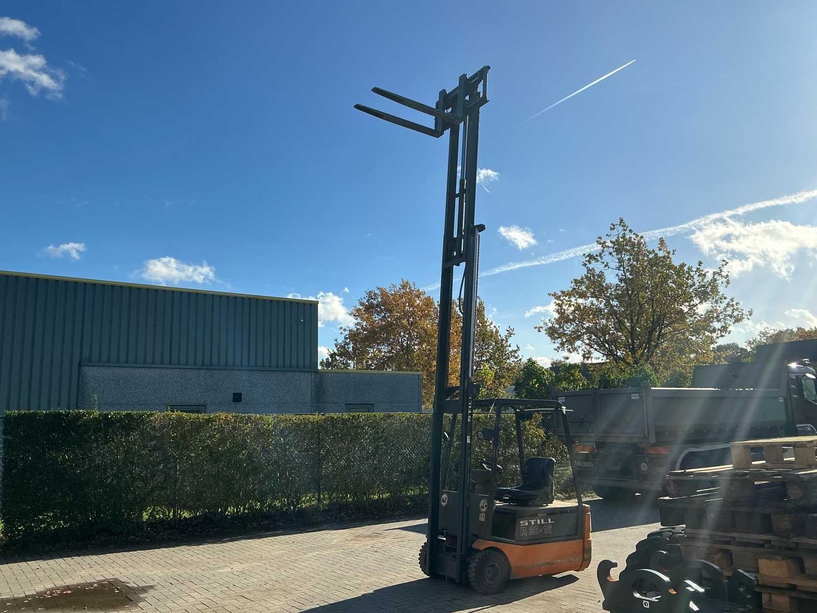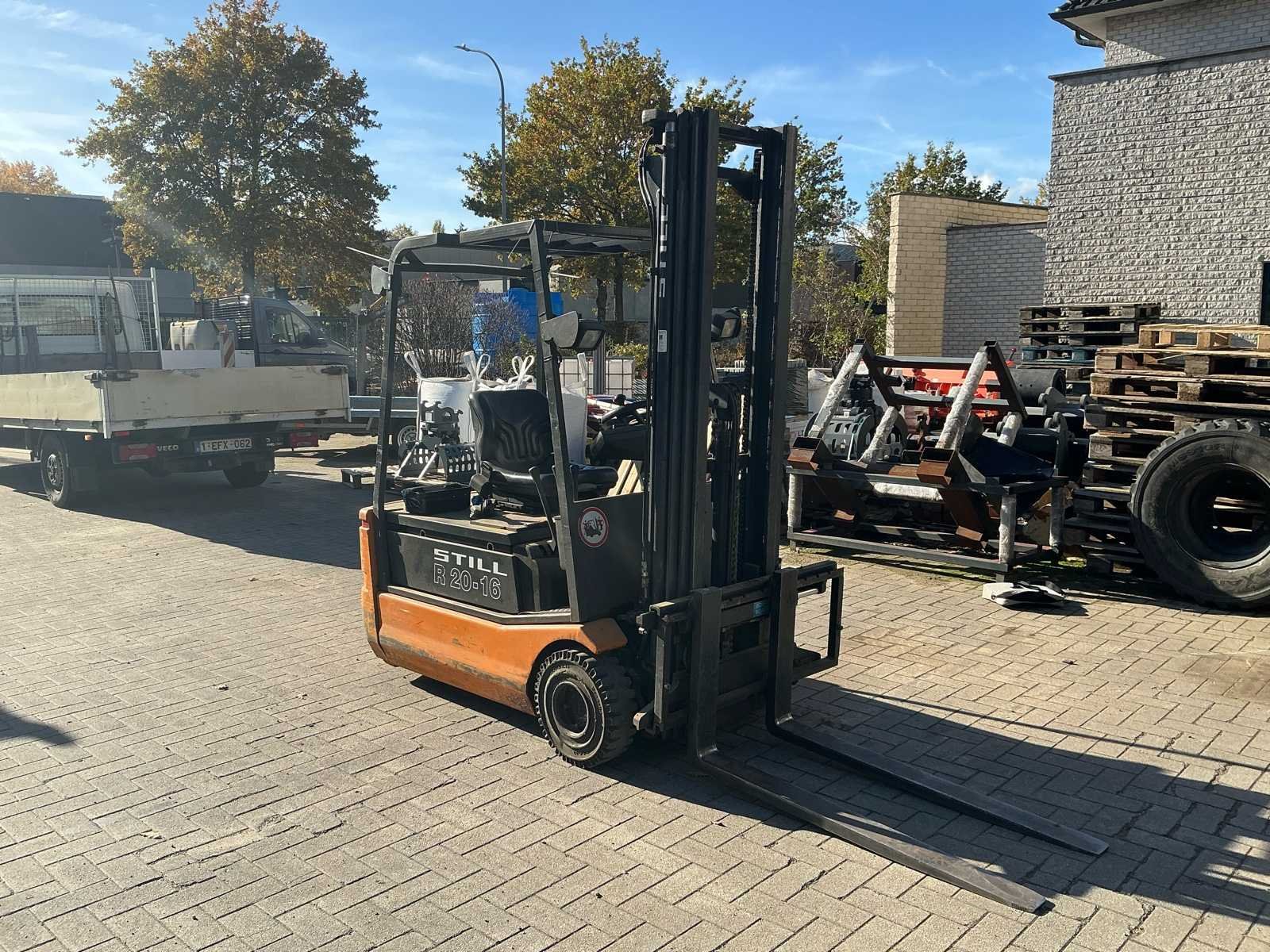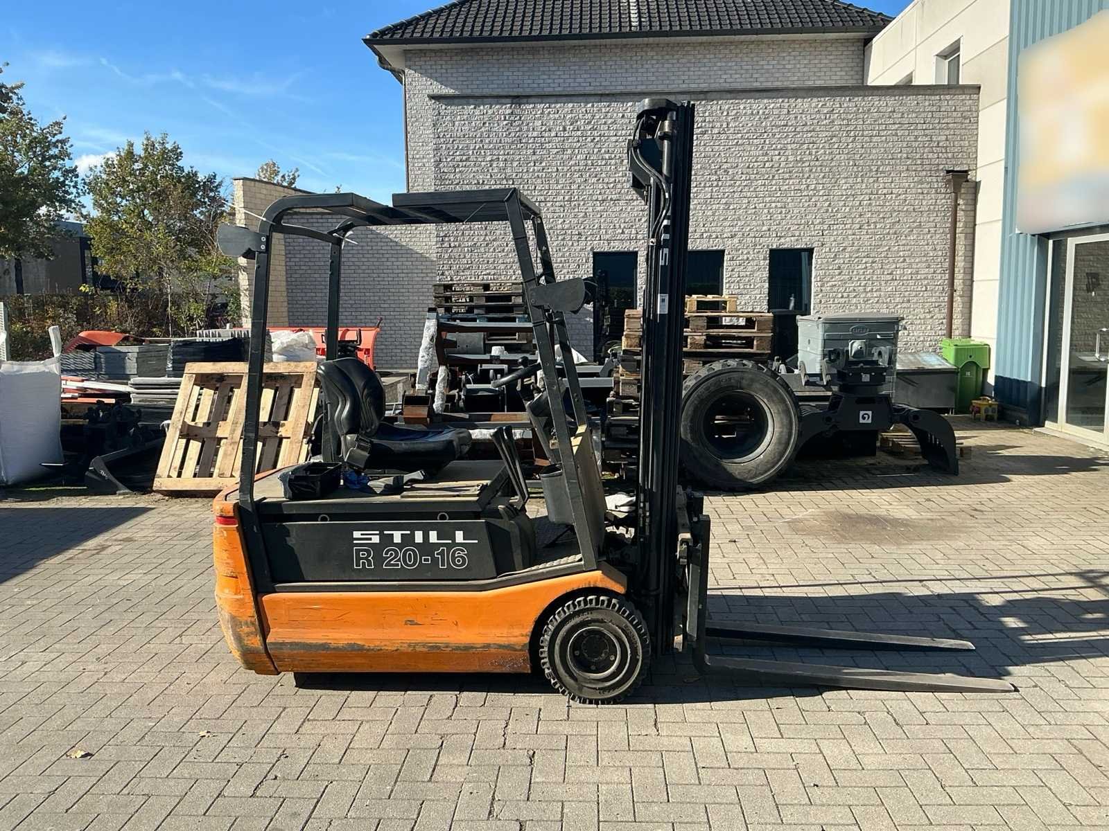 STILL R20-16 elektrische heftruck met lader, hefhoogte 5,2 m en hefcapaciteit 1.600 kg. Compact driewielmodel met elektrische aandrijving, geschikt voor magazijn- en binnengebruik. De truck heeft een goed zichtbare mast en vorken van ca. 1,2 m. Restcapaciteit 1.495 kg bij 5,2 m hefhoogte. Start en rijdt zoals het hoort. Geeft storing 101 (sensor handrem). No Merk: STILL Type: R20-16 Brandstof: Elektrisch Mast: Triplex mast Soort band: Anti-lek (volle band) Aantal wielen: 3 Afgelezen urenstand: 16922 Accu lader: true Side-shift: true Duplex mast: true Triple mast: true Eigen gewicht: 3300kg Hefvermogen: 1600kg Max. hefhoogte: 5200mm Vol rubber banden: true Totale afmeting L: 1990mm Totale afmeting Breedte: 1090mm Totale afmeting Hoogte: 2200mm