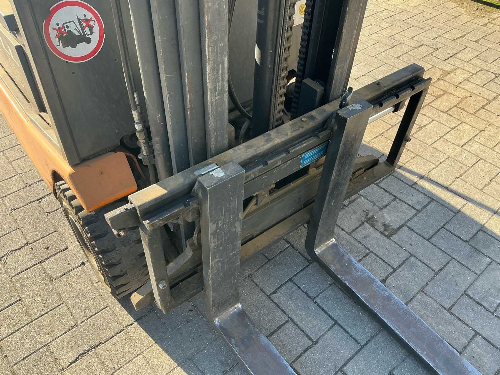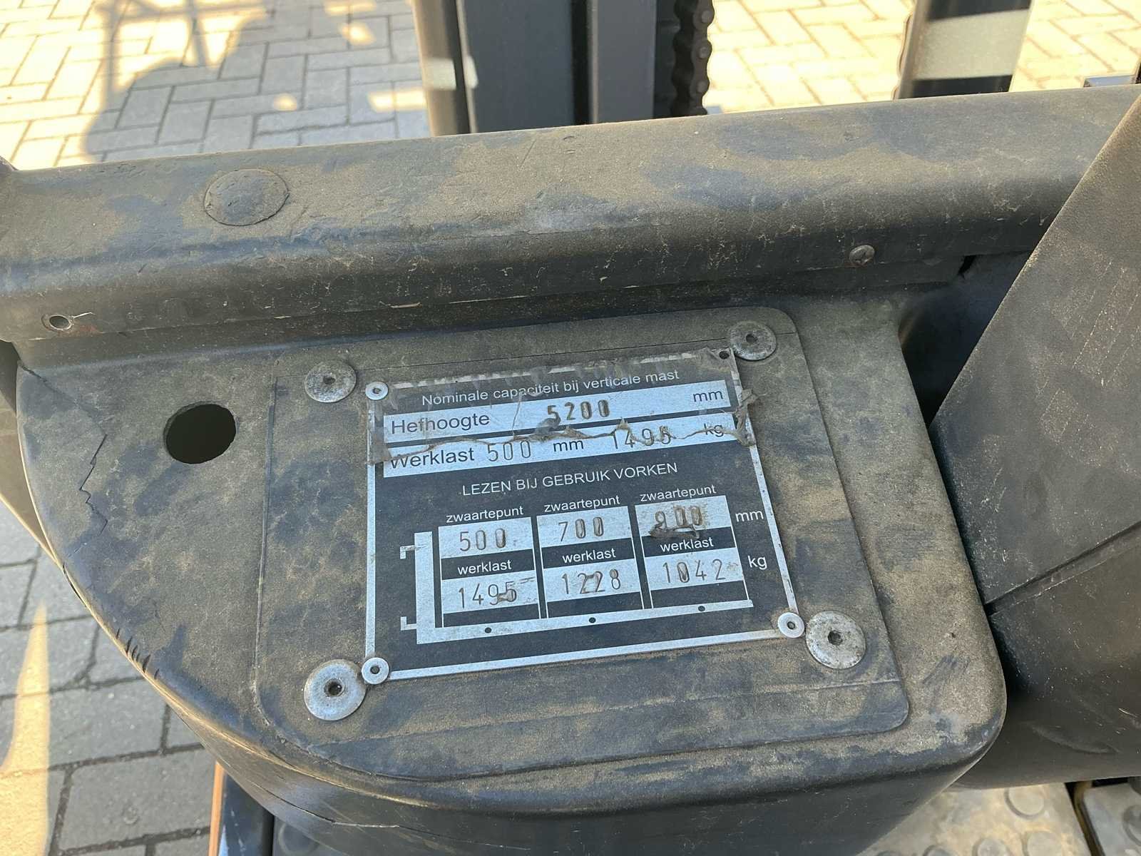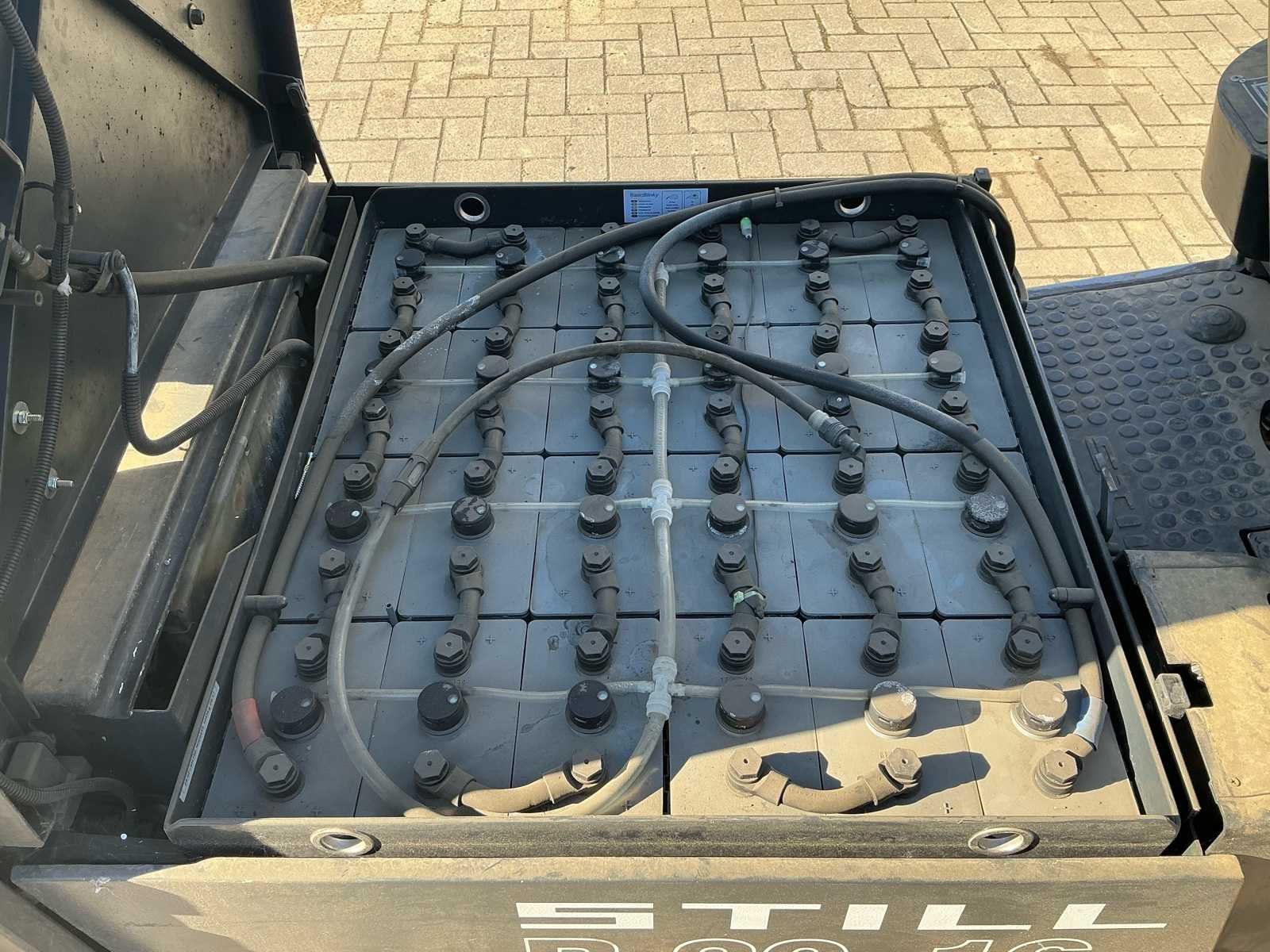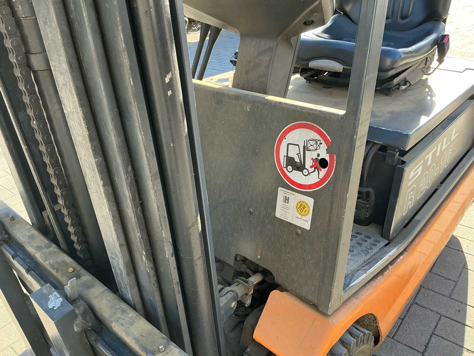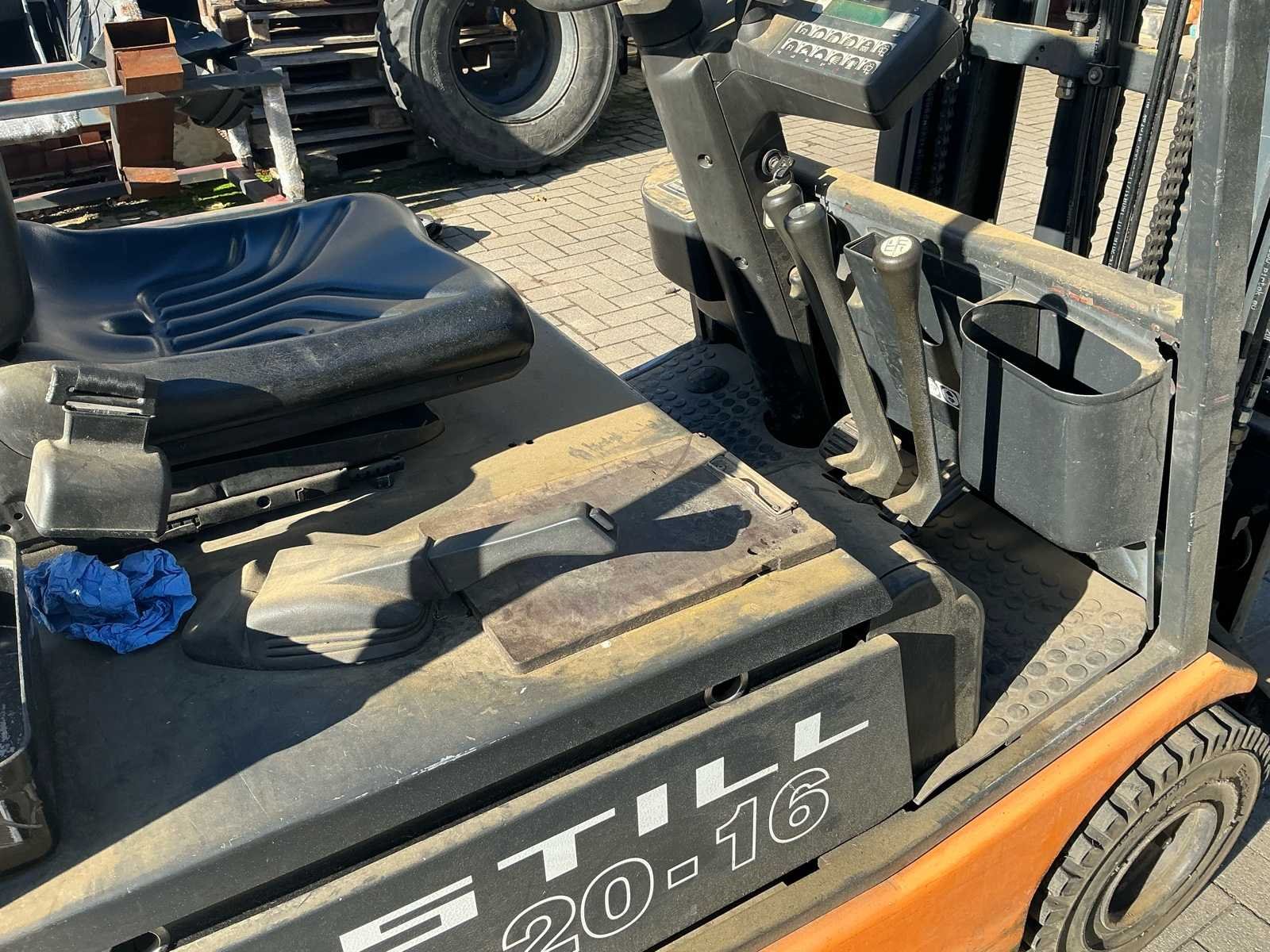 STILL R20-16 elektrische heftruck met lader, hefhoogte 5,2 m en hefcapaciteit 1.600 kg. Compact driewielmodel met elektrische aandrijving, geschikt voor magazijn- en binnengebruik. De truck heeft een goed zichtbare mast en vorken van ca. 1,2 m. Restcapaciteit 1.495 kg bij 5,2 m hefhoogte. Start en rijdt zoals het hoort. Geeft storing 101 (sensor handrem). No Merk: STILL Type: R20-16 Brandstof: Elektrisch Mast: Triplex mast Soort band: Anti-lek (volle band) Aantal wielen: 3 Afgelezen urenstand: 16922 Accu lader: true Side-shift: true Duplex mast: true Triple mast: true Eigen gewicht: 3300kg Hefvermogen: 1600kg Max. hefhoogte: 5200mm Vol rubber banden: true Totale afmeting L: 1990mm Totale afmeting Breedte: 1090mm Totale afmeting Hoogte: 2200mm
