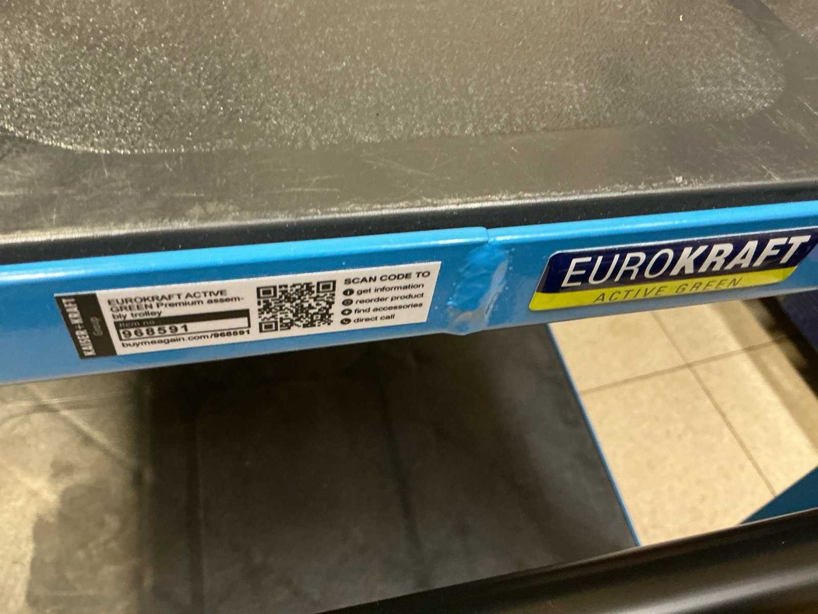 Eurokraft montagewagens 4 stuks met elk 2 laadvlakken in Nieuwstaat. Zie bijgevoegde foto’s.. Laadvermogen van 500 kg (Afm. B. 1050 mm x 700mm, H. 90cm.)Volle rubberen wieltjes met rem. Standaard verstevingsbalk voor elk laadvlak. No Bestaande uit: 4 montagewagens