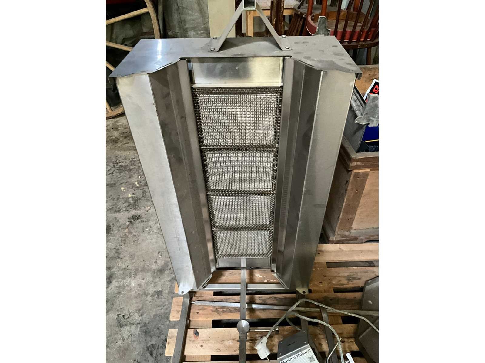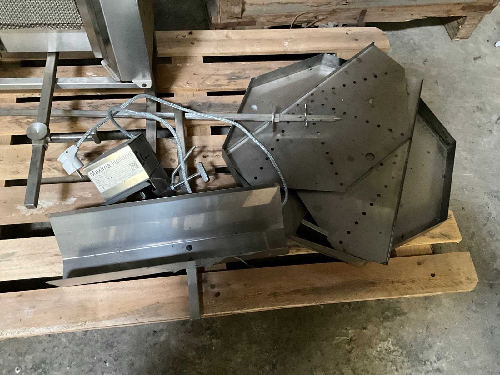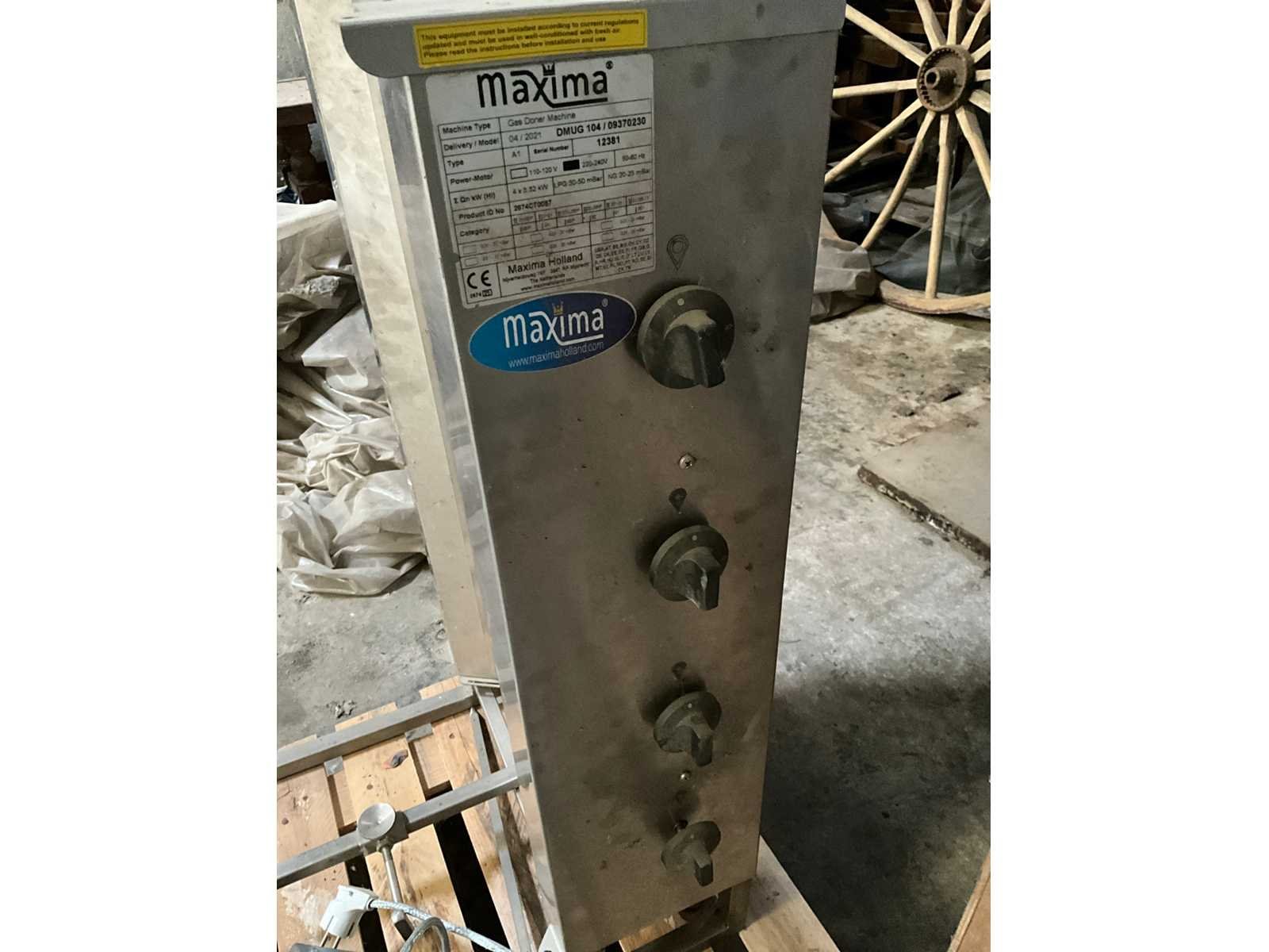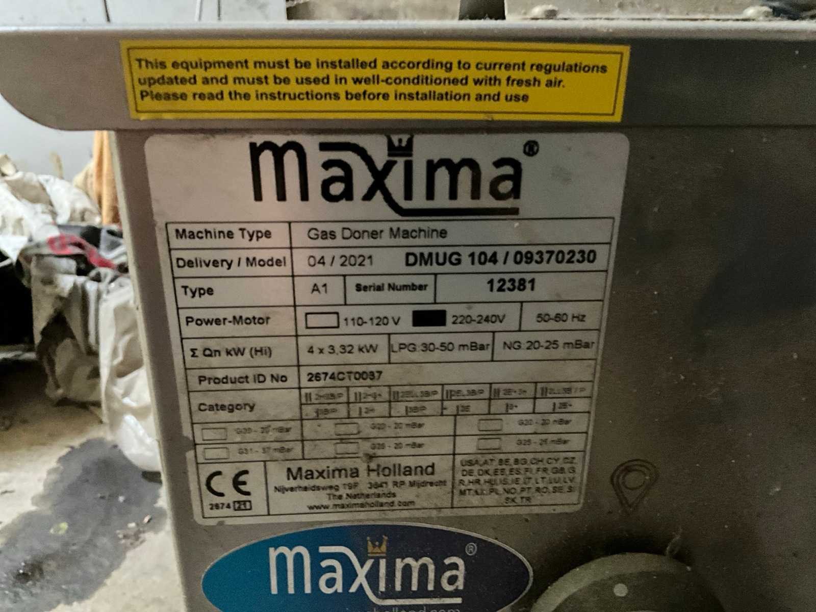 Professioneel gasgestookt dönerapparaat van Maxima Holland, type DMUG 104 - Het toestel is ongebruikt, volledig compleet en gebruiksklaar - Ideaal voor het bereiden van döner, shoarma, kebab of gyros in horeca, foodtrucks of snackbars. Solide roestvrijstalen constructie, met krachtige branders en elektrische motor voor gelijkmatige rotatie - Totaal vermogen branders: 4 × 3,32 kW = 13,28 kW Aansluiting: Gasaansluiting + 230V voor motor - Afmetingen en gewicht (indicatief): Breedte: ca. 580 mm Diepte: ca. 600 mm Hoogte: ca. 950 mm Gewicht: ± 25 kg Nee Merk: Maxima Holland Type: DMUG 104 Bouwjaar: 2021