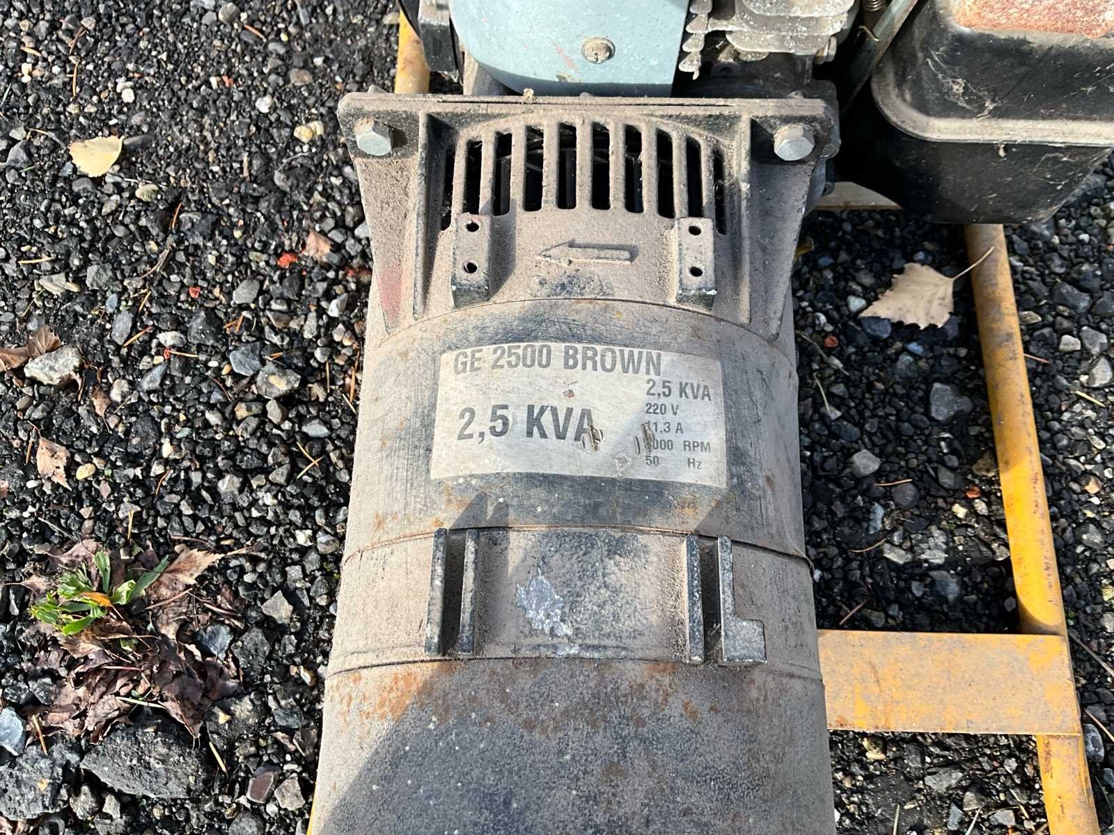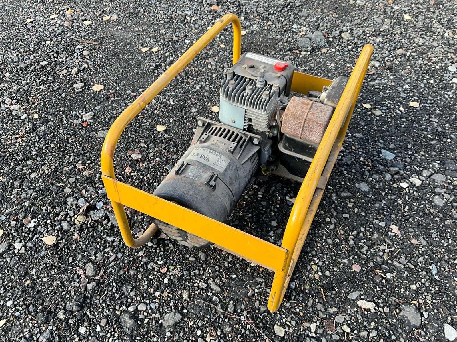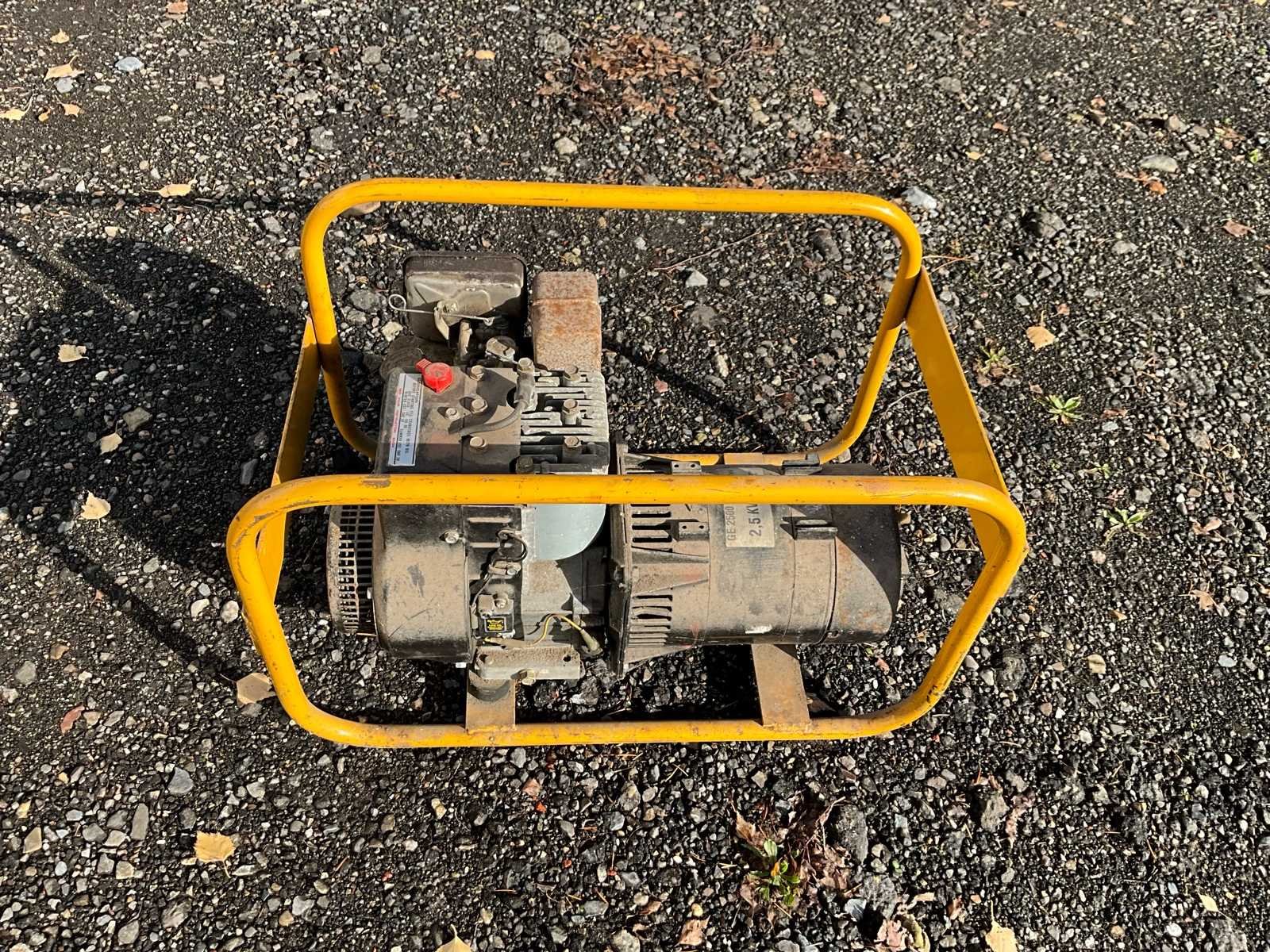 Degelijke draagbare benzinegenerator, aangedreven door een betrouwbare Kawasaki FA210D motor (5 pk), gekoppeld aan een GE Brown 2500 generatorunit van 2,5 kVA. Uitgevoerd in een stevig geel metalen draagframe, gemakkelijk te verplaatsen en geschikt voor gebruik op bouwplaats, werkplaats of als noodstroomvoorziening. De generator levert 220 Volt / 50 Hz en is voorzien van een robuuste Japanse industriële motor met ACR (Automatic Compression Release) voor eenvoudig starten. Opgelet: Niet getest, wel werkend weggezet (staat al geruime tijd stil). steeds droog opgeslagen No Merk: Kawasaki FA210D benzinegenerator – 2,5 kVA – GE 2500 Brown Capaciteit.: 3kVA Benzine: true Motorvermogen (kW): 4kW Mobiel: true Machinegewicht: 40kg Totale afmeting L: 60mm Totale afmeting Breedte: 40mm Totale afmeting Hoogte: 45mm