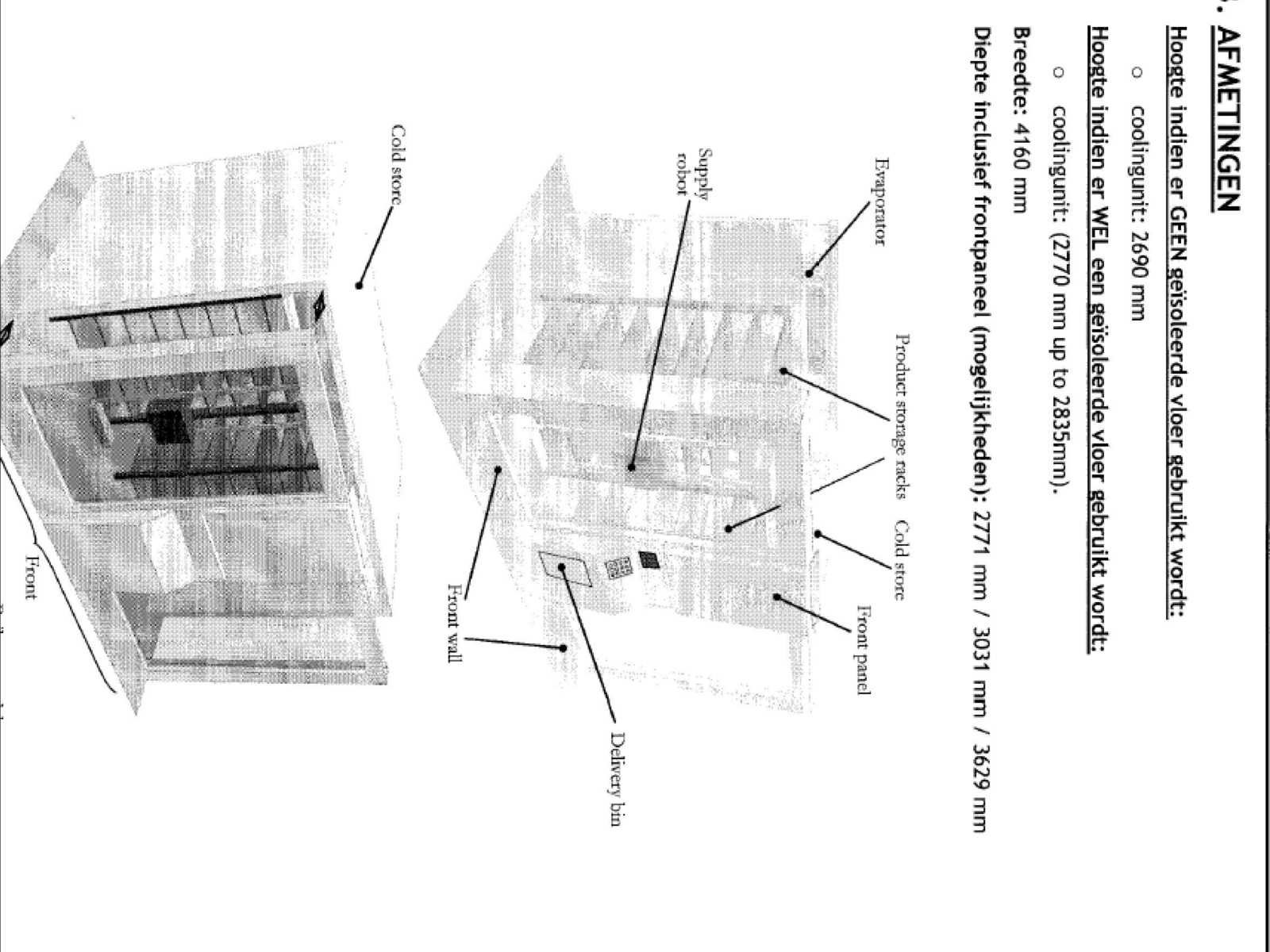 Dient vakkundig gedemonteerd te worden door de koper zowel koeling als automaat. No Merk: Release III Lengte: 416cm Breedte: 363cm Hoogte: 270cm