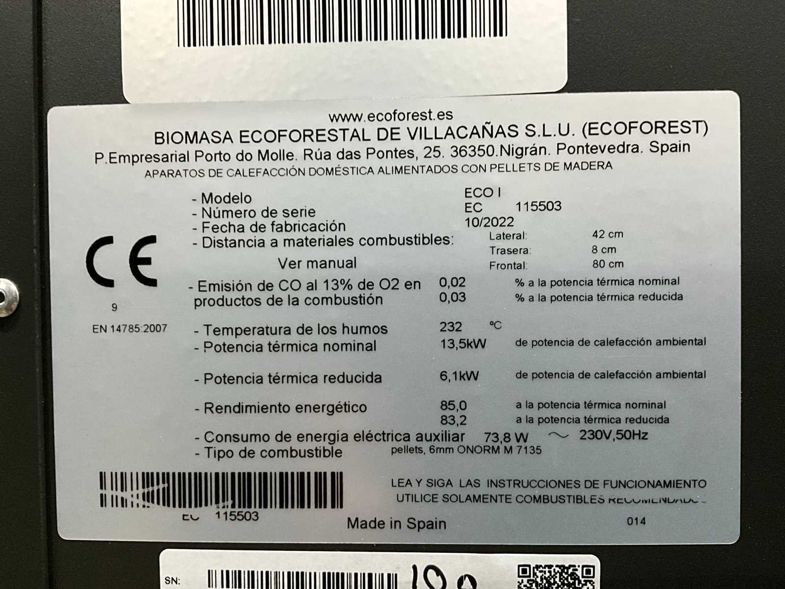 Nieuw model (eindereeks) Kanaliseerbare kachel met kanalisatie 2x 120mm (max. 7m) - achteraansluiting Kleur zwart Energieklasse A+ No Merk: ECOFOREST Type: Eco I Eigen gewicht: 105kg Vrijstaand: true Vermogen: 13,5kW Totale afmeting lxbxh: 584x642x838mm Rookgasaansluiting: 80mm Achteraansluiting: true Lengte: 584 Rendement: 85% Breedte: 642 Hoogte: 838