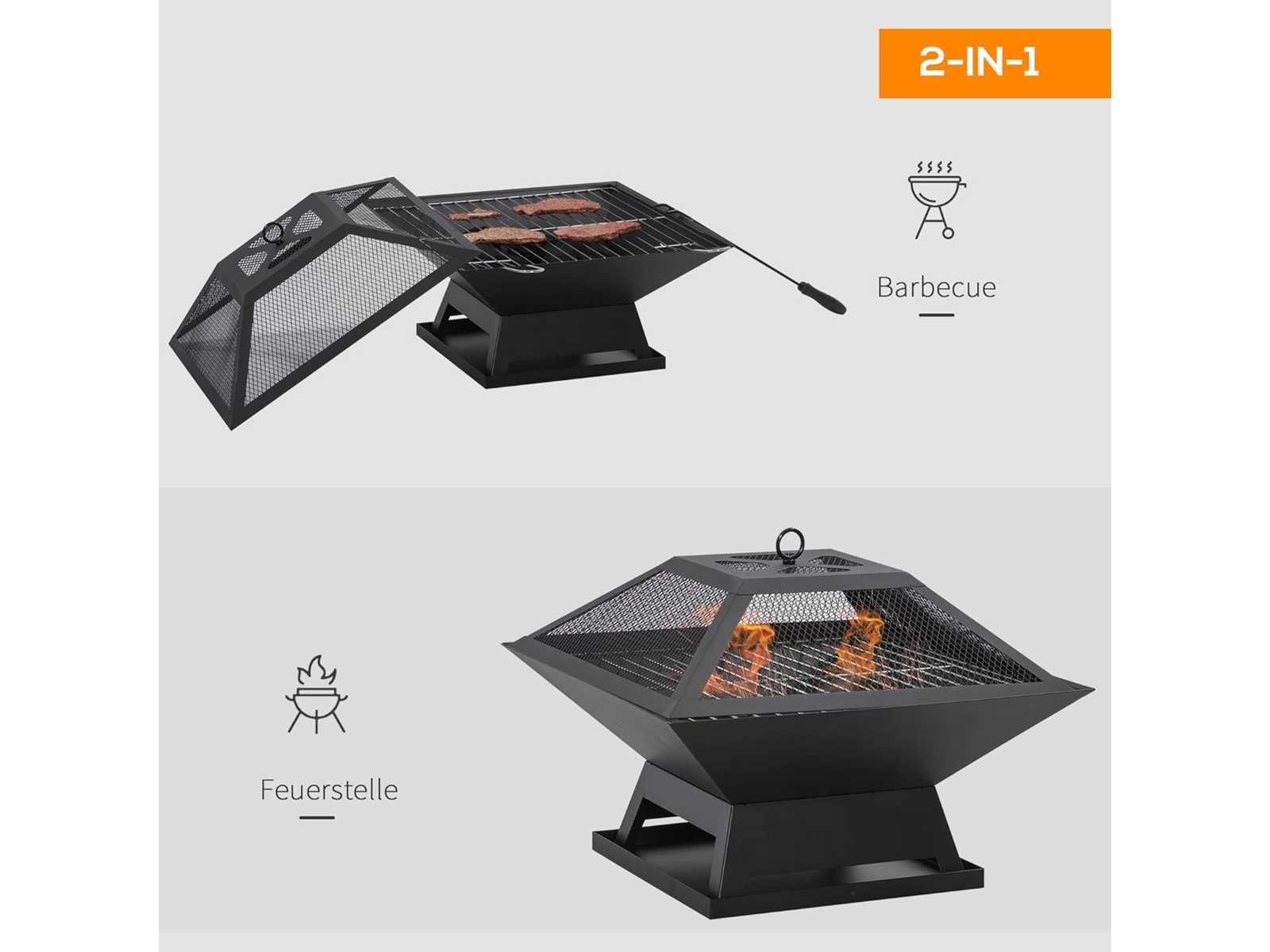 2-in-1 ontwerp: kan worden gebruikt voor verwarmen of grillen Compact en draagbaar, geschikt voor kamperen, picknicks, enz Plaats tijdens het barbecueën het grillrooster en giet houtskool in de put Gemaakt van staal met hittebestendige verf Roosterdeksel zorgt voor brandbeveiliging en voorkomt dat vonken wegvliegen Met de meegeleverde pook verplaats je het brandbare materiaal veilig Gezondheid BBQ net beschikbaar Montage vereist Materiaal: Staal Kleur: Zwart Totale afmetingen: 45L x 45B x 34H cm Afmetingen van de vuurpot: 45L x 45B x 12H cm Afmetingen van de gaasafdekking 44L x 44B x 11H cm Afmetingen pook: 42L x 4B cm Non