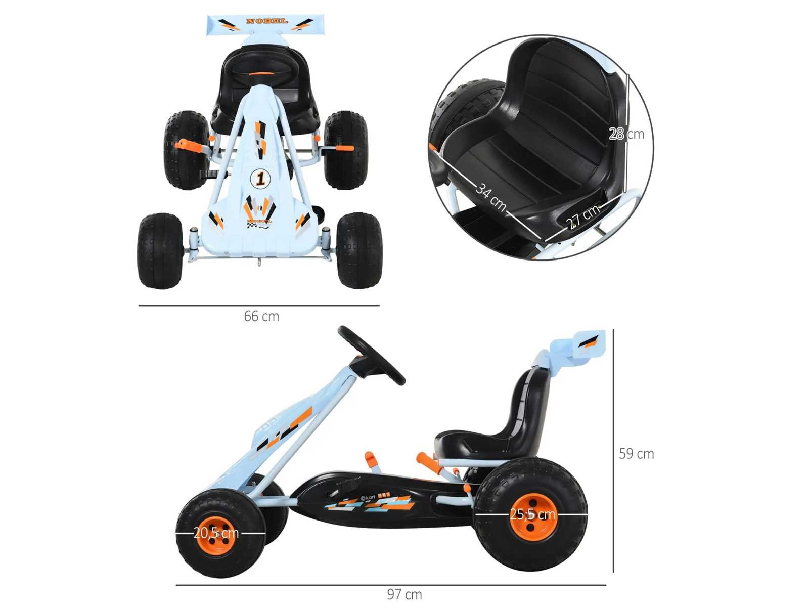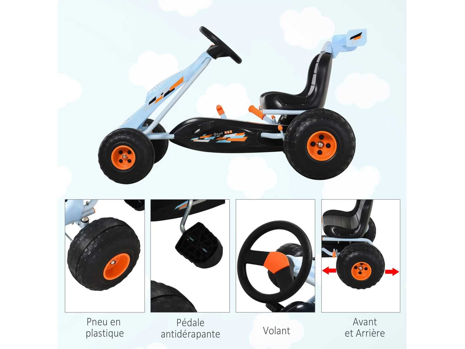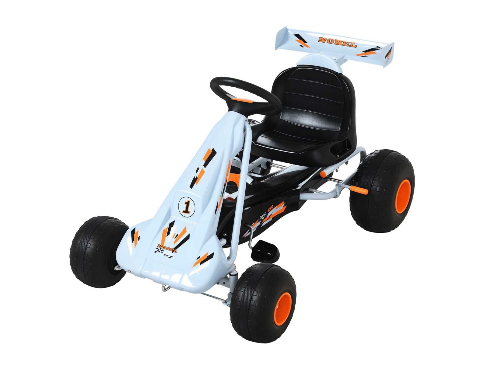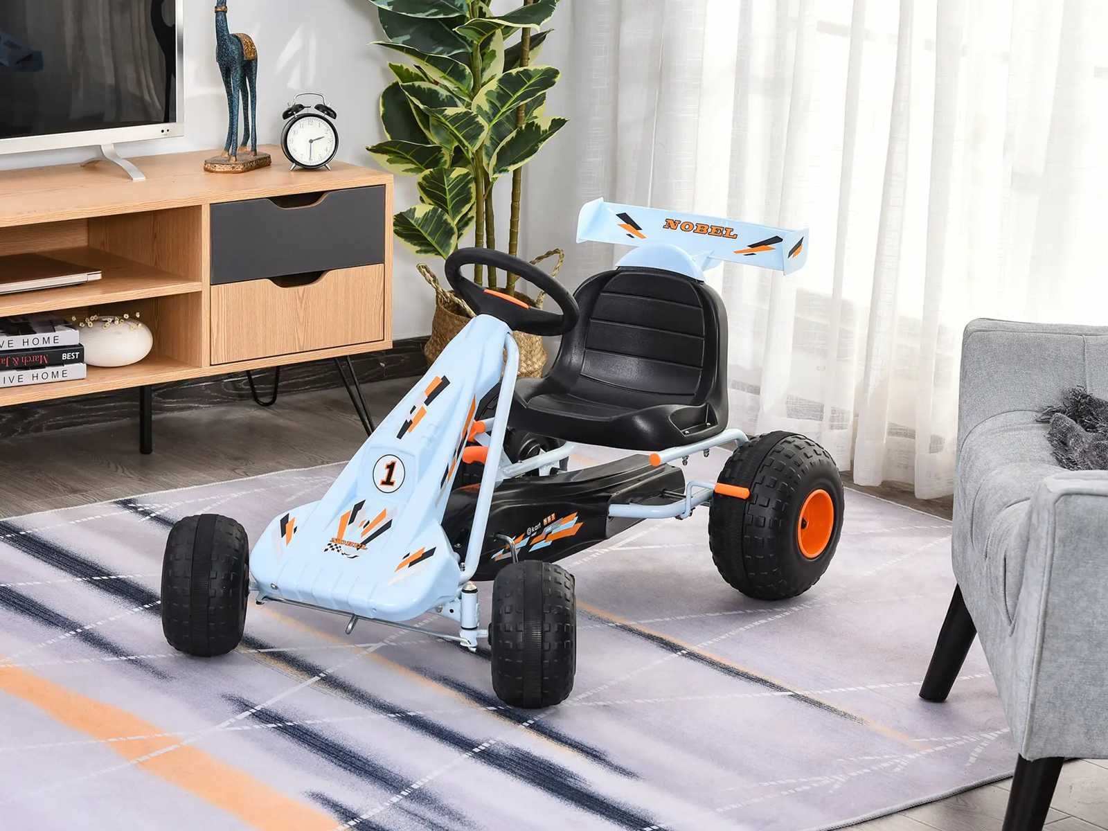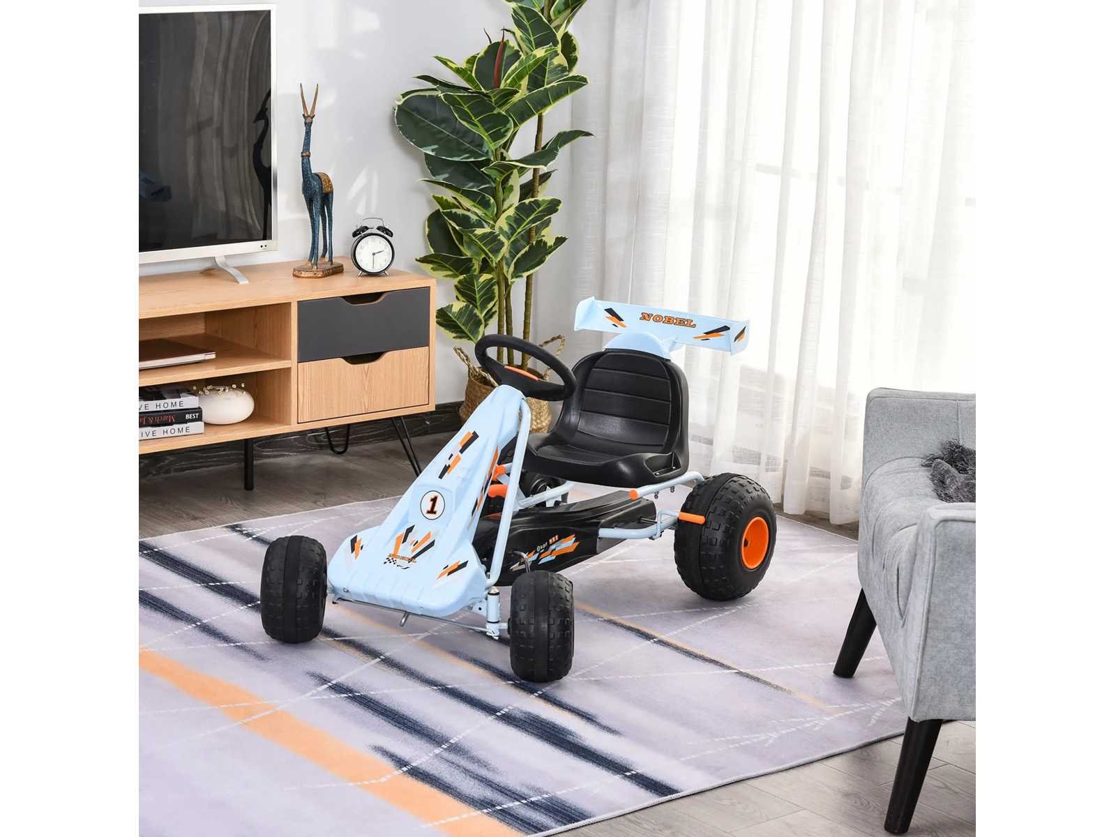 Kenmerken: - Gokart Formula 1 Racing skelter met hemelsblauwe spoiler · Geschikt voor kinderen vanaf 3 jaar (max. aanbevolen belasting: 35 kg) · Wendbare skelter met achteruit mogelijk (versnellingspook inbegrepen) · Robuust corrosiebestendig epoxy metalen buischassis · Gesloten kettingkast · Ergonomische zitting, antislippedalen voor gebruikscomfort en optimale veiligheid · 4 duurzame kunststof wielen zorgen voor een stille en gemakkelijke rit (grotere achterwielen zorgen voor meer grip en stabiliteit) · OPMERKING: Gebruik met beschermende uitrusting van de straat en onder toezicht van een volwassene Specificaties: - Hoofdkleuren: hemelsblauw, oranje · Belangrijkste materialen: metaal, plastic · Totale afmetingen: 97L x 66B x 59H cm · Afmetingen zitting: 34L x 27B x 28H cm · Ø voorwielen: 20,5 cm · Ø achterwielen: 25,5 cm · Geschikt voor kinderen vanaf 3 jaar · Aanbevolen maximale belasting: 35 Kg · Certificeringen normen EN71-1-2-3 Non