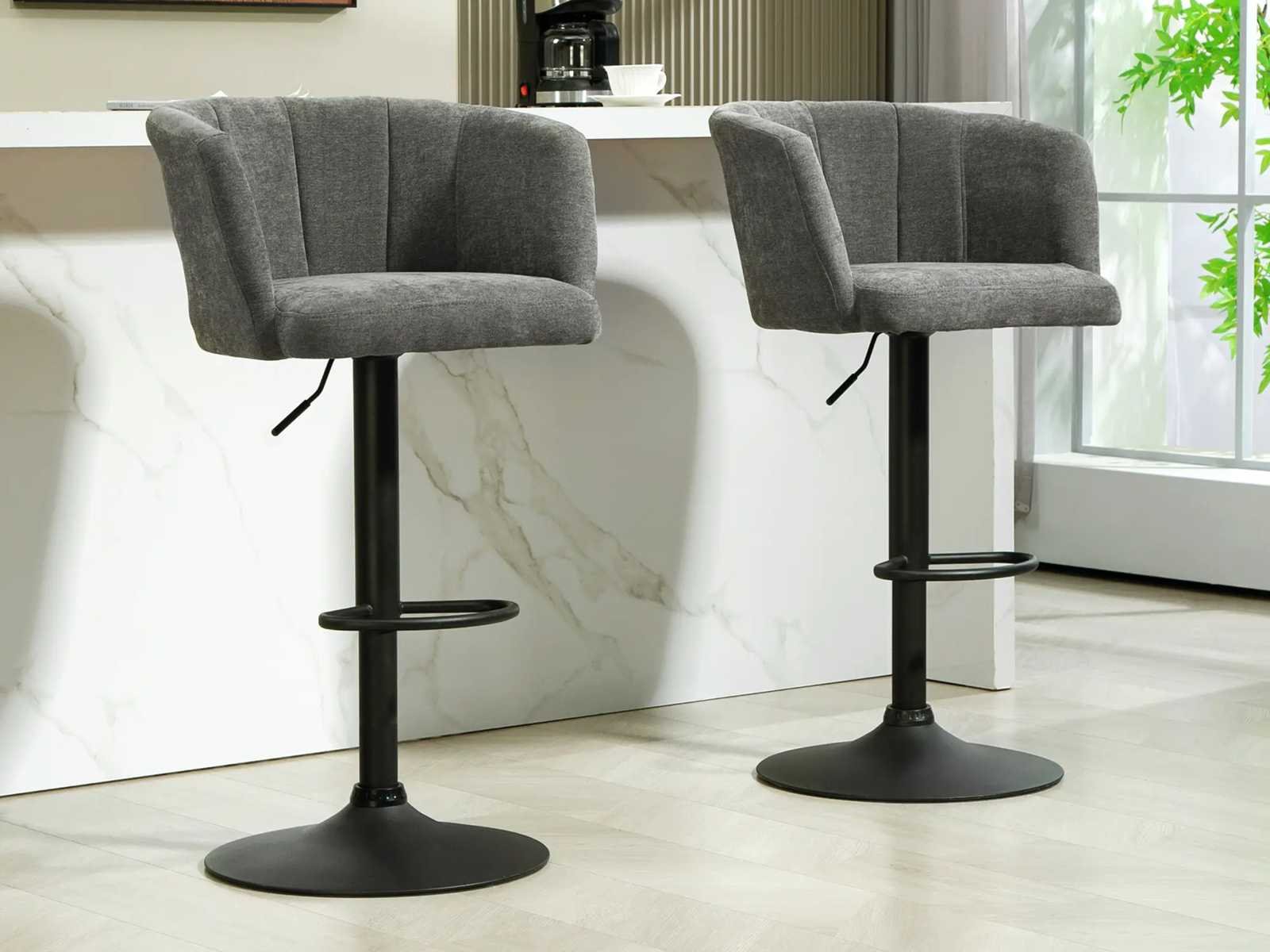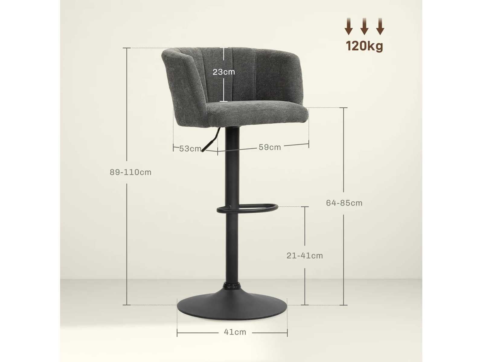 Technische gegevens: ? Kleur: donkergrijs + zwart ? Materialen: imitatielinnen (100% polyester), staal, schuim ? Algemene afmetingen: 59L x 53B x 89-110H cm ? Afmetingen zitting: 59 B x 53 D x 64-85 H cm ? Afmetingen rugleuning: 23H x 5D cm ? Hoogte voetensteun: 21-41 cm ? Diameter voet: Ø41 cm ? Draagvermogen: 120 kg Non
