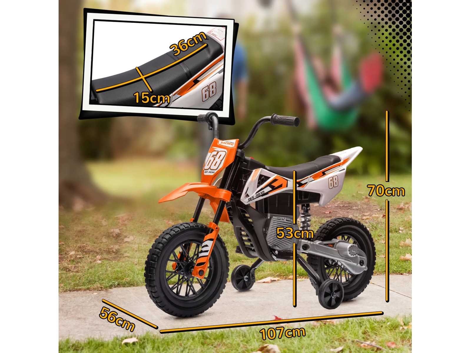 Specificaties: - Kleur: Oranje - Materiaal: kunststof, metaal - Totale afmetingen: 107L x 56B x 70H cm - Snelheid: 2,4-5 km/u - Afmetingen zitting: 15L x 36B x 53H cm (vanaf de vloer) - Diameter wiel: Ø34 cm - Oplaadtijd: 8-10 uur (eerste keer), 10-12 uur (regelmatig) - Batterij: 12V 4.5AH - Motor: 2 x 12V - Draagvermogen: 30 kg - Gekwalificeerde leeftijd: 3-8 jaar oud - Aanbevolen leeftijd: 3-6 jaar - Let op: Houd altijd toezicht op uw kinderen tijdens het rijden Non