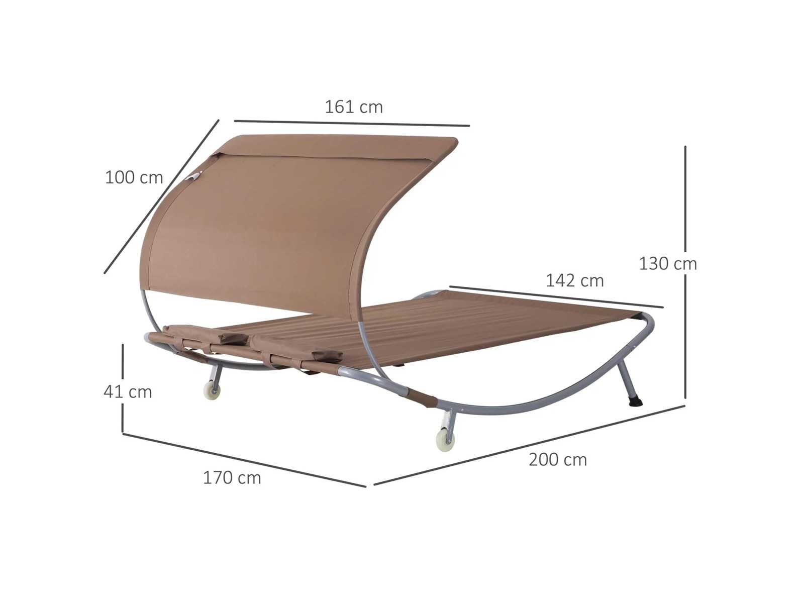 Specificaties: - Kleur: donkerbruin - Belangrijkste materialen: epoxystaal, Oxford-doek en polyester -Zon. totaal: 2L x 1.7W x 1.30H m -Zon. Dak: 1,8L x 1,11L m - Hoogte van het ligvlak: 41 cm - Dikte van de kussenvulling: 4 cm - Ø zwenkwielen: 10 cm - Aanbevolen maximale belasting: 220 kg - Levering in een enkel pakket Non