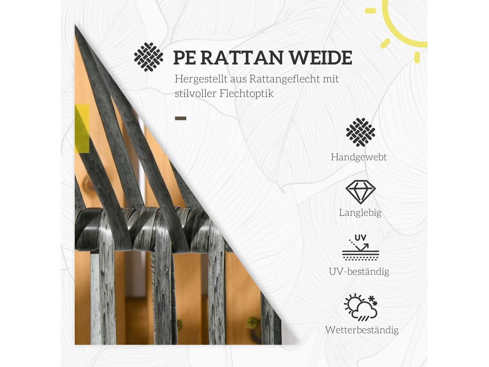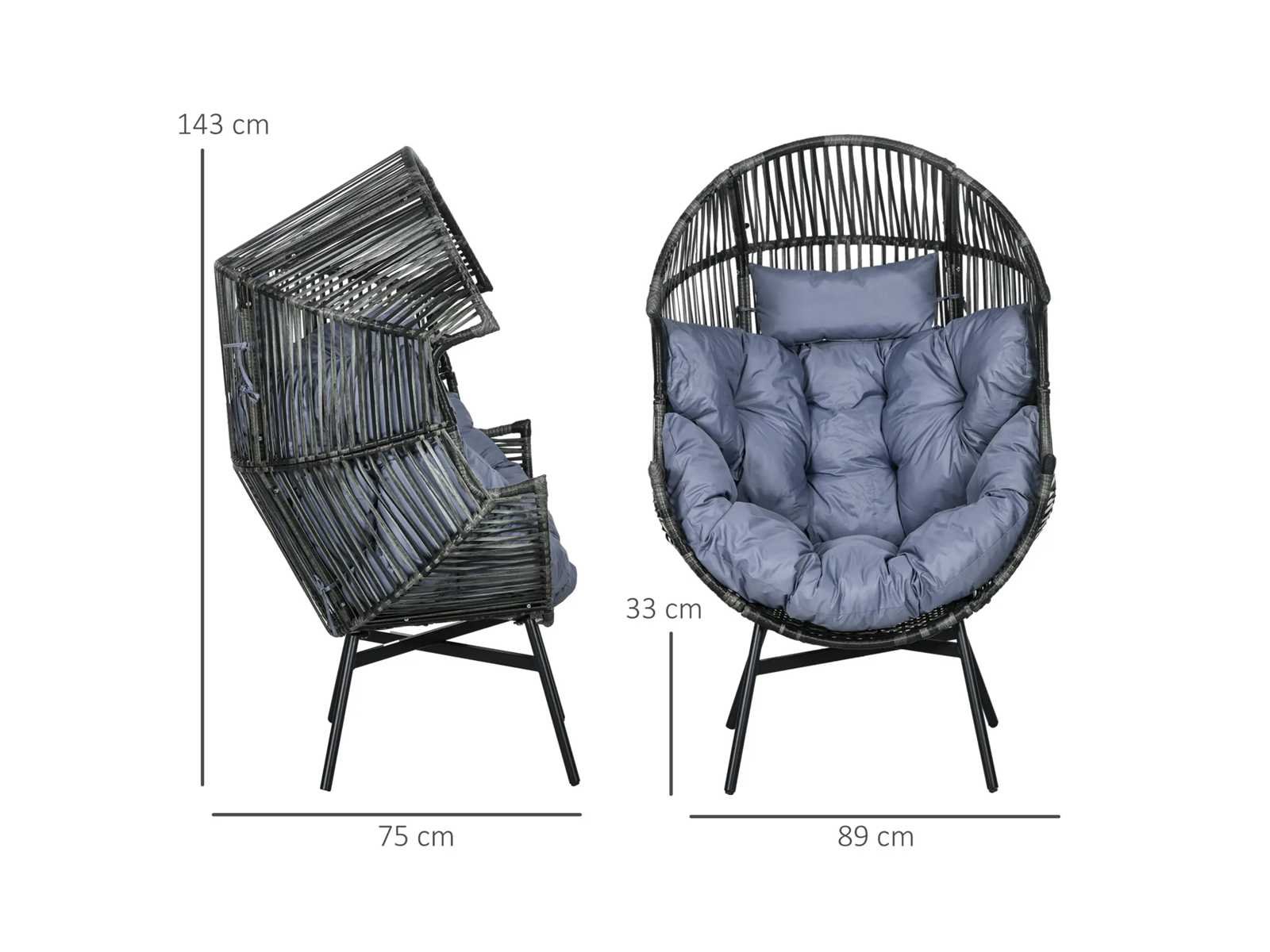 Technische gegevens: ? Kleur: Grijs + Zwart ? Materiaal: staal, PE-rattan, polyester en schuim ? Algemene afmetingen: 89 B x 75 D x 143 H cm ? Afmetingen zitting: 50 B x 52 D cm ? Zithoogte (zonder kussen): 33 cm ? Dikte kussen: zitting: 14 cm, hoofdsteun: 8 cm ? Draagvermogen: 120 kg Non