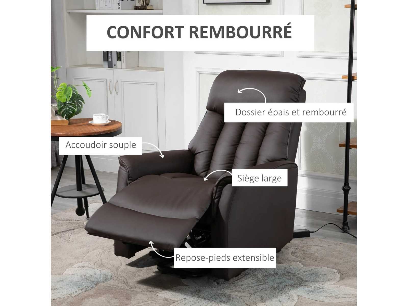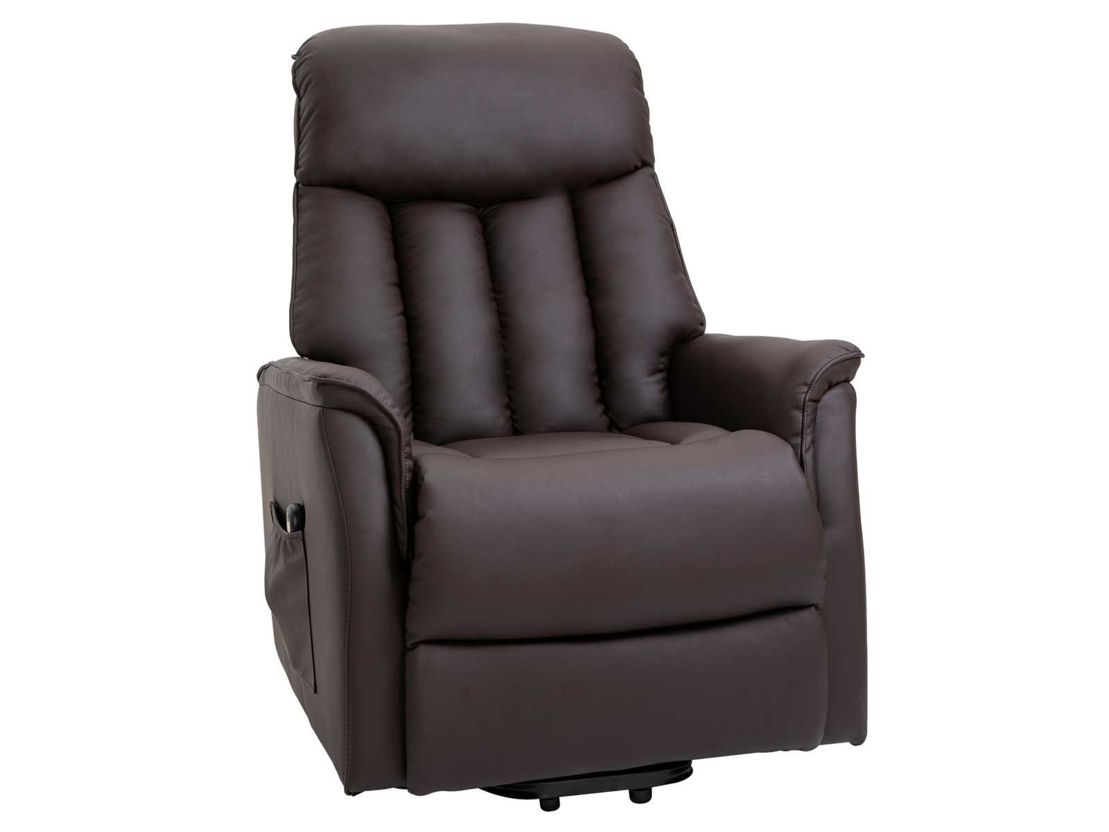 Specificaties: - Kleur: bruin - Materialen: synthetische coating, schuimvulling, staal, MDF - Totale afmetingen (staand): 80W x 94D x 104H cm - Afmetingen (langwerpig): 156L x 80B x 86H cm - Afmetingen (heffen): 82L x 80B x 138H cm - Afmetingen zitting: 52B x 55D x 46H cm - Dikte van de schuimvulling: 24 cm - Ingangsspanning: 100-240V, 50/60Hz - Uitgangsspanning: 29V/1.8A - Aanbevolen maximale belasting: 150 kg - Certificering: CE-EMC, RoHS, (adapter) CE-EMC, LVD, ROHS Non