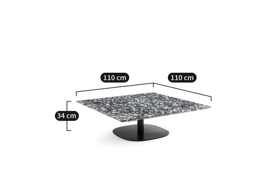 • MDF blad bekleed met zwarte en witte Terrazzo steen. Elk stuk is uniek, het algehele uiterlijk van het blad kan van het ene blad tot het andere verschillen, alle stenen verschillen in hun afmetingen en tinten. Deze verschillen geven de tafel al zijn schoonheid en uniciteit. • Afgeschuinde randafwerking • Centrale poot in zwart gelakt staal met epoxy afwerking Grootte • Breedte: 110 cm • Hoogte: 34 cm • Diepte: 110 cm Non