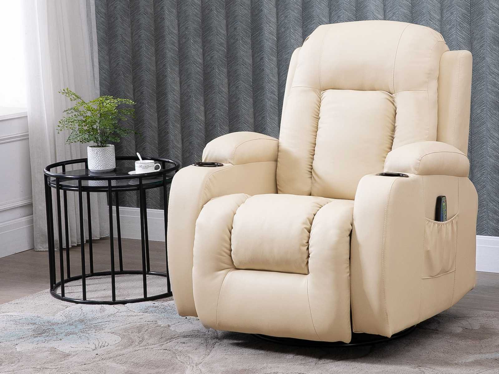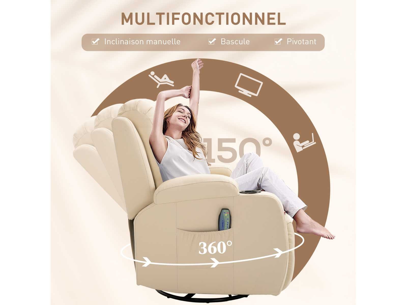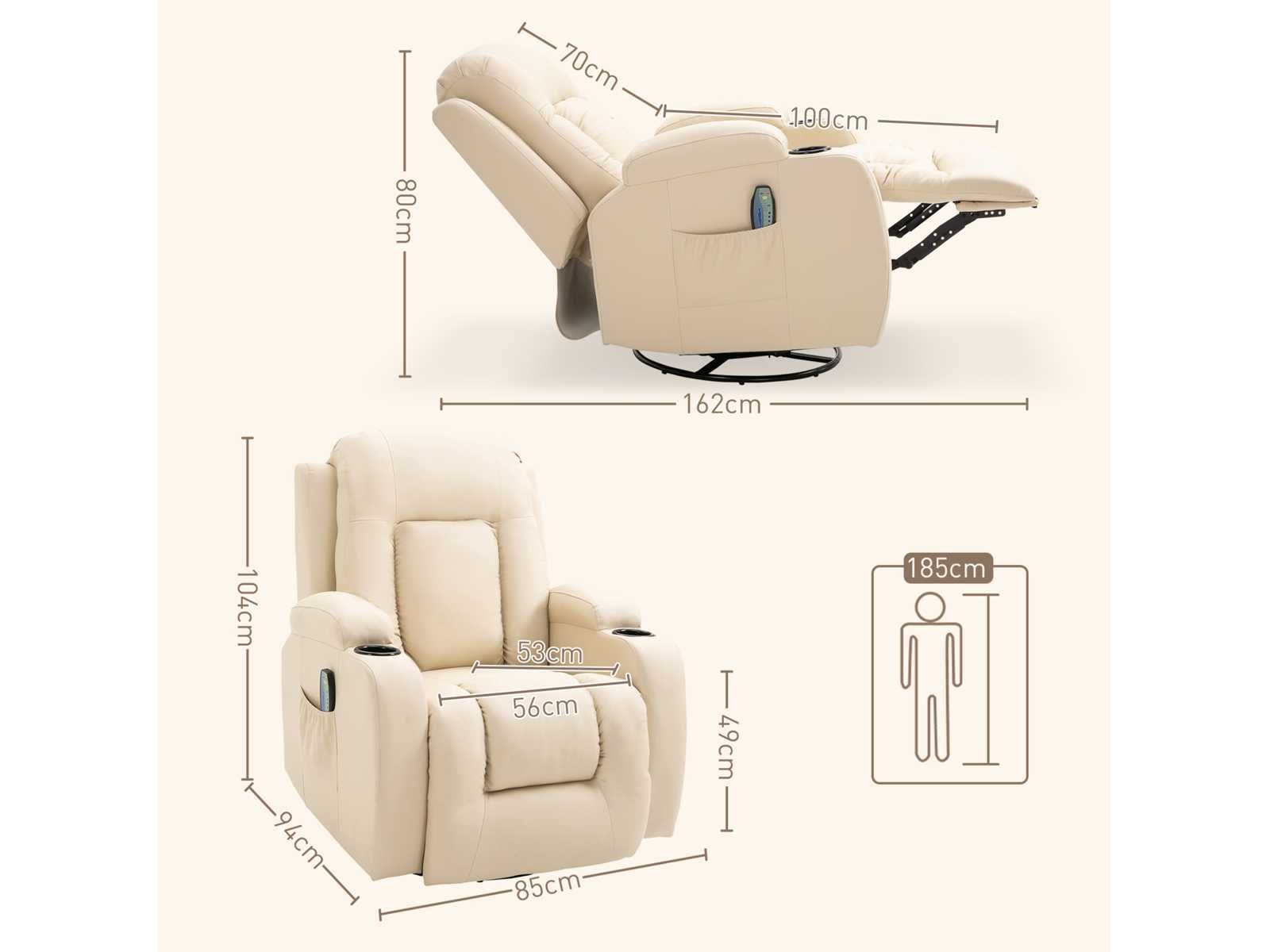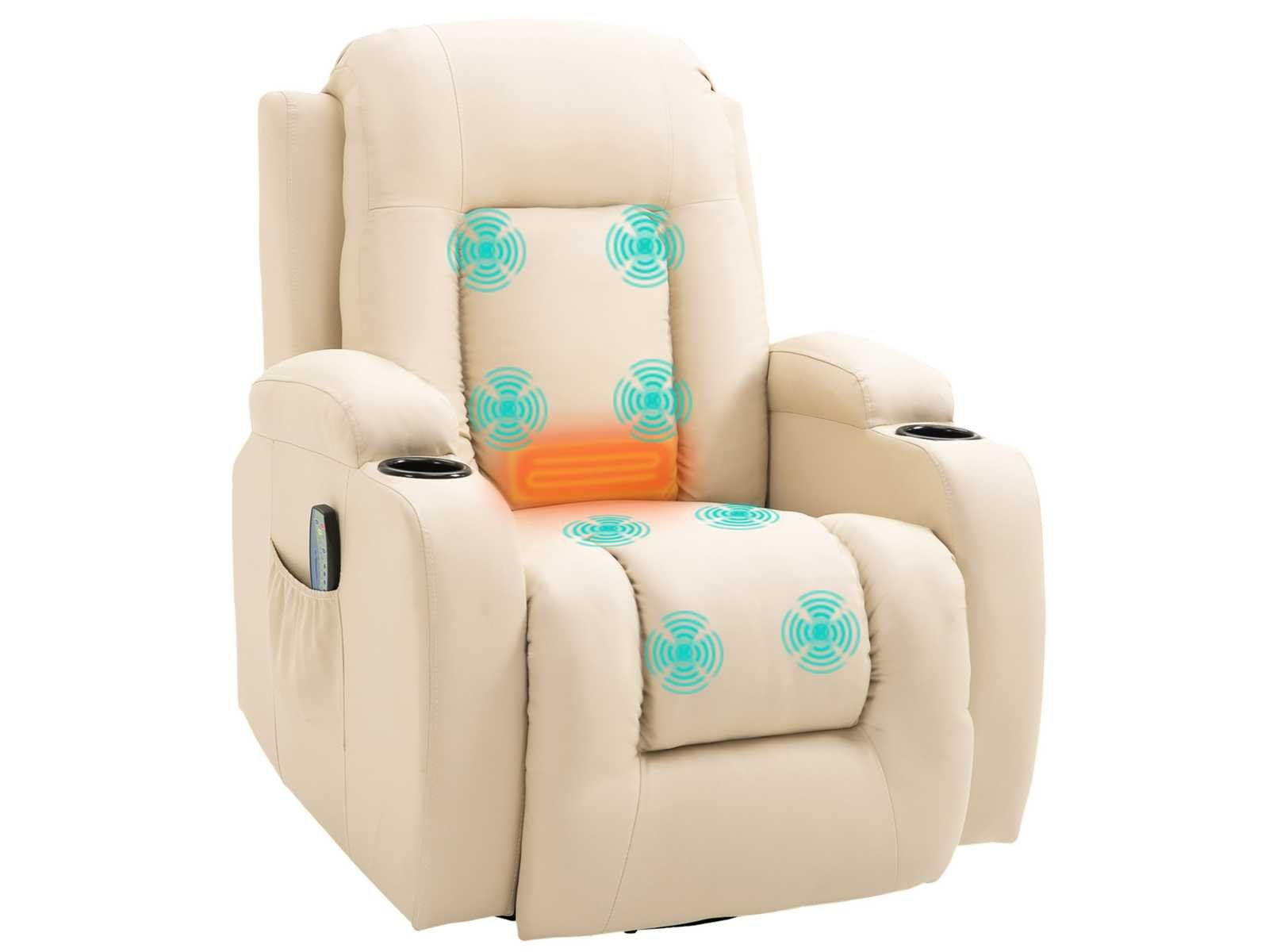 Specificaties: - Kleur: crème - Belangrijkste materialen: synthetische coating, staal, schuim -Zon. fauteuil: ca. 90L × 93L ×103H cm in liggende positie: 90L x 111B x 84H cm -Zon. zitting: ca. 56 x 80 cm (L x B) - Zithoogte: ca. 49 cm - Hoogte armleuning: 63 cm - Bekerhouder Ø: 9 cm - Spanning: 110 - 240 V, 50 - 60 Hz en 14,4 W vermogen - Aanbevolen maximale belasting: 150 Kg Non