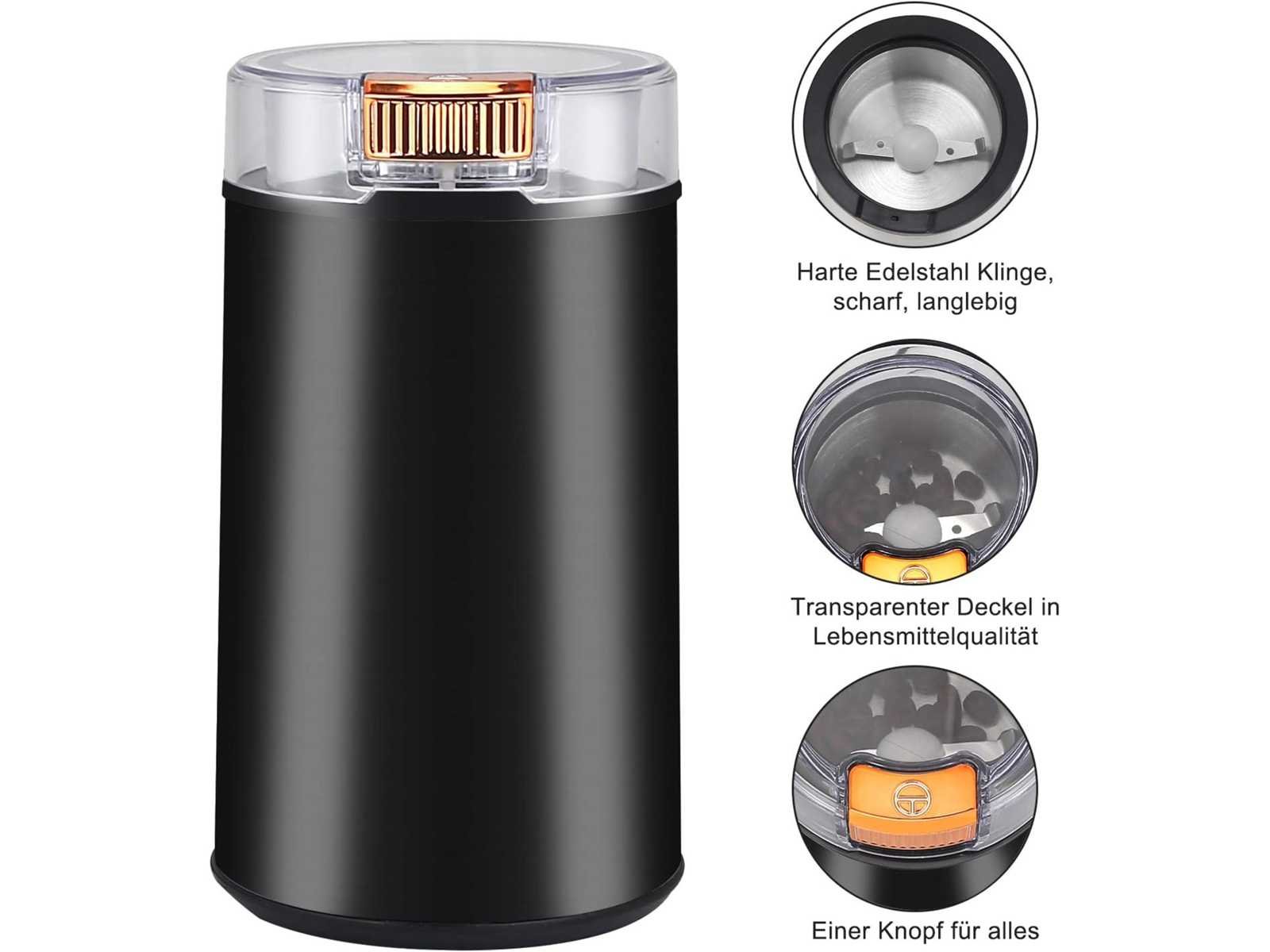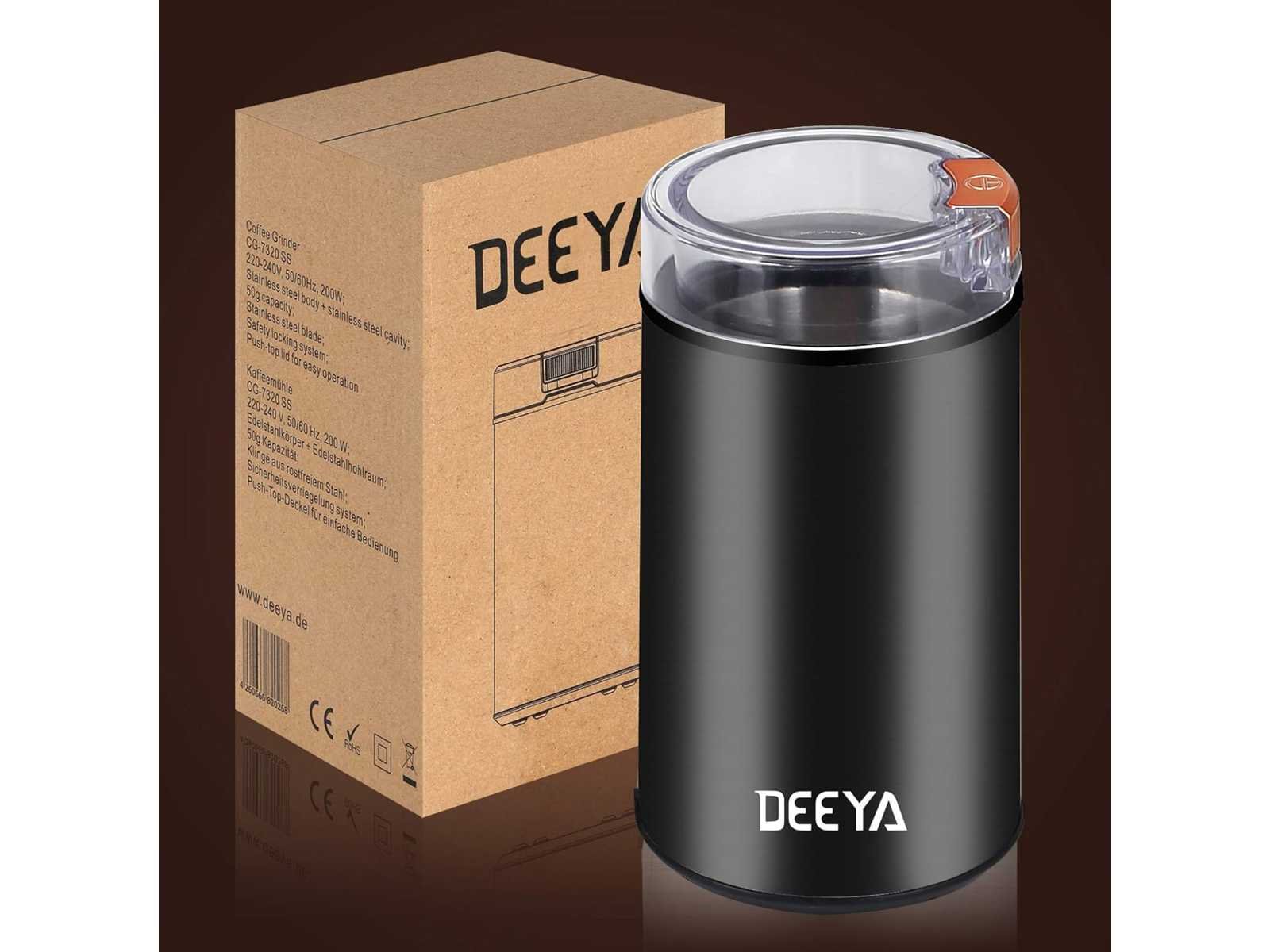 Krachtige koffiemolen – Uitgerust met een krachtige motor van 200 W, kunt u met de DEEYA elektrische koffiemolen snel en vrij verschillende maalniveaus aanpassen aan de behoeften van de koffie. De roestvrijstalen messen vermalen in 30 seconden een fijn poeder van hoge kwaliteit. Multifunctionele molen: Dit is niet alleen een koffiemolen, maar ook een molen voor het malen van allerlei soorten specerijen, peper, zaden, kruiden, noten, granen en nog veel meer. (Let op: maal GEEN bonen die harder zijn dan koffie, omdat dit de binnenste messen kan beschadigen.) Eenvoudig in gebruik: slechts één knop. Druk kort op de knop om de molen te starten en laat hem los om hem te stoppen. U kunt de maling van uw koffiebonen instellen: grof (10 s), medium (20 s) of fijn (30 s). Dankzij het transparante deksel kun je op elk moment de maalstatus duidelijk waarnemen en de kwaliteit van de koffie controleren. Kwaliteitsmolen: ergonomisch ontwerp voor een comfortabele grip. De roestvrijstalen behuizing zorgt voor extra duurzaamheid en is 100% BPA-vrij. Daarnaast werkt de DEEYA kruidenmolen alleen met de juiste deksel om stoflekkage tijdens gebruik te voorkomen. Non