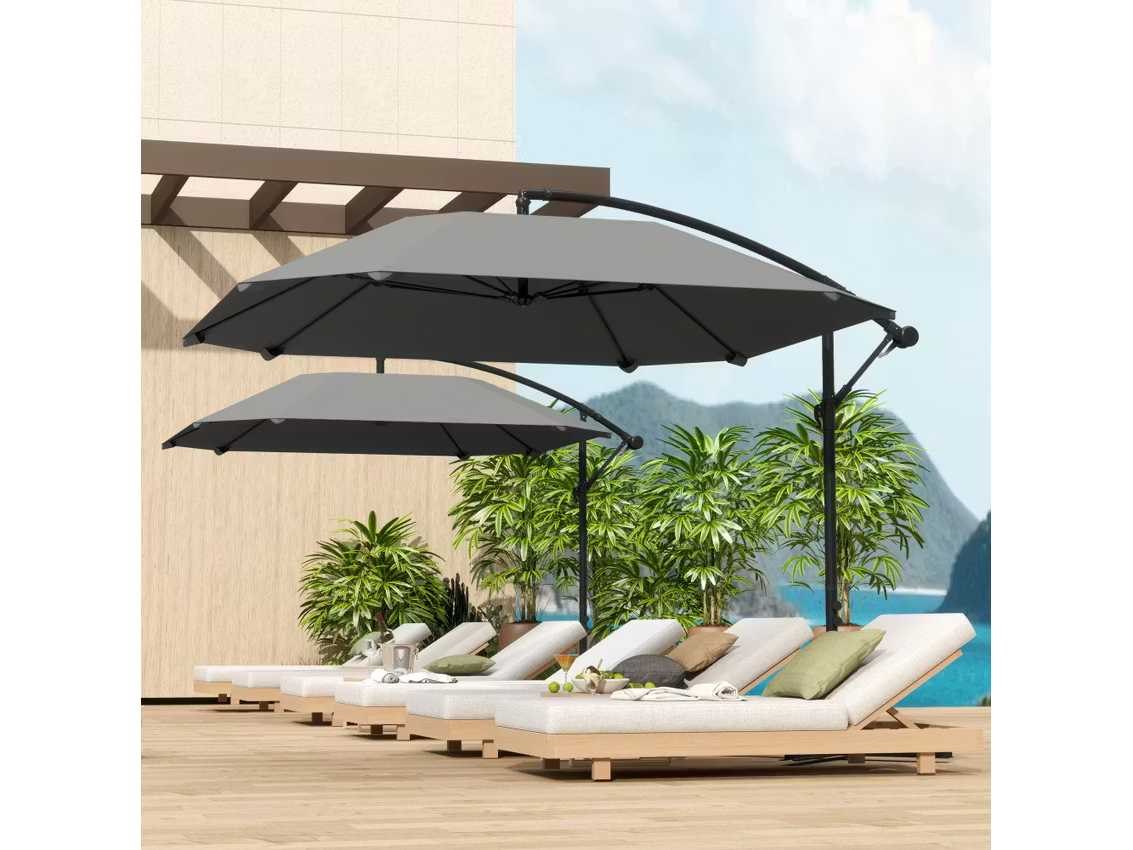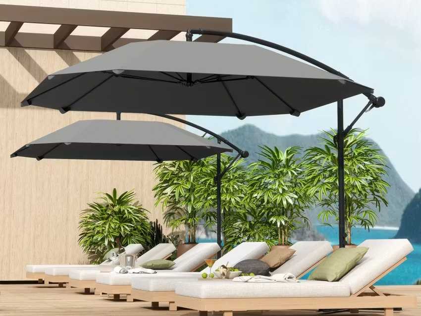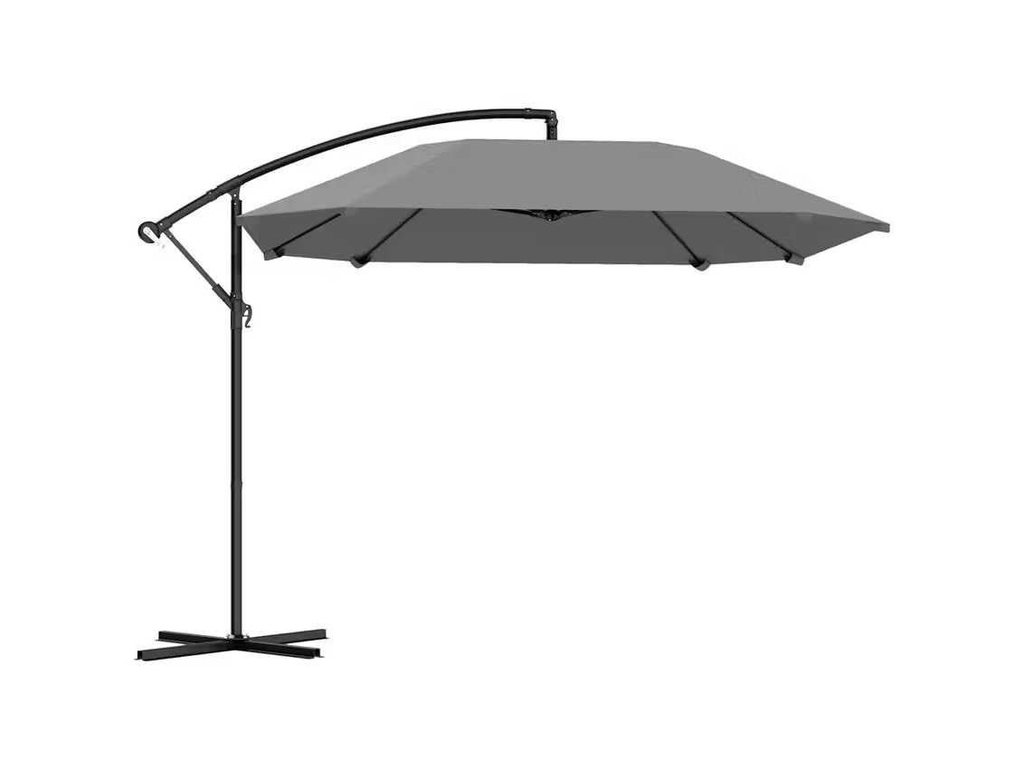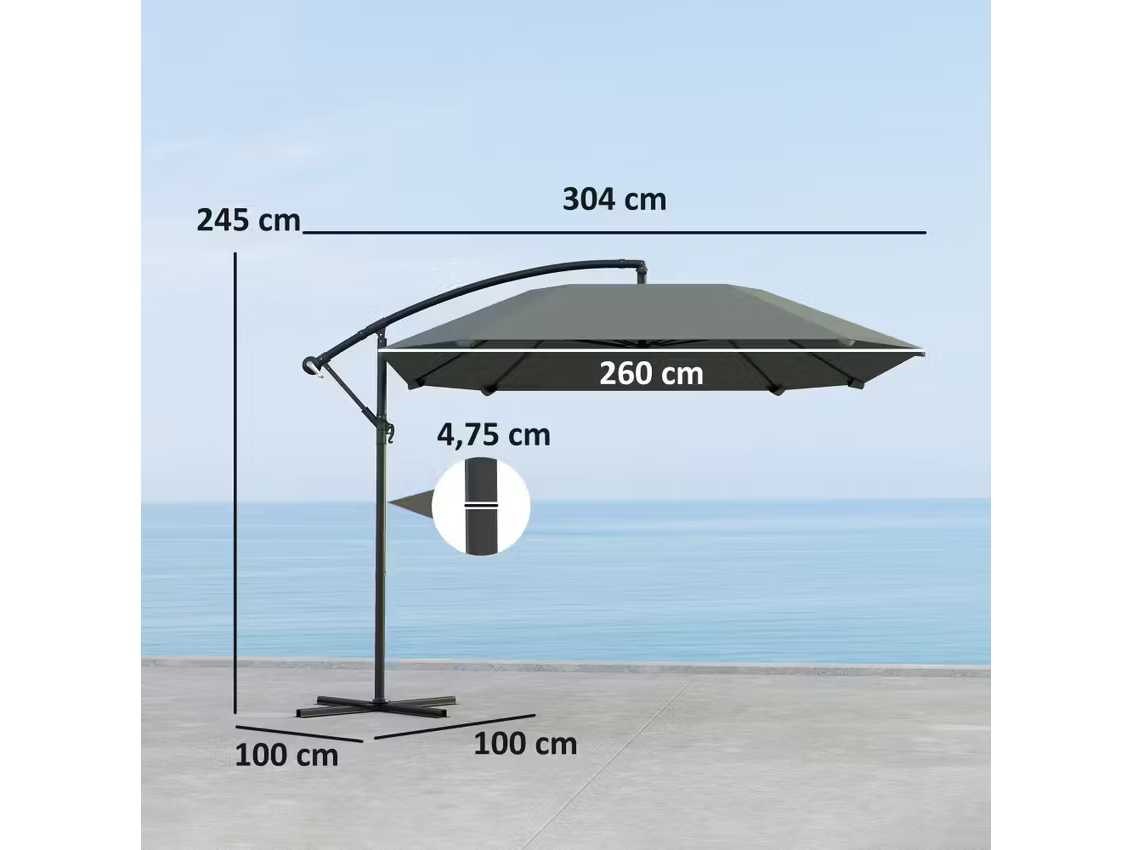 Technische specificaties: ? Kleur: Donkergrijs ? Materialen: Metaal, glasvezel, polyester ? Totale afmetingen: 304 cm (L) x 260 cm (B) x 245 cm (H) ? Afmetingen doek: 260 cm (L) x 260 cm (B) x 184 cm (H) (vanaf de vloer) ? Afmetingen kruisstandaard: 100 cm (L) x 100 cm (B) x 70 cm (H) (totaal), 100 cm (B) x 90 cm (B) x 4,2 cm (H) (elke poot) ? Opmerkingen: 1. Vereist een gewicht van 60 kg (niet inbegrepen). 2. Om de parasol te beschermen, mag u deze niet gebruiken in extreme weersomstandigheden (harde wind, regen, sneeuw). Non
