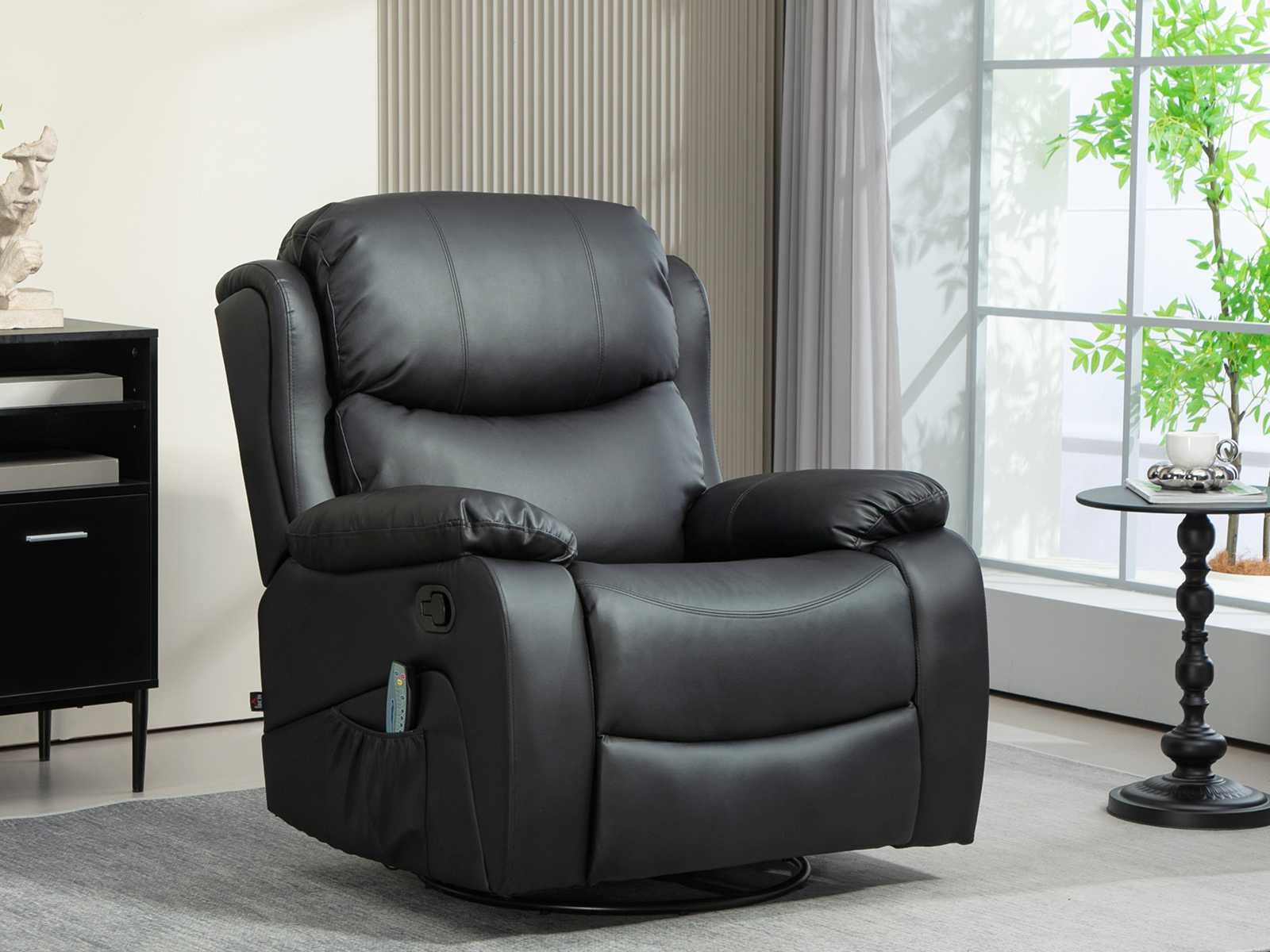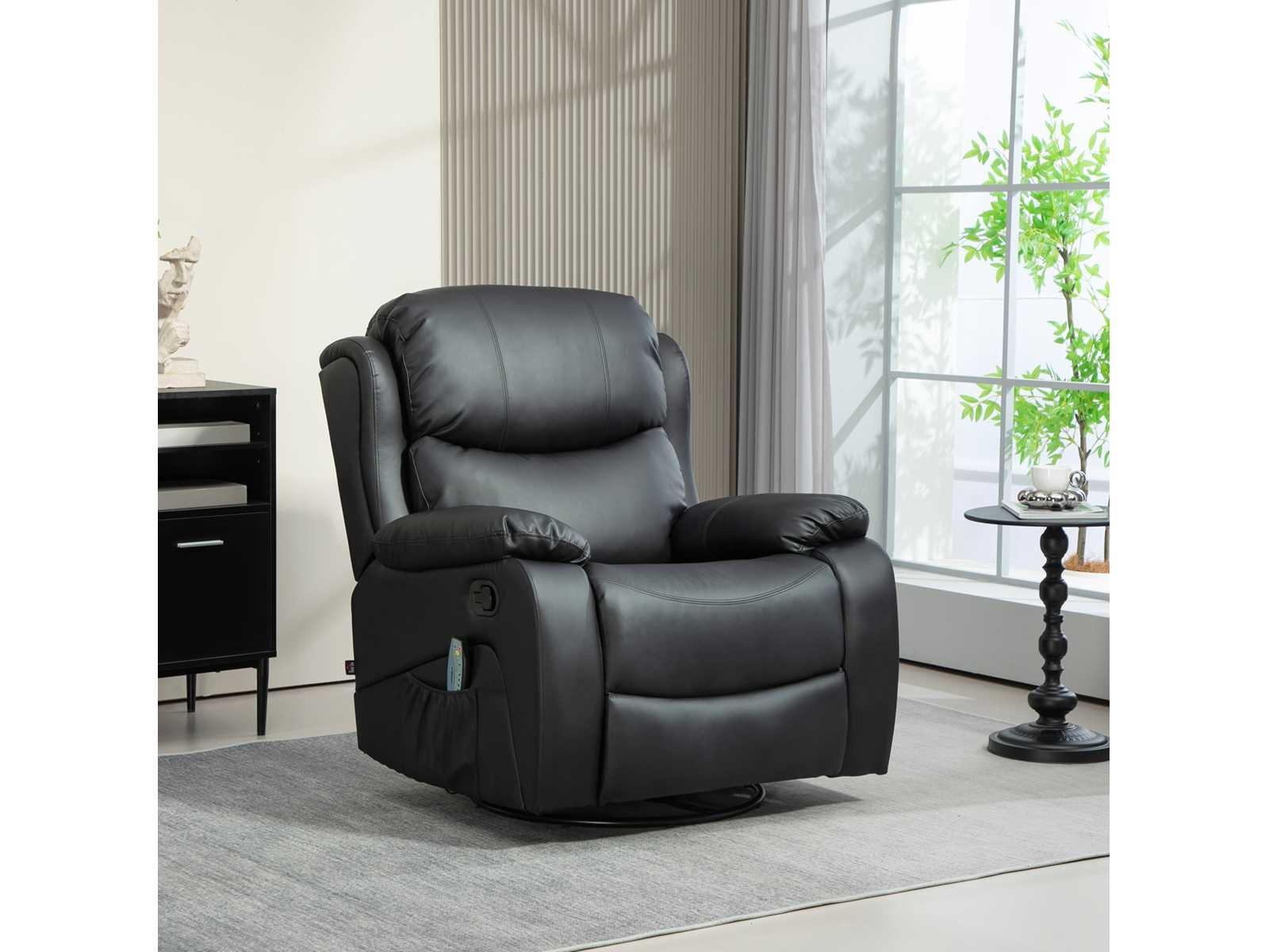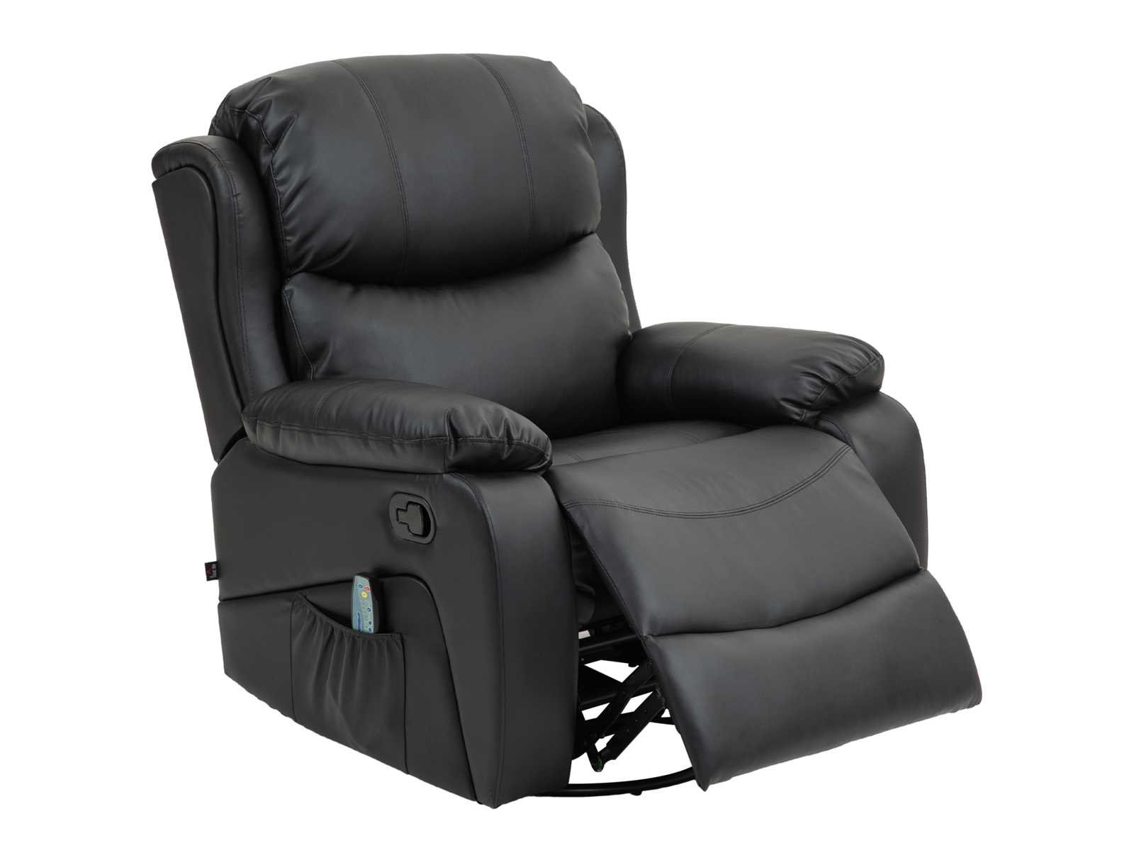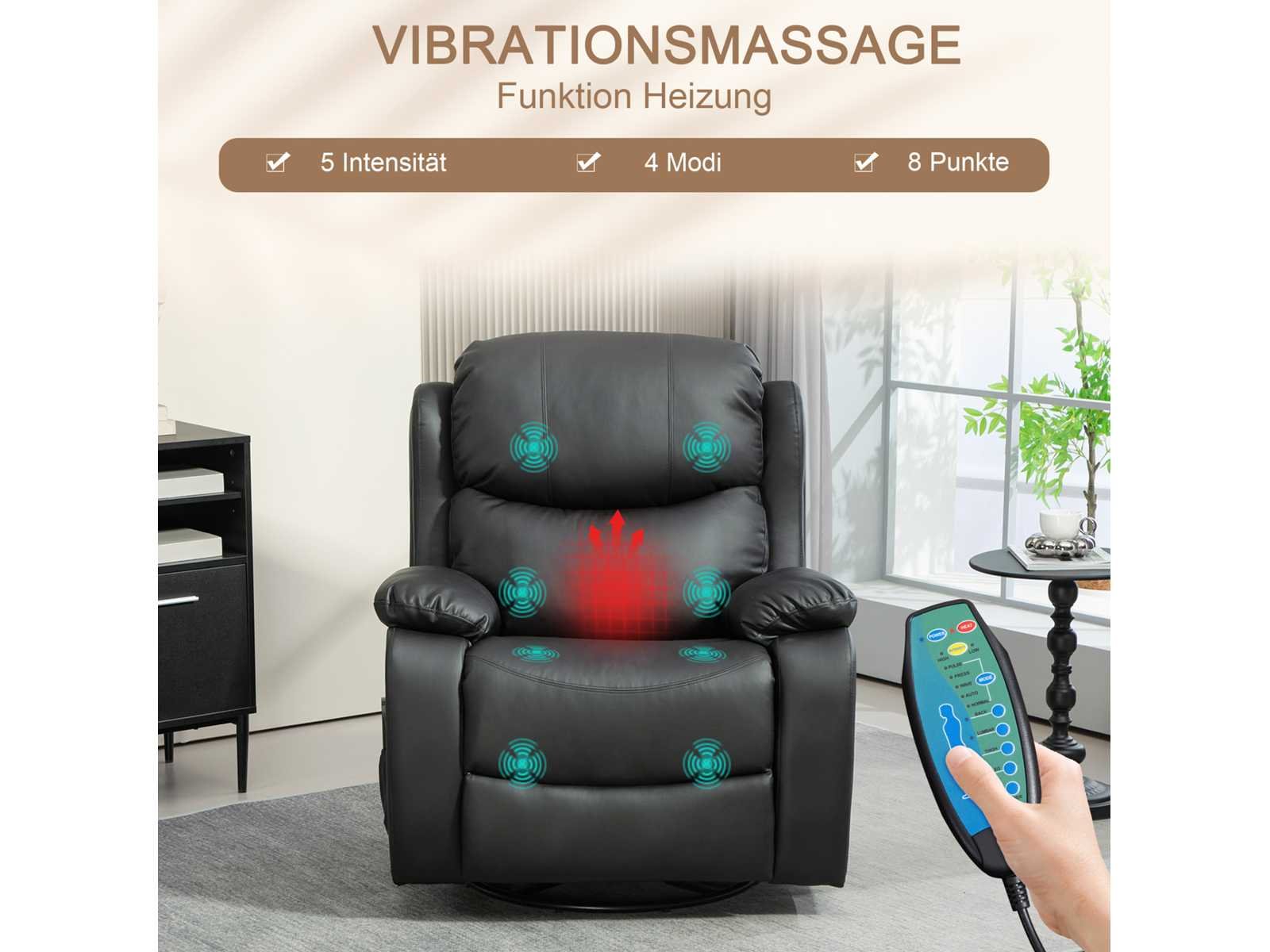 Technische gegevens: ? Kleur: Zwart ? Materialen: Kunstleer, schuim, houten frame, staal ? Totale afmetingen: 97 cm (L) x 92 cm (B) x 104 cm (H) ? Afmetingen zitting: 50 cm (breedte) x 52 cm (diepte) ? Zithoogte: 50 cm ? Dikte kussen: 10 cm ? Maximale kantelhoek: 168° ? Stroomvoorziening: 100-240 V / 50-60 Hz ? Vermogen: 14,4 W ? Maximaal draagvermogen: 150 kg Non