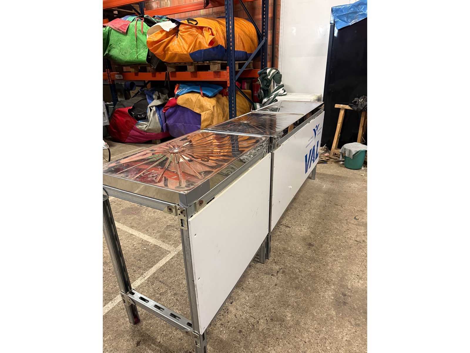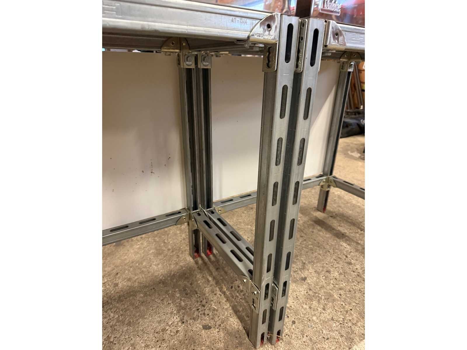 Zeer degelijke en steve mobiele doorgeef toog met drukplaat en afvoer. stevige aluminium constructie No Gewicht: 80kg Lengte: 350cm Breedte: 60cm Hoogte: 80cm