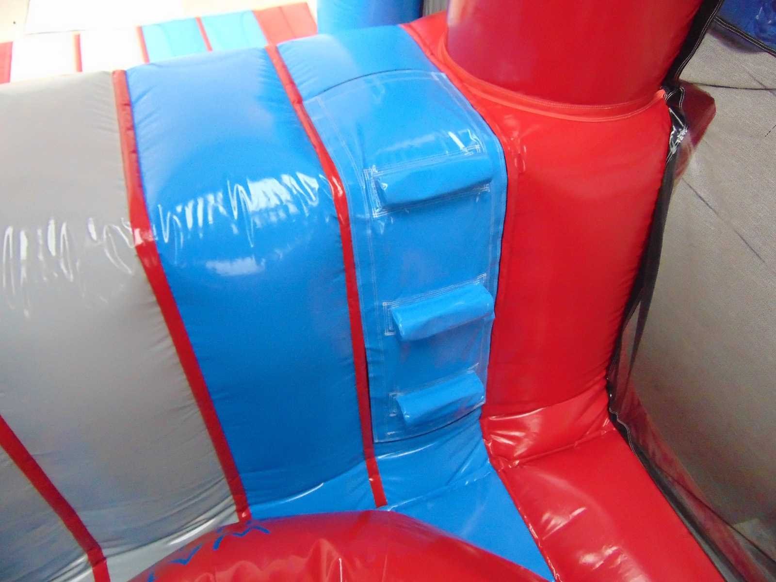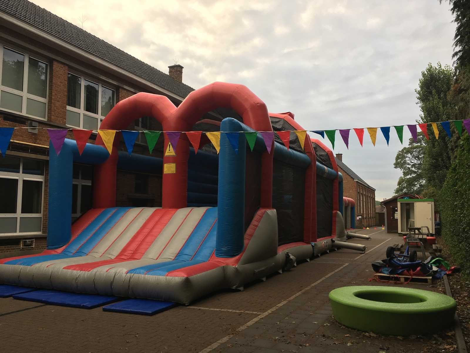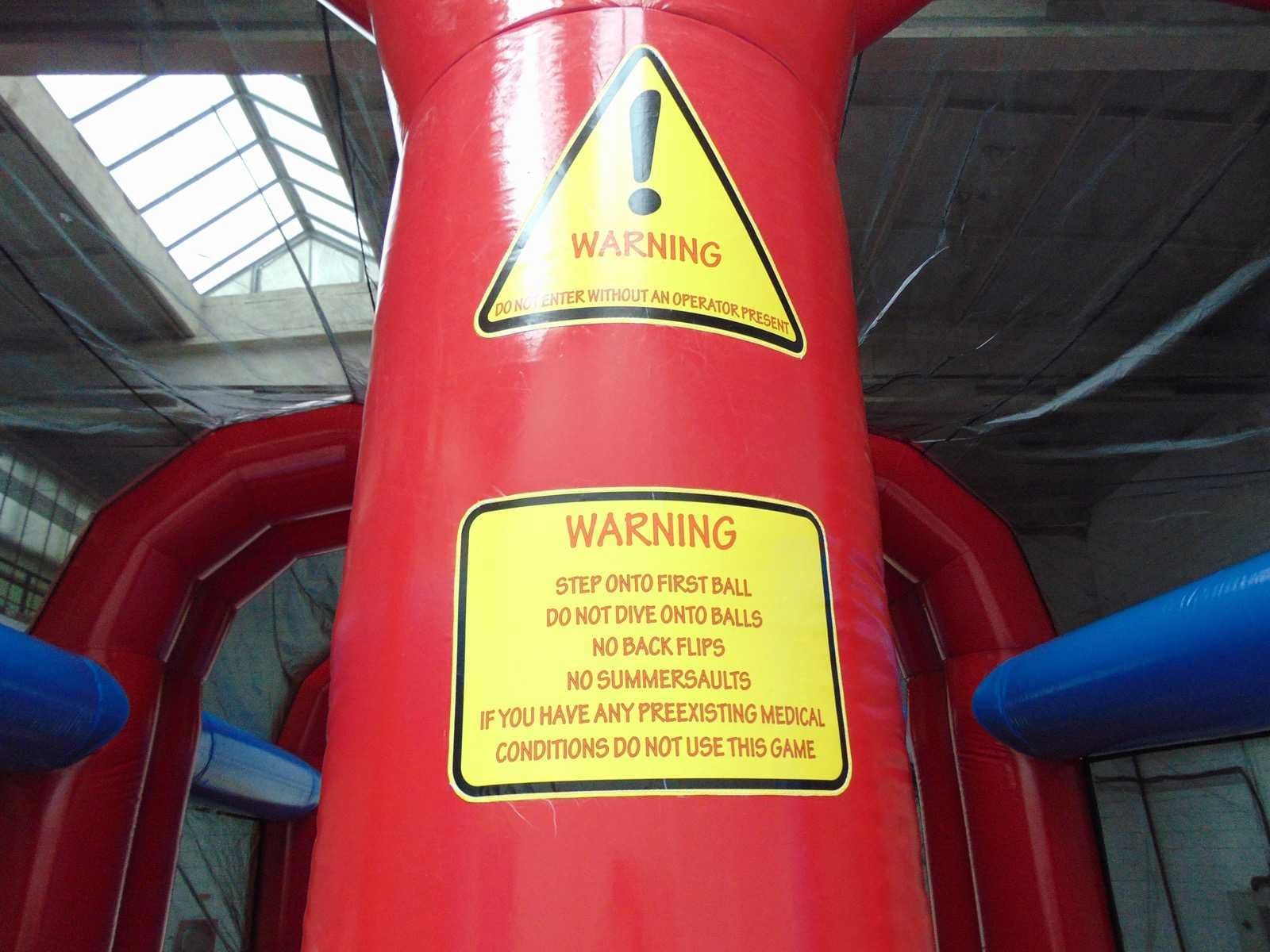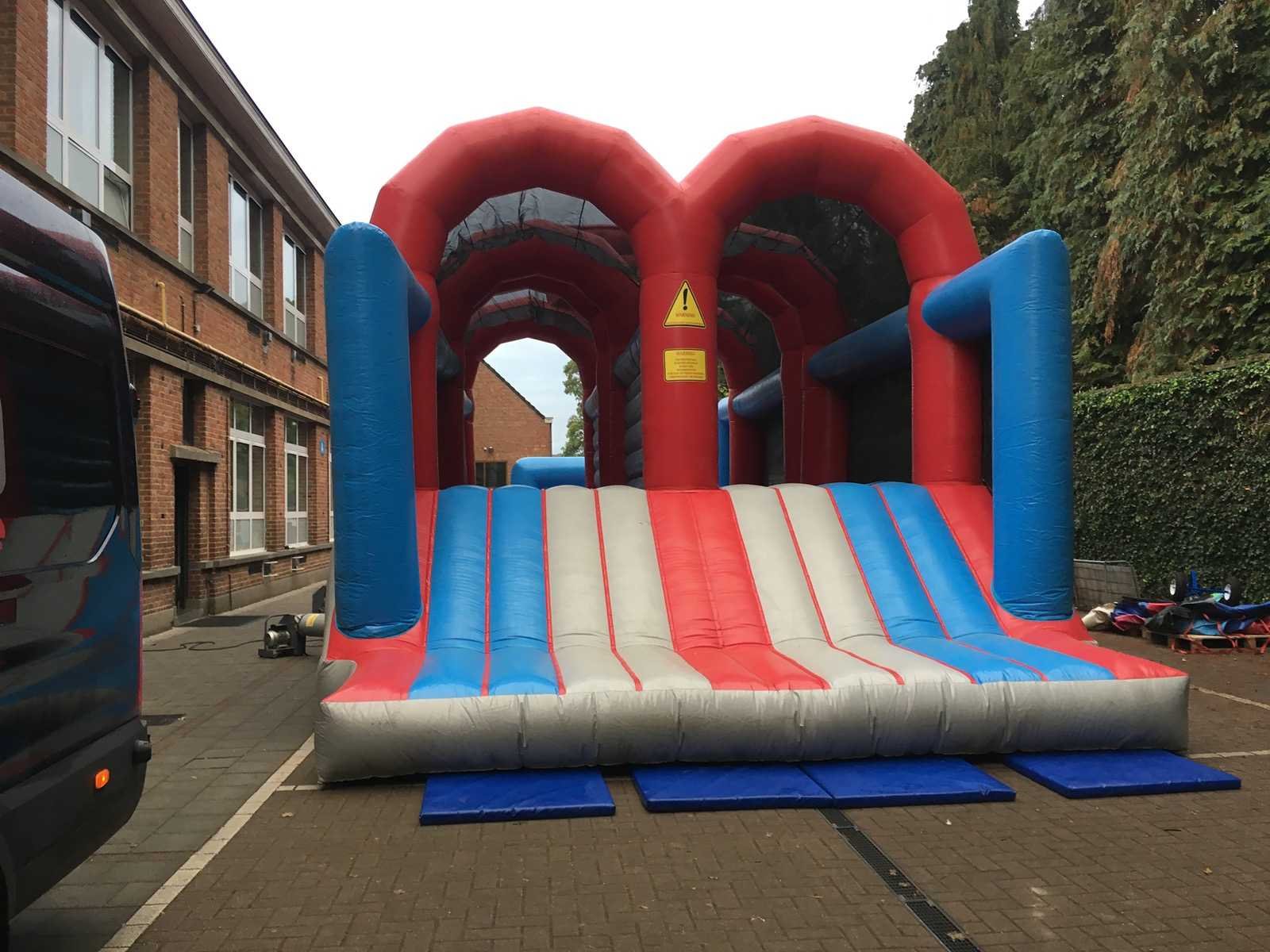 Dubbele Wipe Out baan. 16,5 meter Afgesloten zijkanten voor veiligheid. Dubbele baan links en rechts zijn beide 4 wipe out ballen. Zeer leuke en grote attractie Bestaande uit 2 aparte rollen. exclusief blazers No Merk: Airquee Model: Wipe Out balls Gewicht: 700kg Lengte: 16500cm Breedte: 6500cm Hoogte: 6500cm