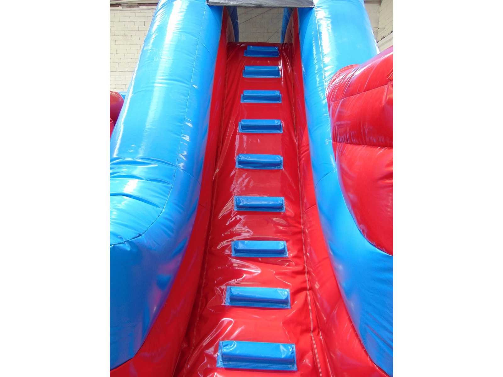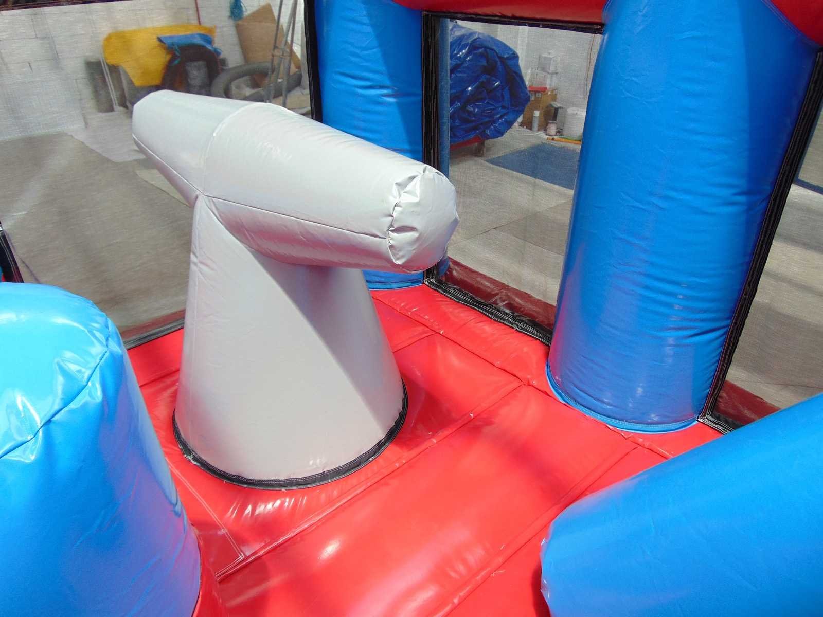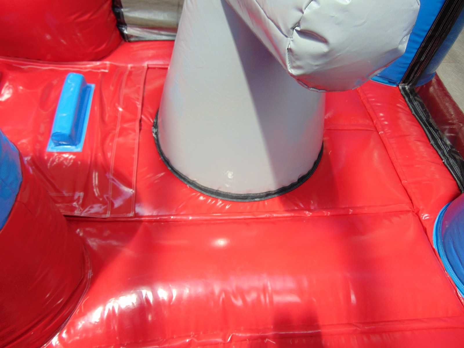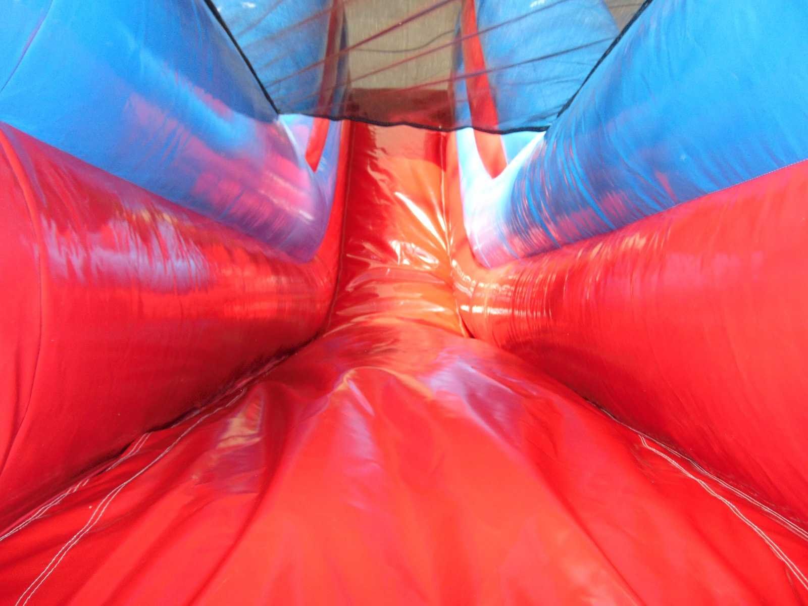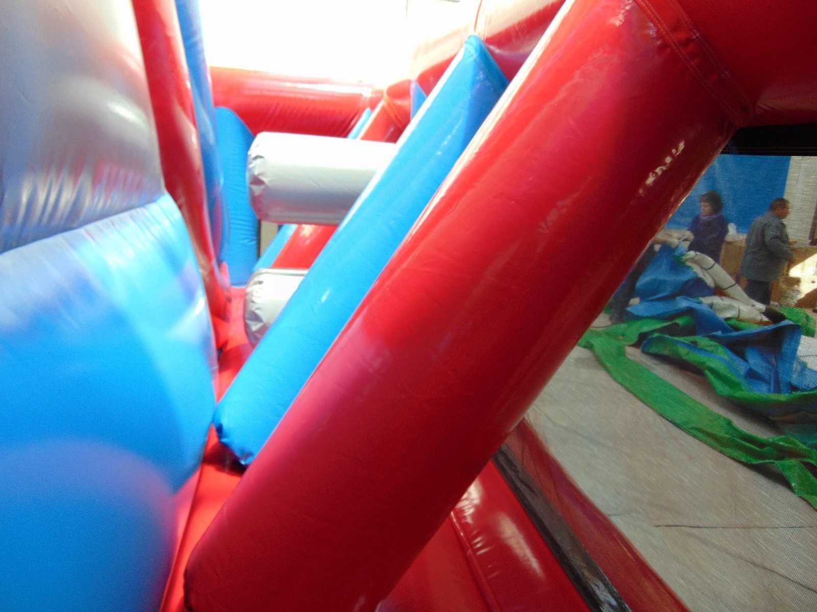 2 lane hindernisbaan. 12 meter Kan opgesteld worden in doorgang of als losstaande attractie. Met obstakels, trap en schuifbaan. In gebruikte maar prima staat exclusief blazer No Merk: Airquee Gewicht: 350kg Lengte: 12000cm