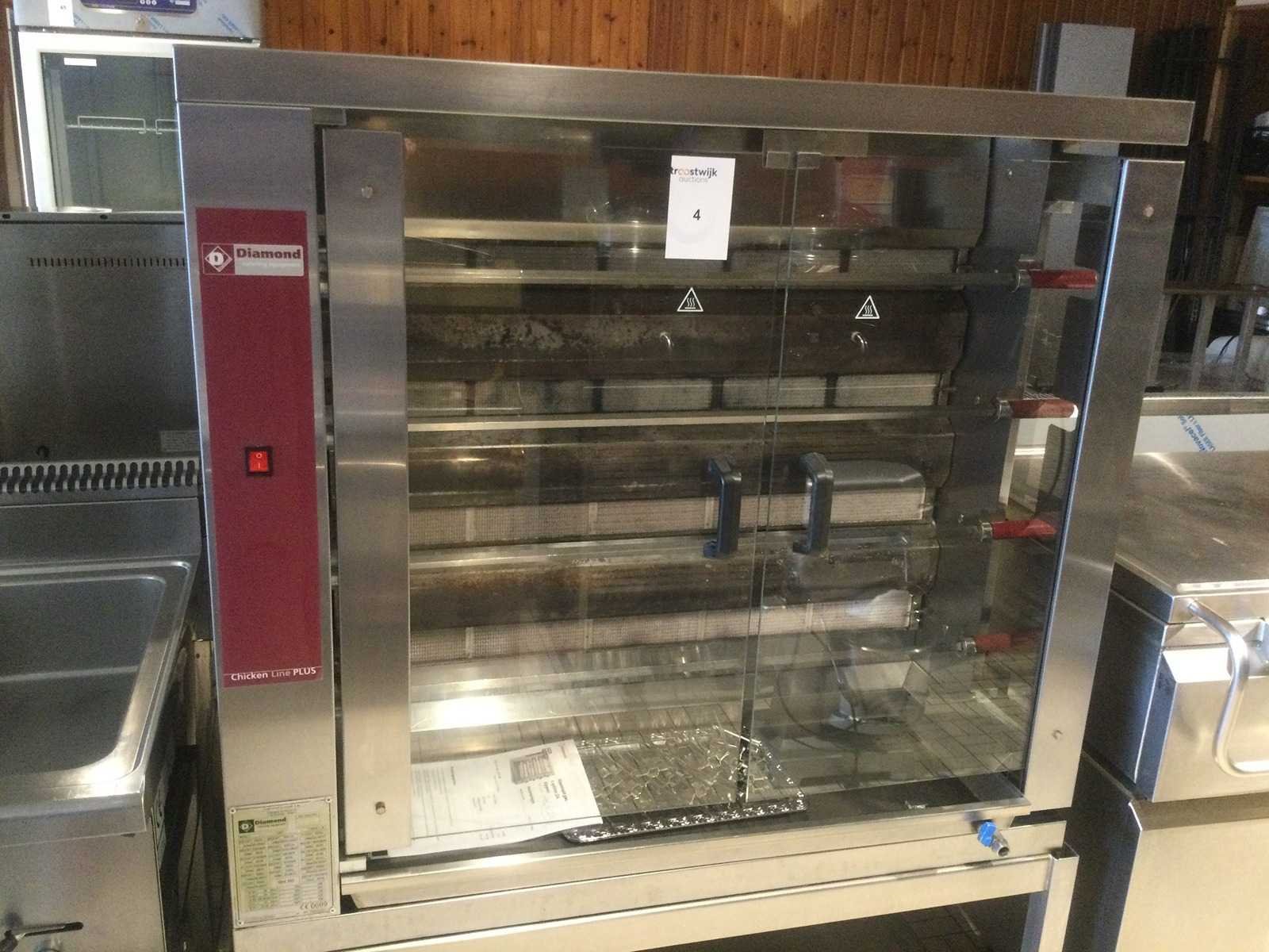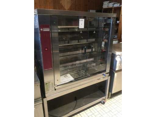 Kippenspit Diamond Chicken Line Plus, rvs, met 2 glasdeuren, 26KW, 4 spiezen voor elk 6 kippen, keramische stralers gas met veiligheidskoppel, elk spit afzonderlijk te bedienen, met onderstel mobiel rvs; Nee Merk: Diamond Type: 4CG Gasgestookt: true Aansluiting: 230V Eigen gewicht: 120kg Totale afmeting L: 1100mm Totale afmeting Breedte: 500mm Totale afmeting Hoogte: 1000mm