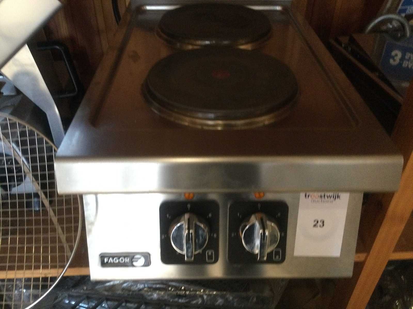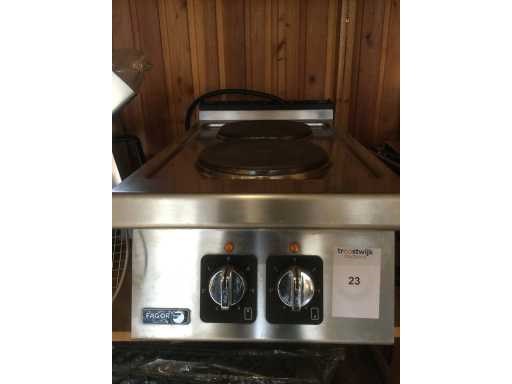 Elektrisch fornuis; opzetmodel; bouwjaar 09/2019; Nee Merk: Fagor Model: CE7-20 Kookzones: 2 Vermogen: 5200W Spanning: 400V Gewicht: 25kg Lengte: 40mm Breedte: 75mm Hoogte: 27mm