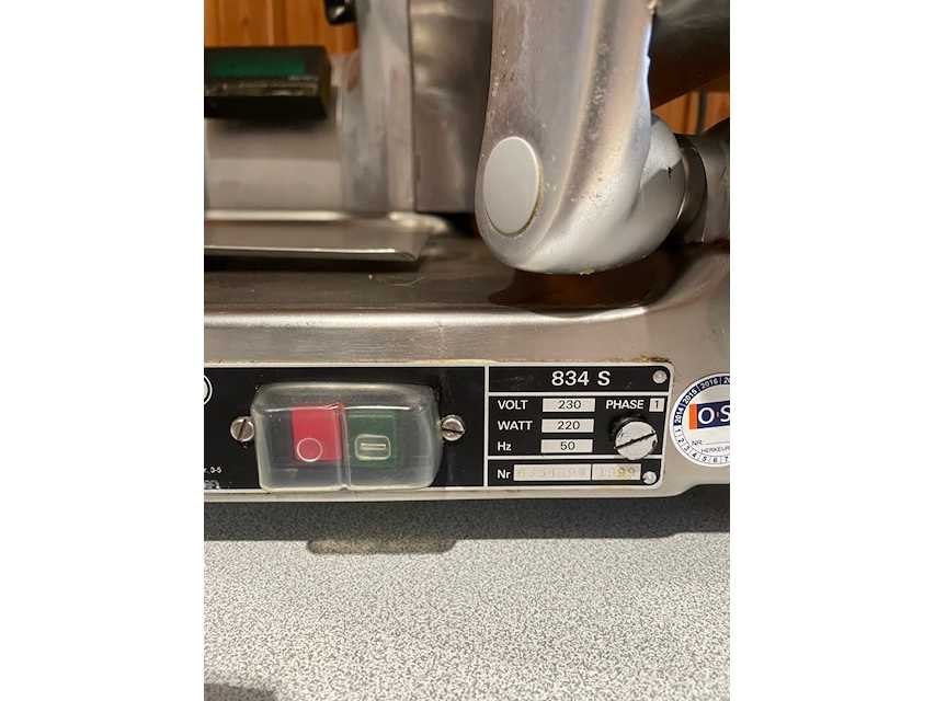 Professionele snijmachine voor vlees, kaas, groenten; met controleweegschaal; ingebouwd slijpapparaat; Nee Merk: Berkel Type: 834 S Bouwjaar: 1999 Diameter snijblad: 300mm Messlijper: true Max. snijdikte: 240mm Aansluiting: 230V