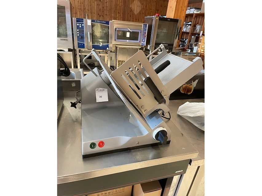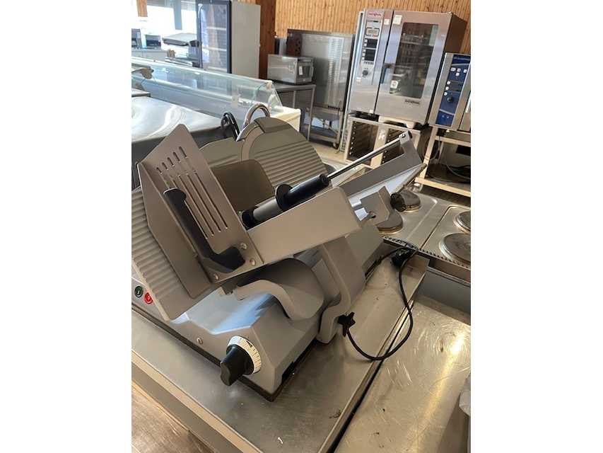 Professioneel snijmachine; schuin model; slijpapparaat apart; veilige uitvoering; prima staat; Nee Merk: Graef Type: Euro 3370 FL Bouwjaar: 2013 Diameter snijblad: 330mm Messlijper: true Max. snijdikte: 300mm Aansluiting: 230V Eigen gewicht: 40kg Totale afmeting L: 660mm Totale afmeting Breedte: 620mm Totale afmeting Hoogte: 470mm