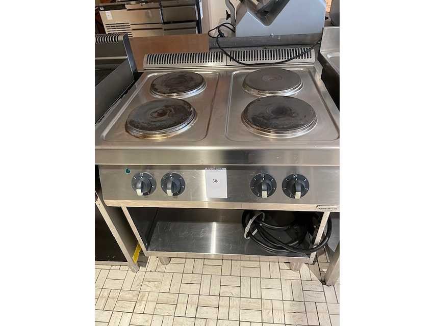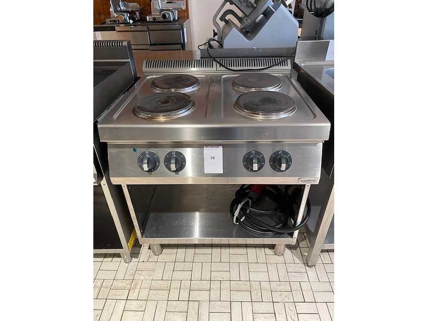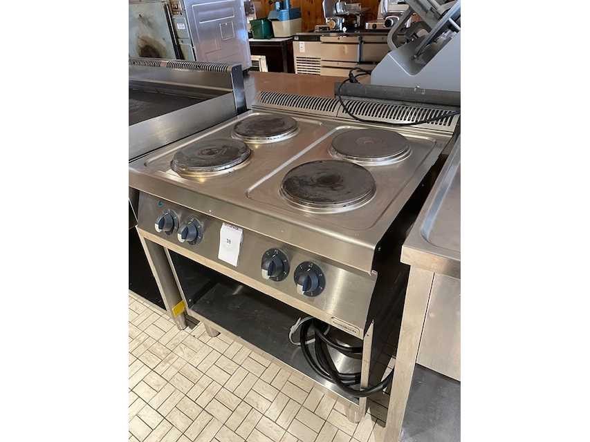 Elektrisch fornuis zwaar model; 4 grote platen; 400V; op open voet; rvs; Nee Merk: Combisteel Model: elektrisch Lengte: 80cm Breedte: 73cm Hoogte: 90cm Materiaal: rvs