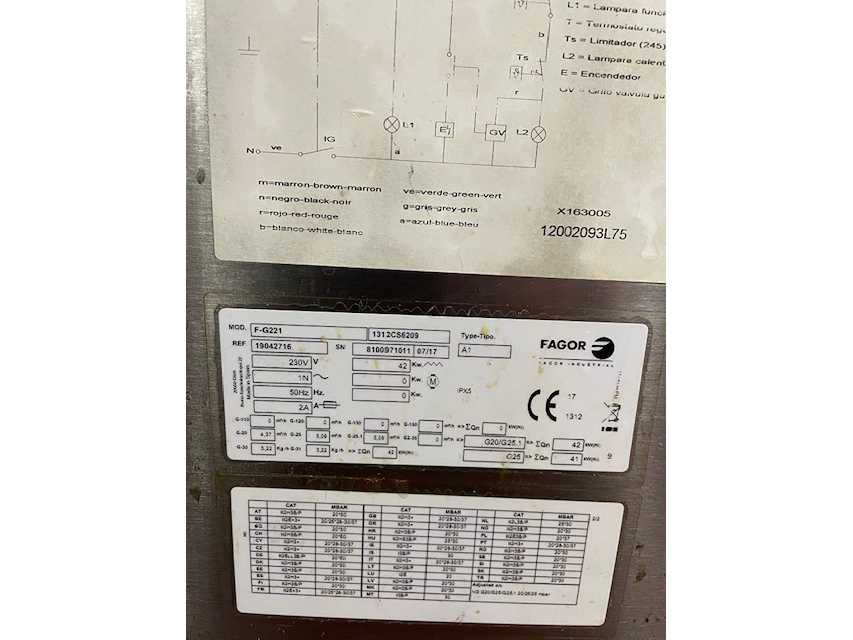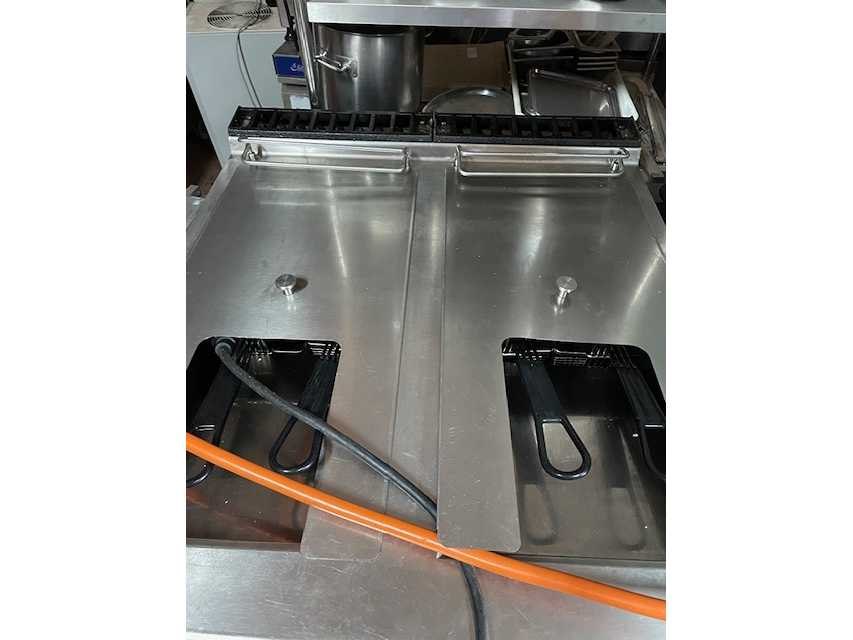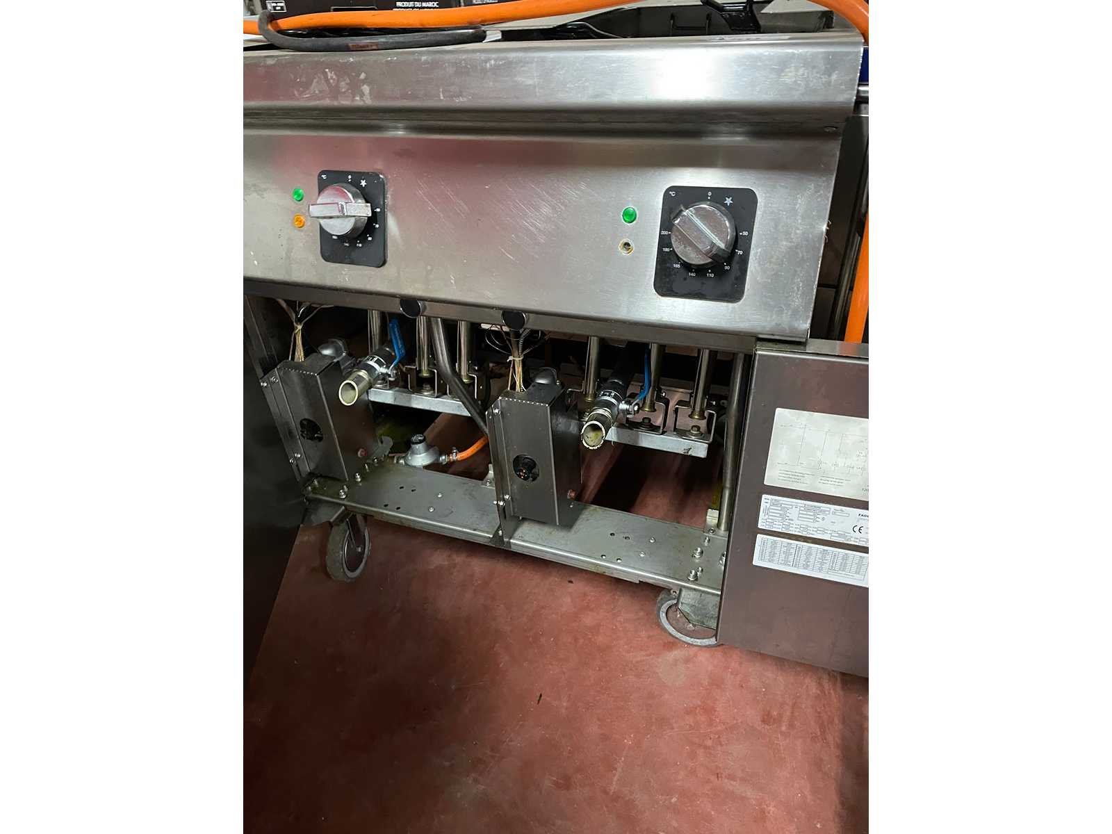 Dubbele gasfriteuse 2 x 20 liter; met 4 mandjes; mobiel; Nee Merk: Fagor Model: F-G221 Type: gas dubbel Lengte: 80cm Breedte: 90cm Hoogte: 90cm Materiaal: rvs Inhoud: 20 Aantal zones: 2 Vermogen (kW): 42 Spanning: 230 Gas: true