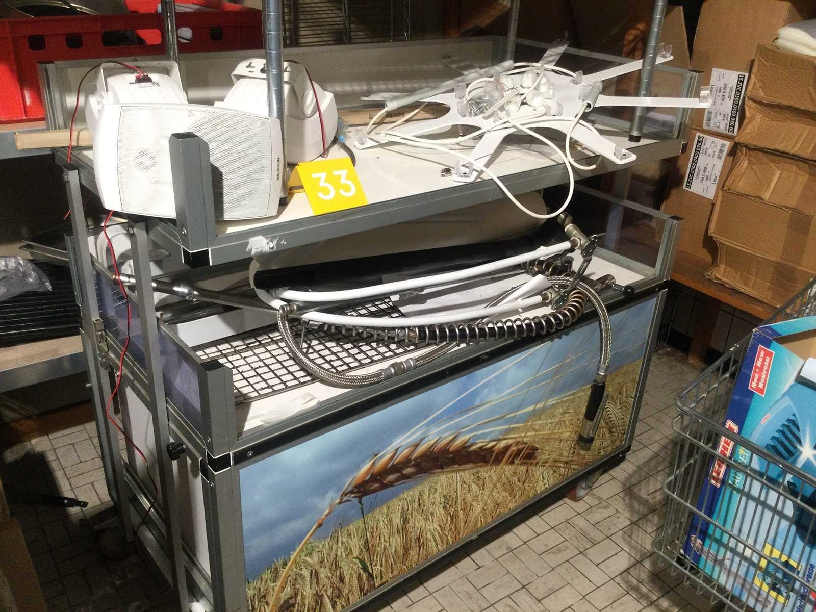 Etaleerwagen; alu constructie; stevige wielen; 2 verdiepen; 60x117x115cm; zonder inhoud foto; Nee