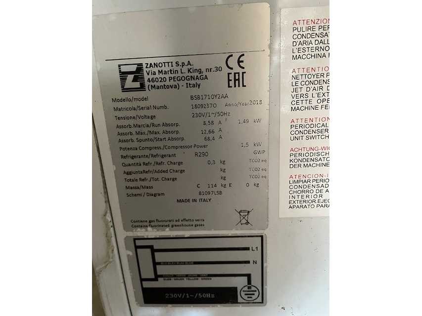 Koelgroep monoblok 230V; freon R290; Nee Merk: Zanotti Type: BSB1710 Y2AA Bouwjaar: 2018 Afmeting l: 1120mm Afmeting b: 950mm Afmeting h: 430mm