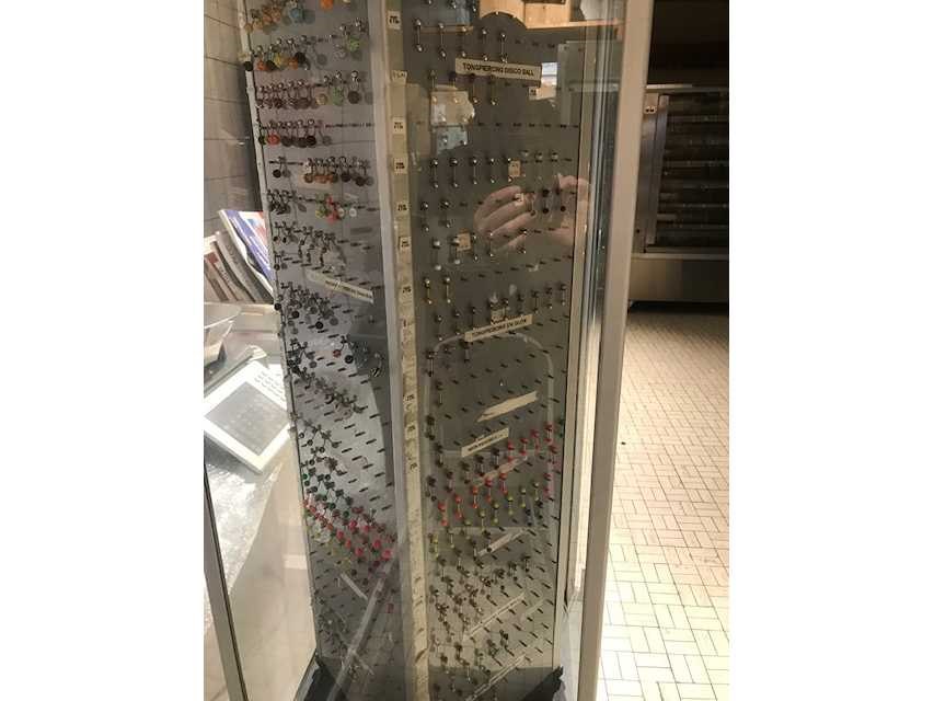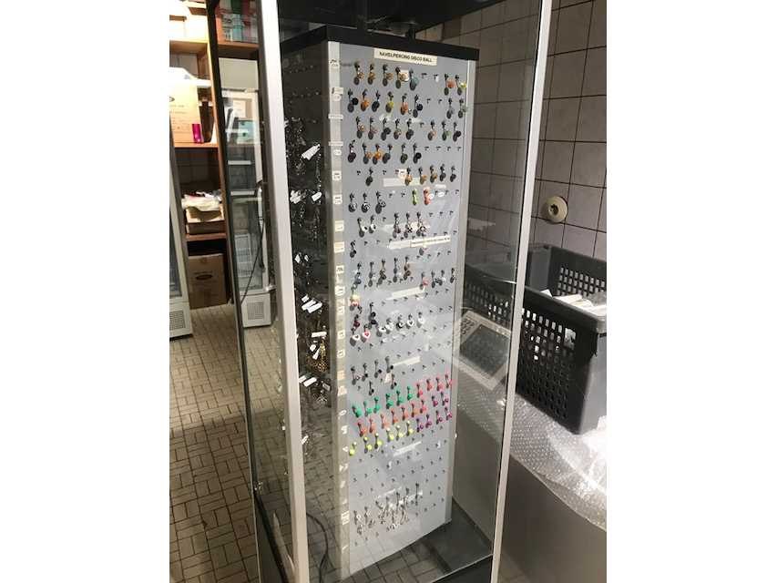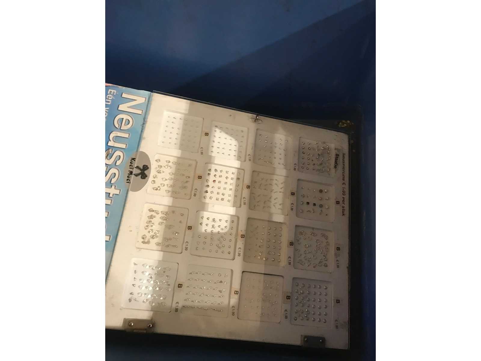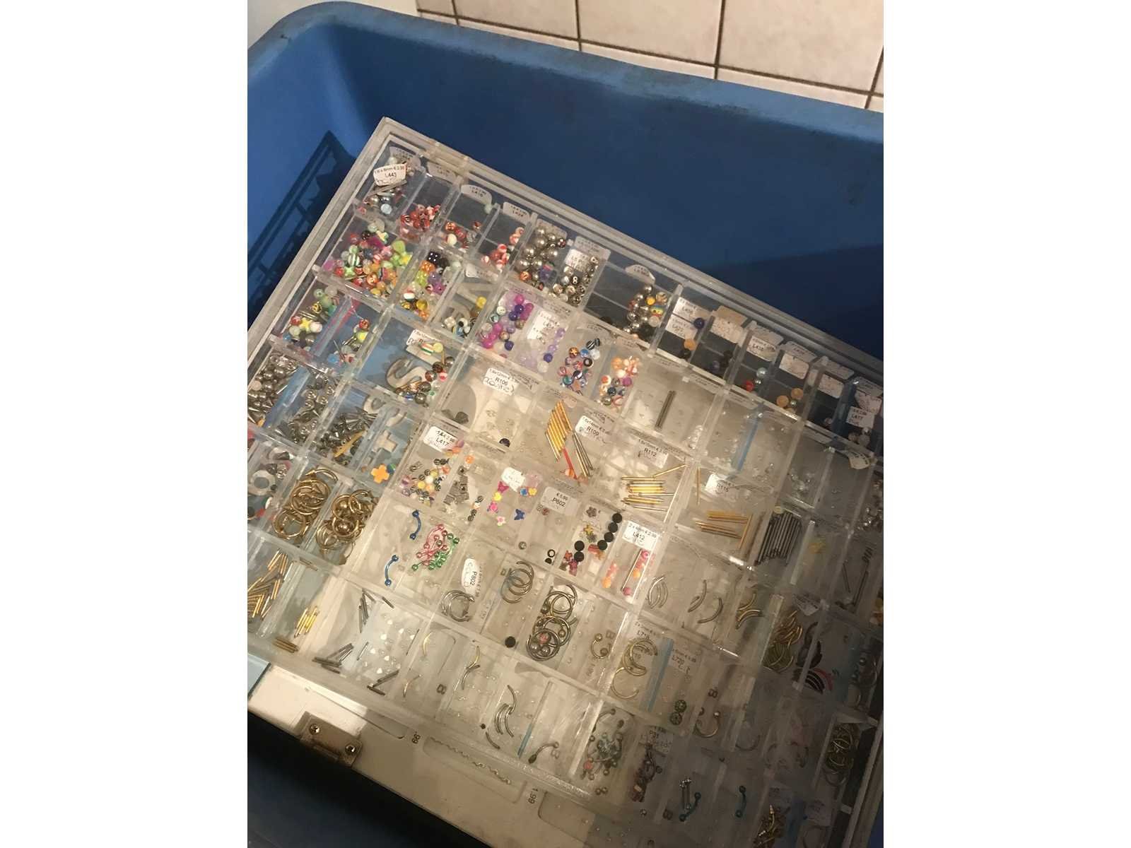 Grote partij piercings, stretchers, oorbellen; in opbergkisten; met etalagekast; toestellen voor aanbrengen piercings; duizenden stuks; ongebruikt; Nee