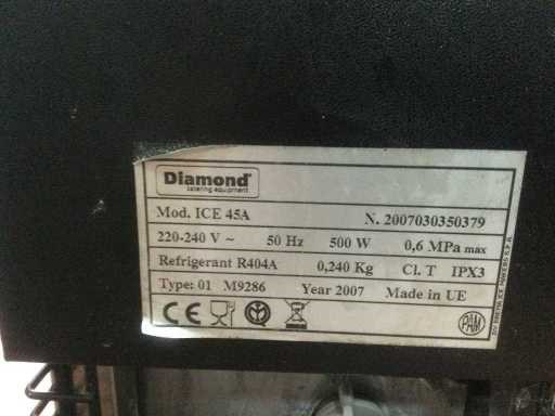 Nee Merk: Diamond Type: Ice 45A Capaciteit.: 40kg/24 hr Rvs: true Aansluiting: 230V Soort koudemiddel: R404A Totale afmeting L: 50cm Totale afmeting Breedte: 58cm Totale afmeting Hoogte: 80cm