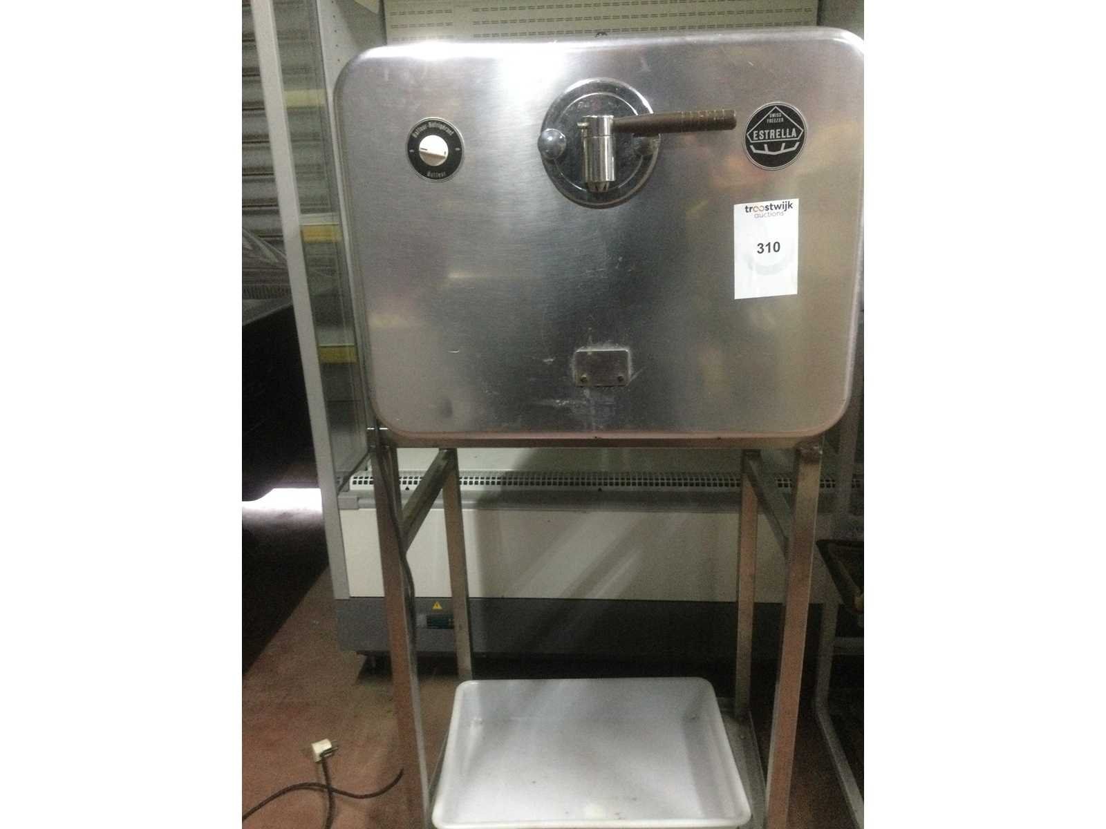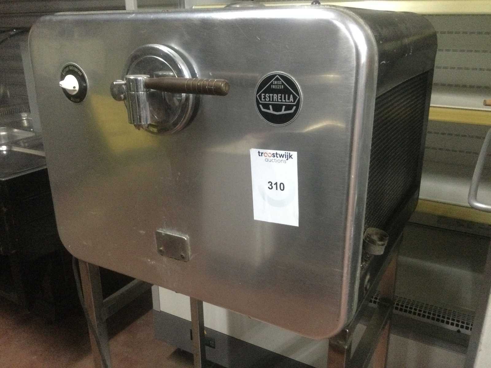 Antieke roomijsmachine; werkend; op rvs mobiele voet; Nee Merk: Estrella Aansluiting: 230V Eigen gewicht: 70kg Totale afmeting L: 650mm Totale afmeting Breedte: 600mm Totale afmeting Hoogte: 500mm