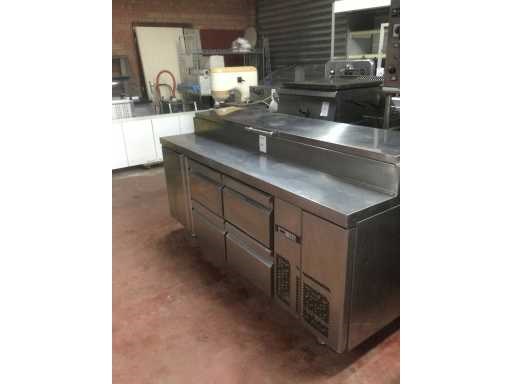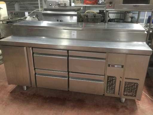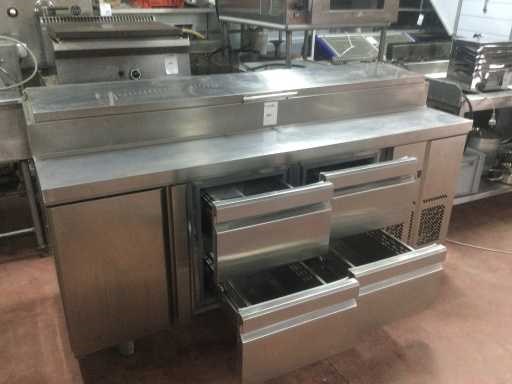 Gekoelde werkbank met ingebouwde saladette; voorzien van 2 ladensets van 2 laden; regelaar-thermostaat niet aangesloten; compressor draait; Nee Totale afmeting L: 196cm Totale afmeting Breedte: 70cm Totale afmeting Hoogte: 102cm Ingebouwde koelcompressor: true Rvs: true Aansluiting: 230V Aantal laden: 4pcs