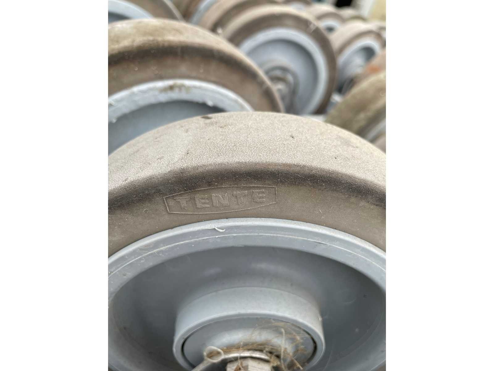 Bestaande uit : 8 wielen, waarvan 4 zwenkwielen met rem; vork in rvs; plaatbevestiging; niet-strepende, elastische rubberband; draagkracht 400kg; met bak; Nee Merk: Tente Type: U200 Totale afmeting L: 200mm Totale afmeting Breedte: 46mm Totale afmeting Hoogte: 240mm