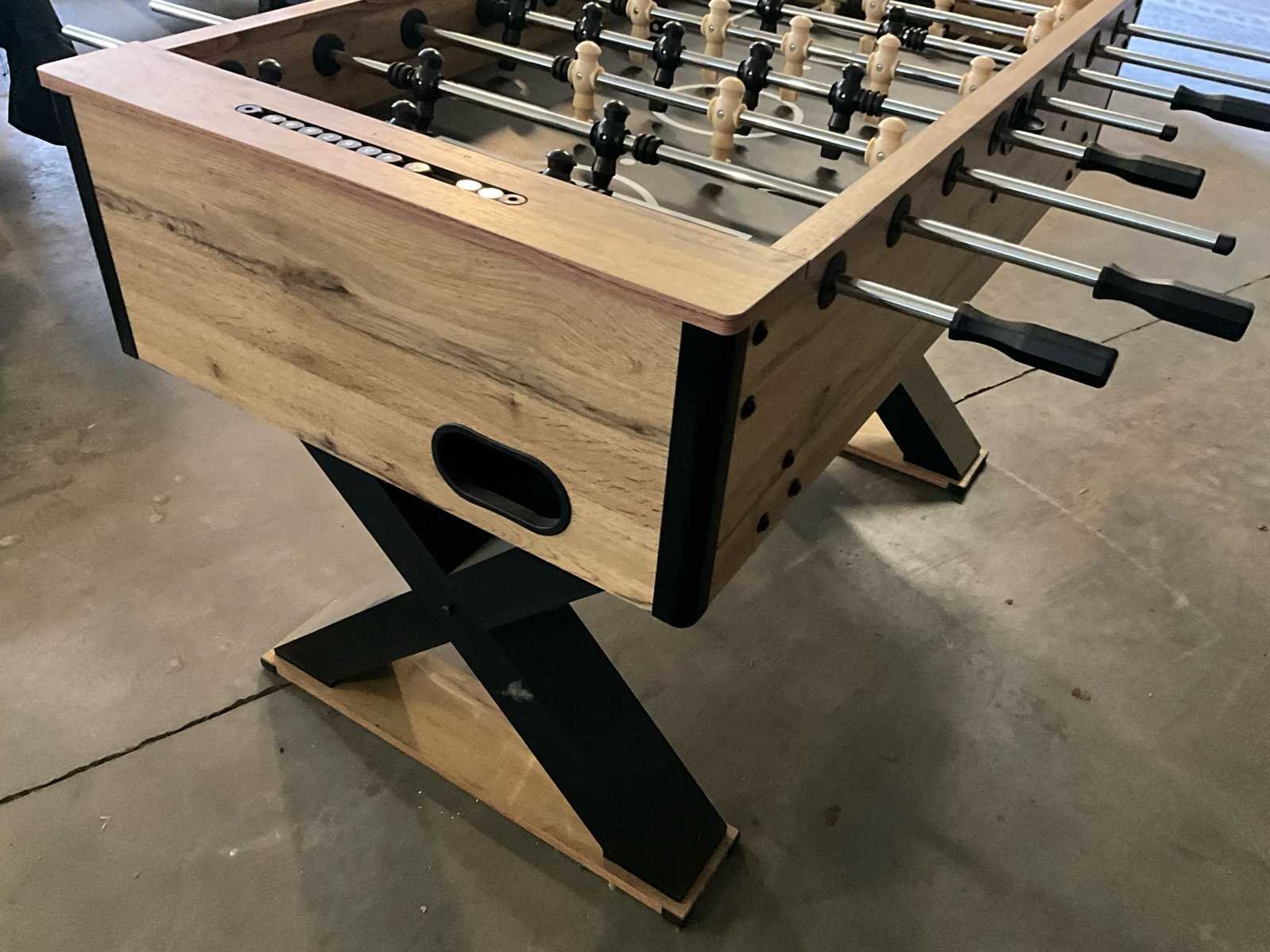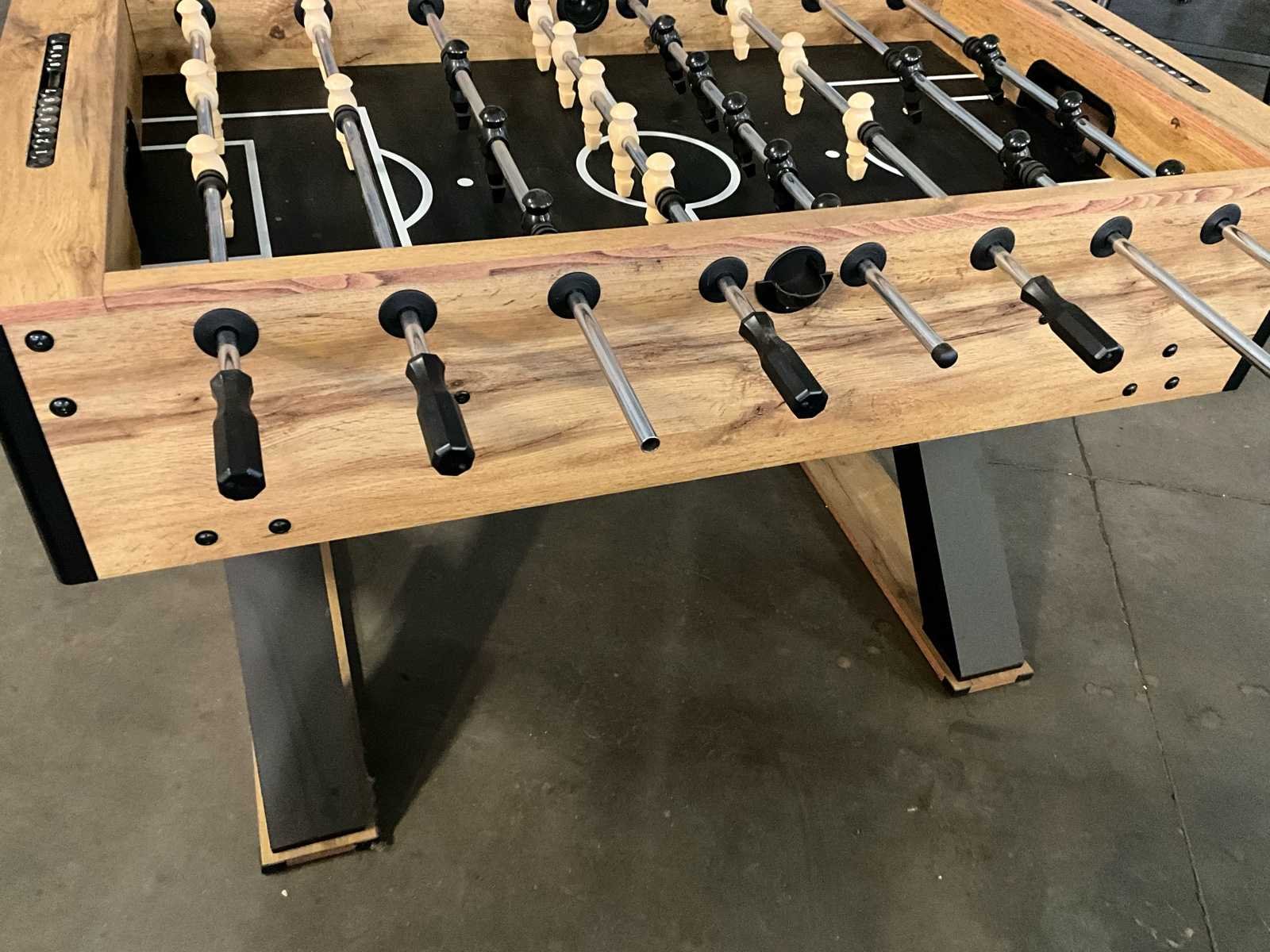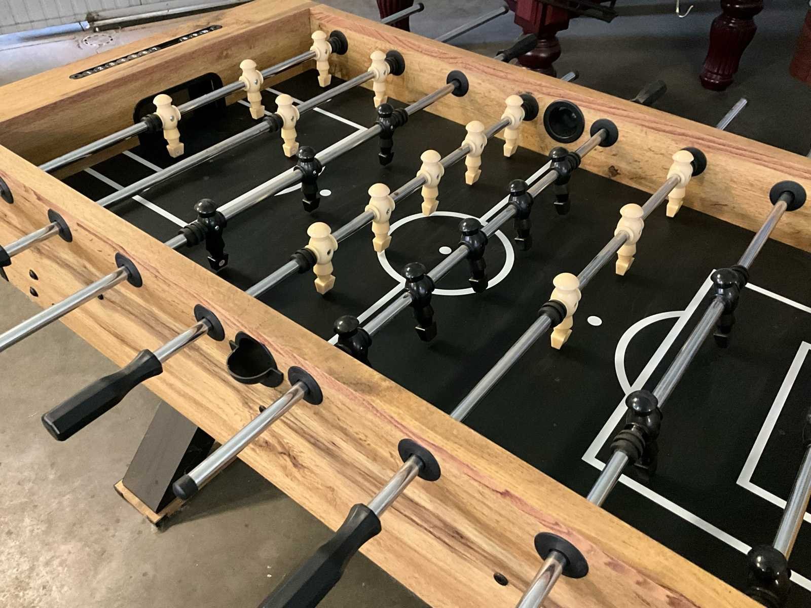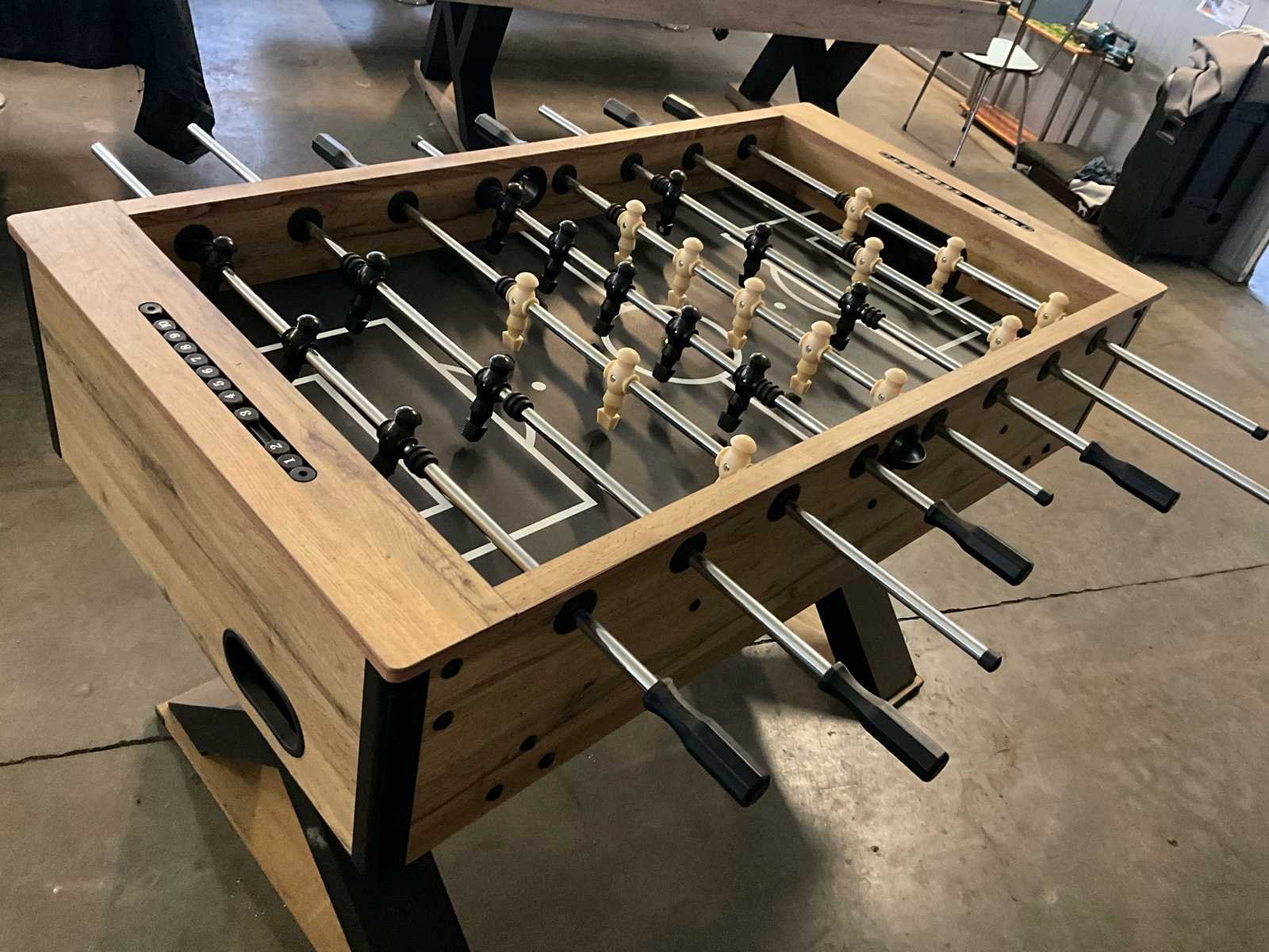 Modern Italiaans design (onderstel met stalen bar). met kunststof handvaten, zwarte en ivoren kleur spelers, roillementen, rubbers en competitiebaren. Inclusief 2 balletjes. Wordt volledig nieuw in verpakking geleverd, deze kan in elke wagen met opgeklapte achterbank. No Model: Conestago Gewicht: 80 Lengte: 140 Breedte: 75 Hoogte: 90