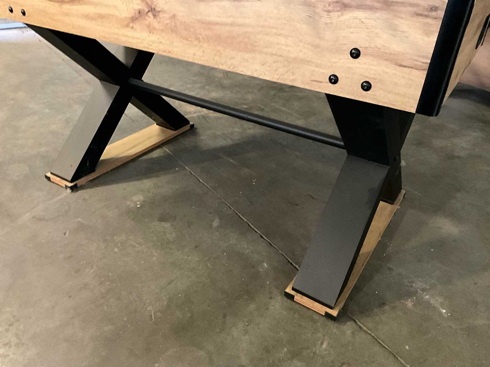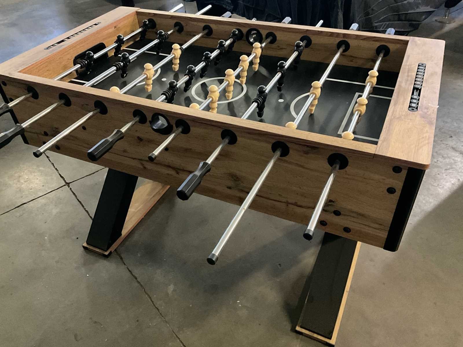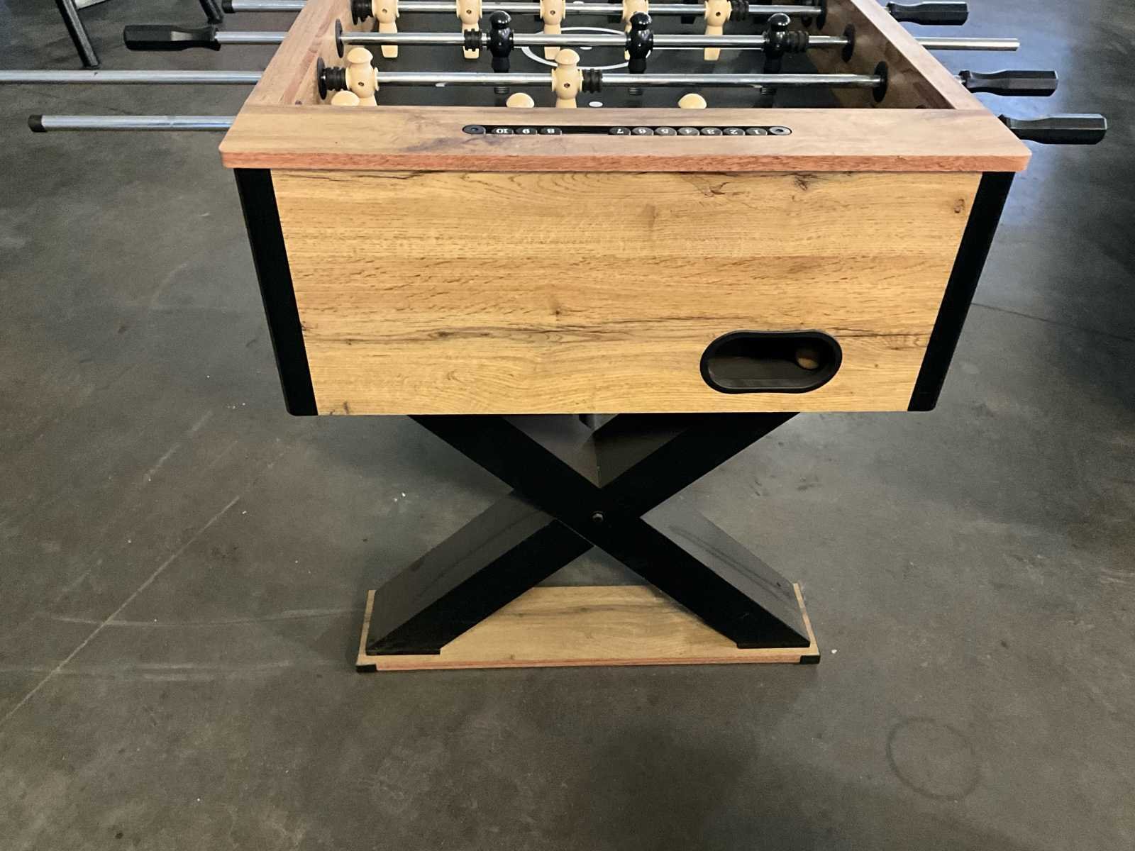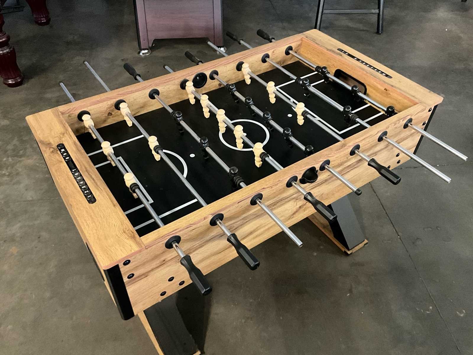 Modern Italiaans design (onderstel met stalen bar). met kunststof handvaten, zwarte en ivoren kleur spelers, roillementen, rubbers en competitiebaren. Inclusief 2 balletjes. Wordt volledig nieuw in verpakking geleverd, deze kan in elke wagen met opgeklapte achterbank. No Model: Conestago Gewicht: 80 Lengte: 140 Breedte: 75 Hoogte: 90