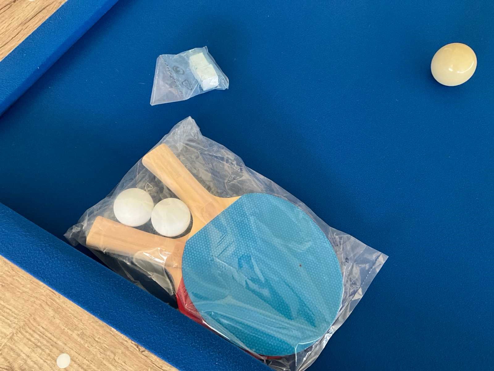 Nieuw in de verpakking (verpakking heeft afmeting 222x128x23, 135kg) enkel poten te monteren - speeloppervlak 192x95cm - afwerking in AX Resin lichte nerfstructuur - hoeken bovenaan afgewerkt met kunststof - competitiebanden K66 - laken: ultradun superlang cloth - salonstijl dropockets - verstelbare poten - 2 delige afdekplaat met 1 zijde tafeltennis - inclusief 2 keus van 1.46m, set ballen, 2 krijtjes, driehoek, ping-pong netje + bevestigingsmateriaal, 2 pingpongballetjes en 2 palletjes. Kan mee geladen worden door verkoper. Nee Lengte: 214 Breedte: 121 Hoogte: 79