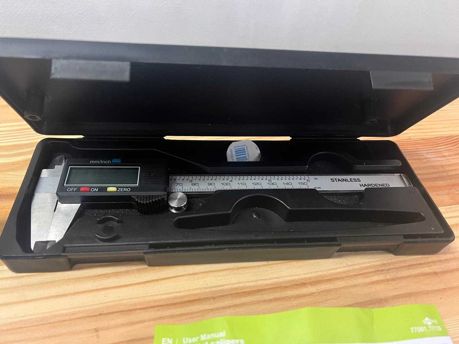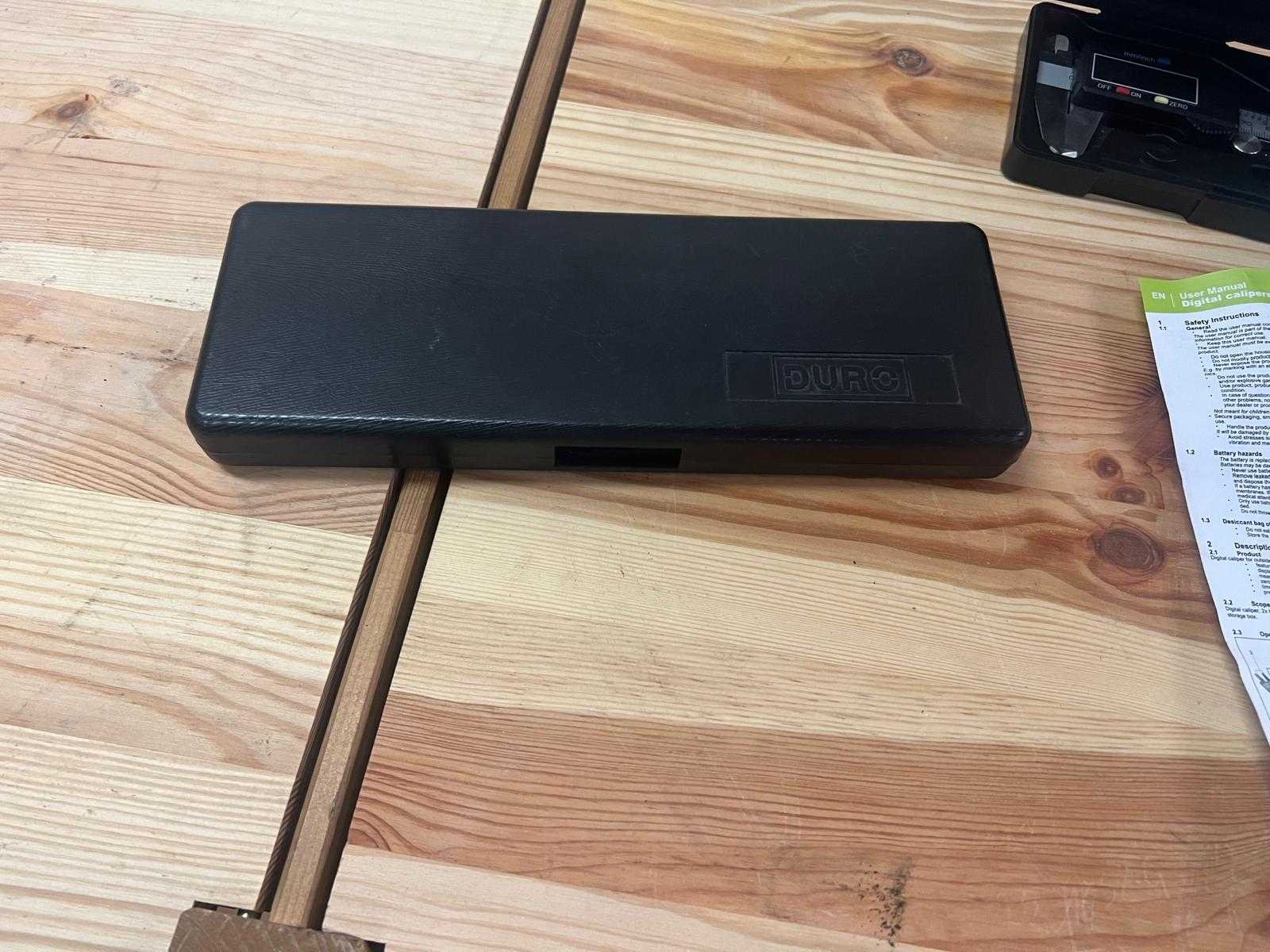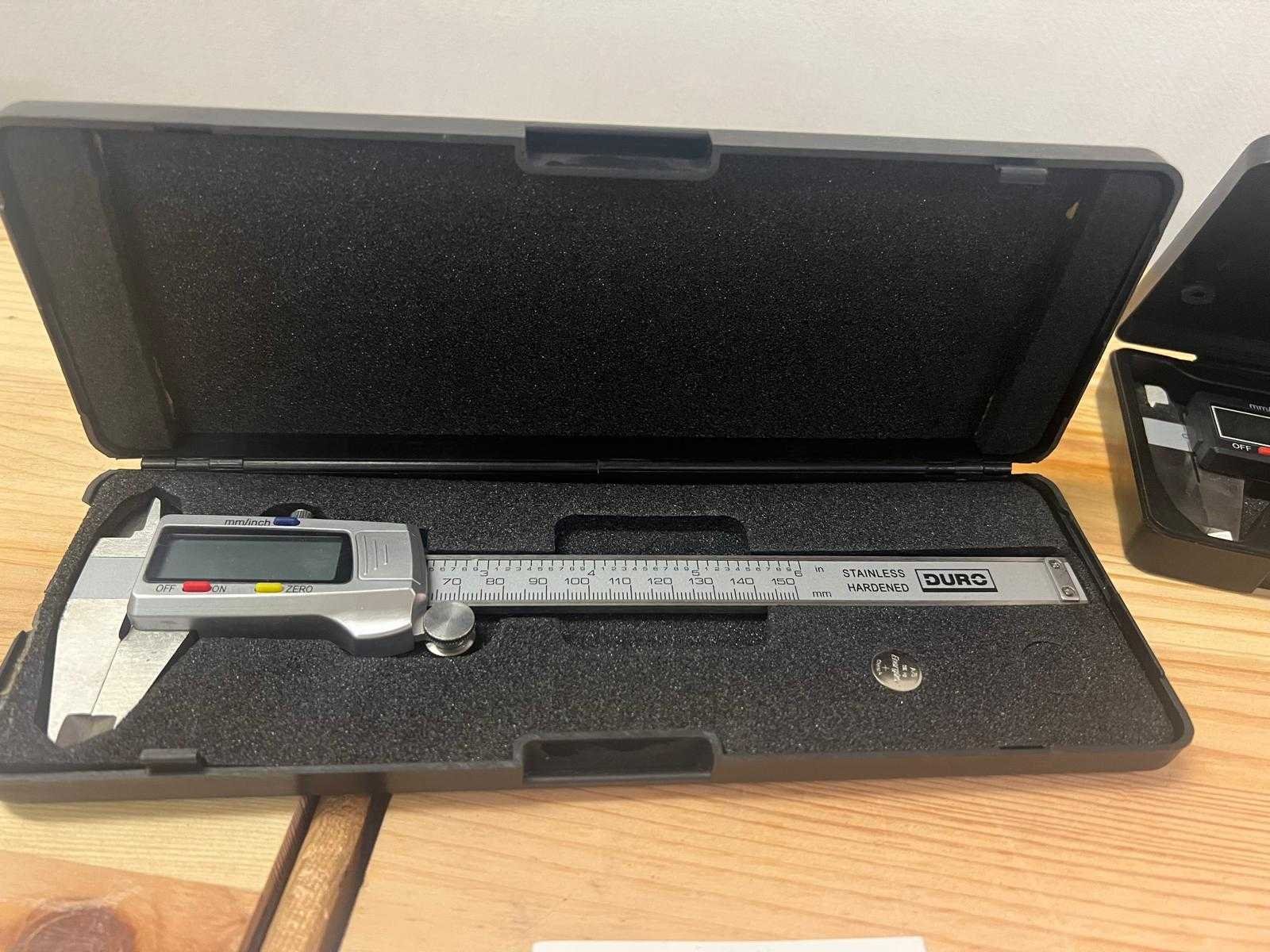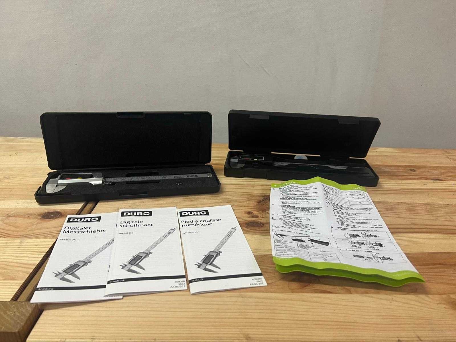 Twee digitale schuifmaten in kunststof opbergkoffer, inclusief handleidingen in drie talen (Duits, Nederlands, Frans) en extra gebruiksblad in het Engels. Model DURO DC-1, roestvrijstalen uitvoering, meetbereik 0–150 mm, resolutie 0,01 mm, LCD-display, functies: mm/inch-omschakeling, aan/uit, nulstelling. Inclusief batterij en kunststof opbergkoffer. Beide schuifmaten getest op werking; in nette staat met volledige documentatie. Nee