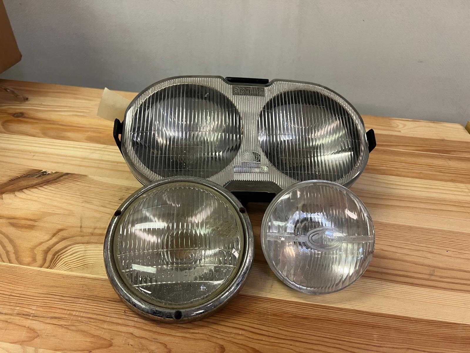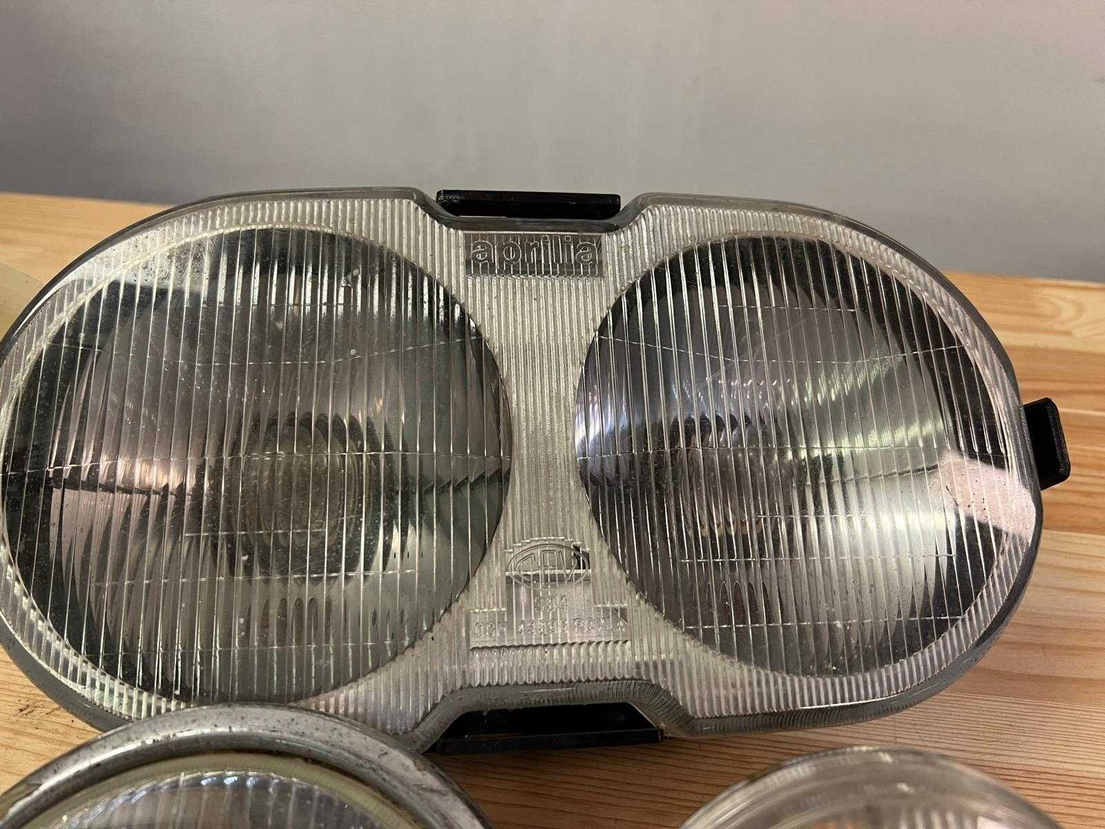 Set van 3 originele koplampen voor klassieke motorfietsen. Bevat: - 1x dubbele koplampunit Aprilia / CEV 334 met behuizing - 1x ronde CEV koplamp met metalen rand, type 159/193 - 1x ronde CEV koplamp zonder rand, type 86004 Originele Italiaanse onderdelen uit de jaren ’70–’90, geschikt voor restauratie of vervanging op modellen van Aprilia, Moto Guzzi, Ducati, Benelli, Laverda, Gilera en andere Europese merken. Gebruikte staat met lichte gebruikssporen, glas en reflectoren in degelijke conditie. Nee Merk: CEV Product type: Koplampunit Kleur: Transparant / chroom Materiaal: Glas en metaal