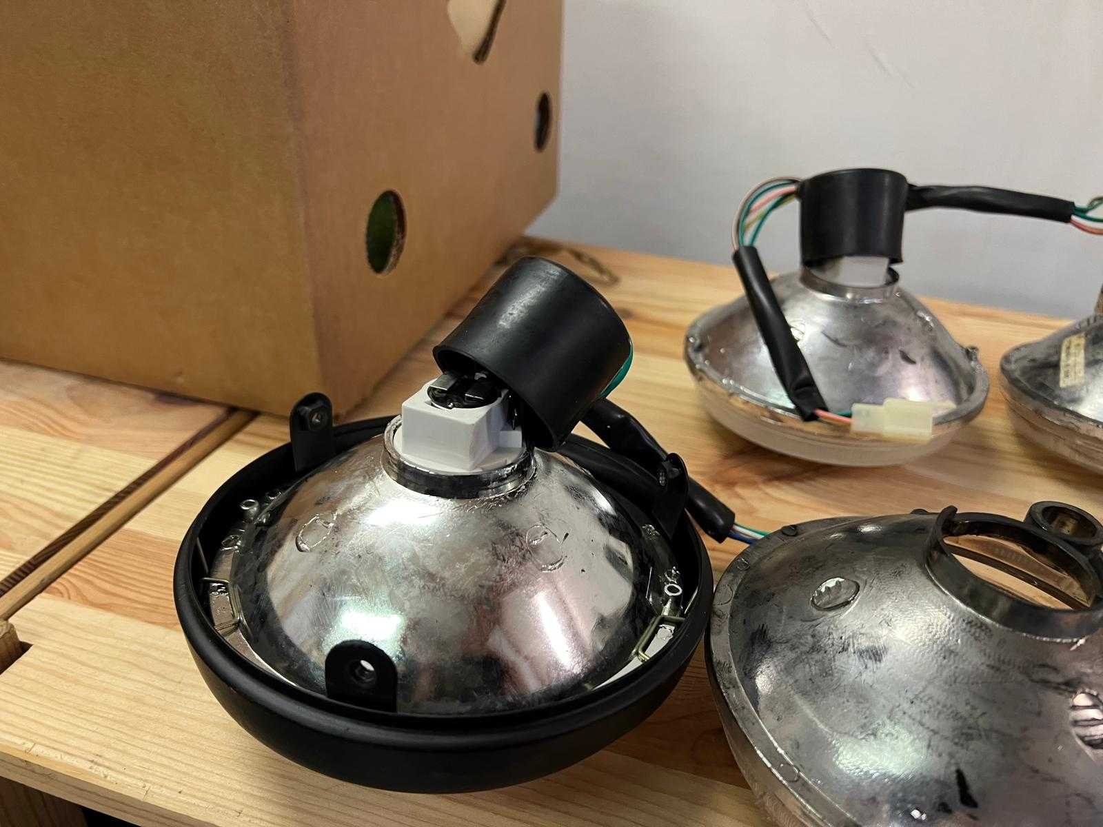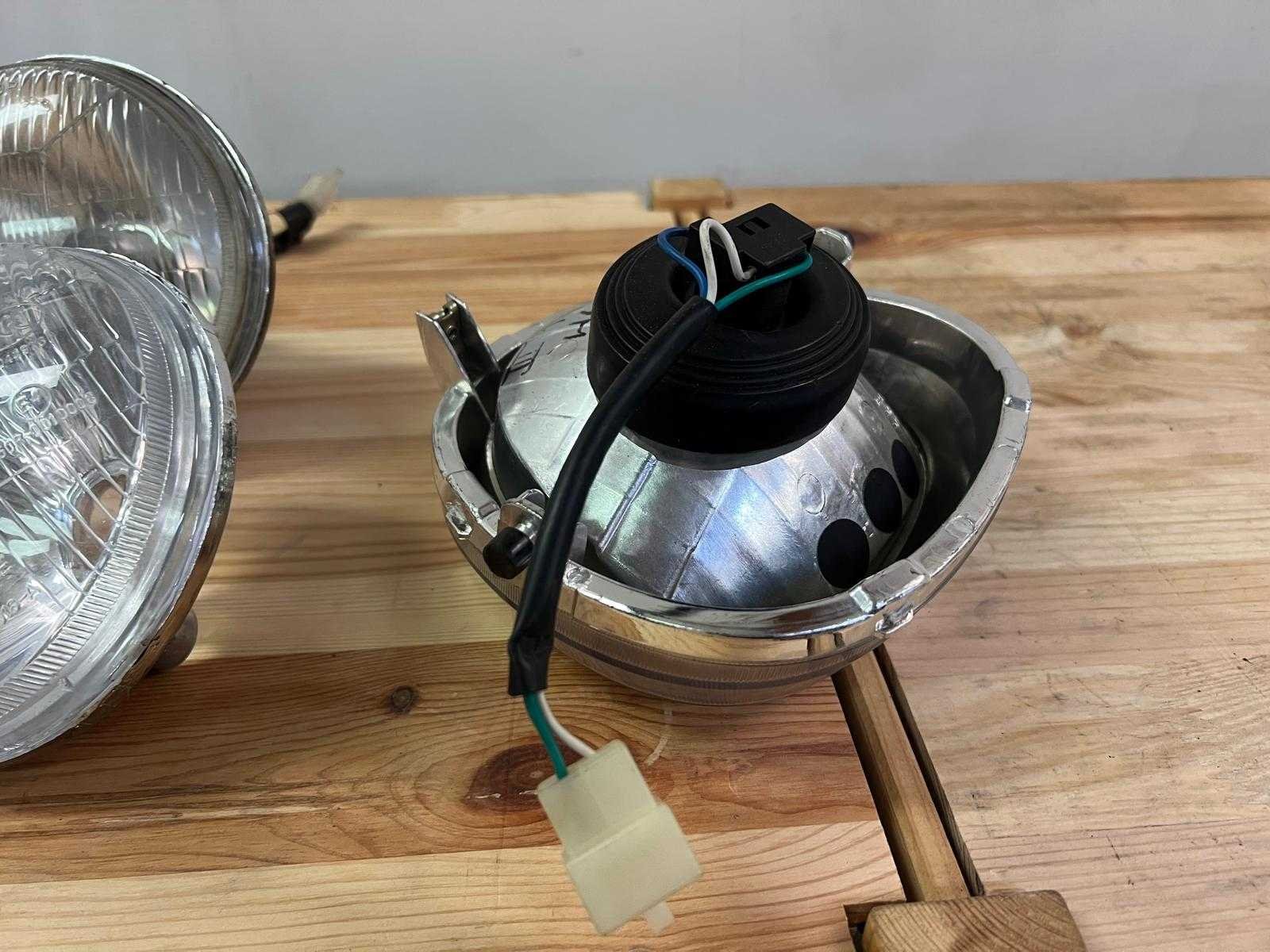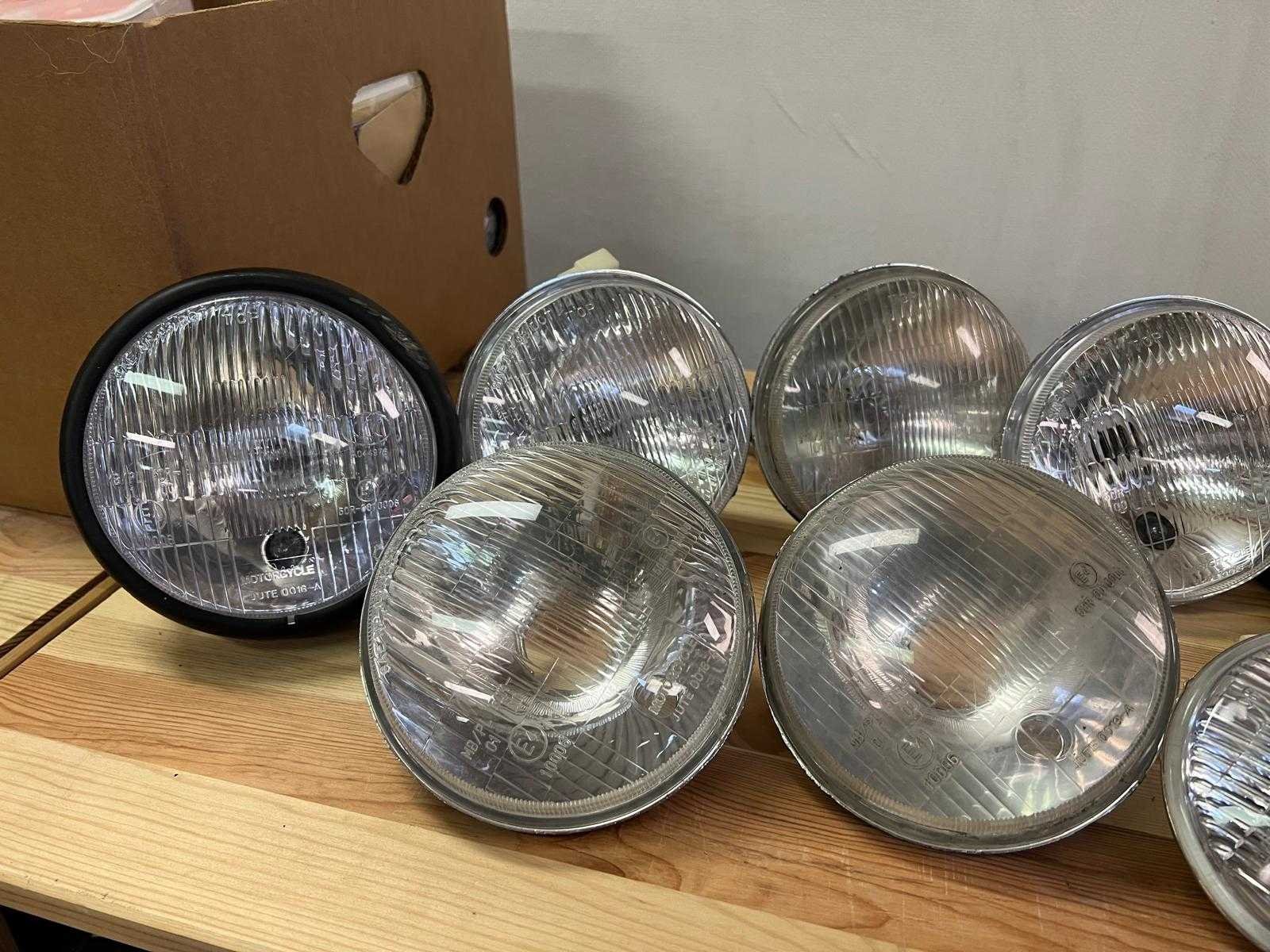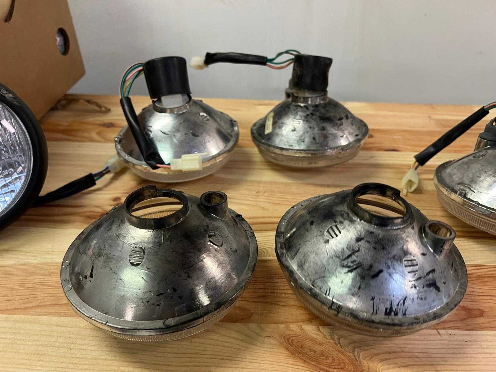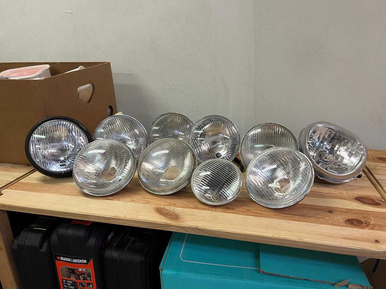 Partij van 10 originele JUTE motorfiets koplampen, bestaande uit: - 9 ronde halogeenunits met metalen reflector en glazen lens (gemerkt “Motorcycle JUTE”) - 1 ovale koplampunit met geïntegreerde fitting en bedrading Alle lampen zijn 12V en universeel toepasbaar voor verschillende motoren. Nee Merk: JUTE Product type: Koplampunits Kleur: Transparant / chroom Materiaal: Glas en metaal