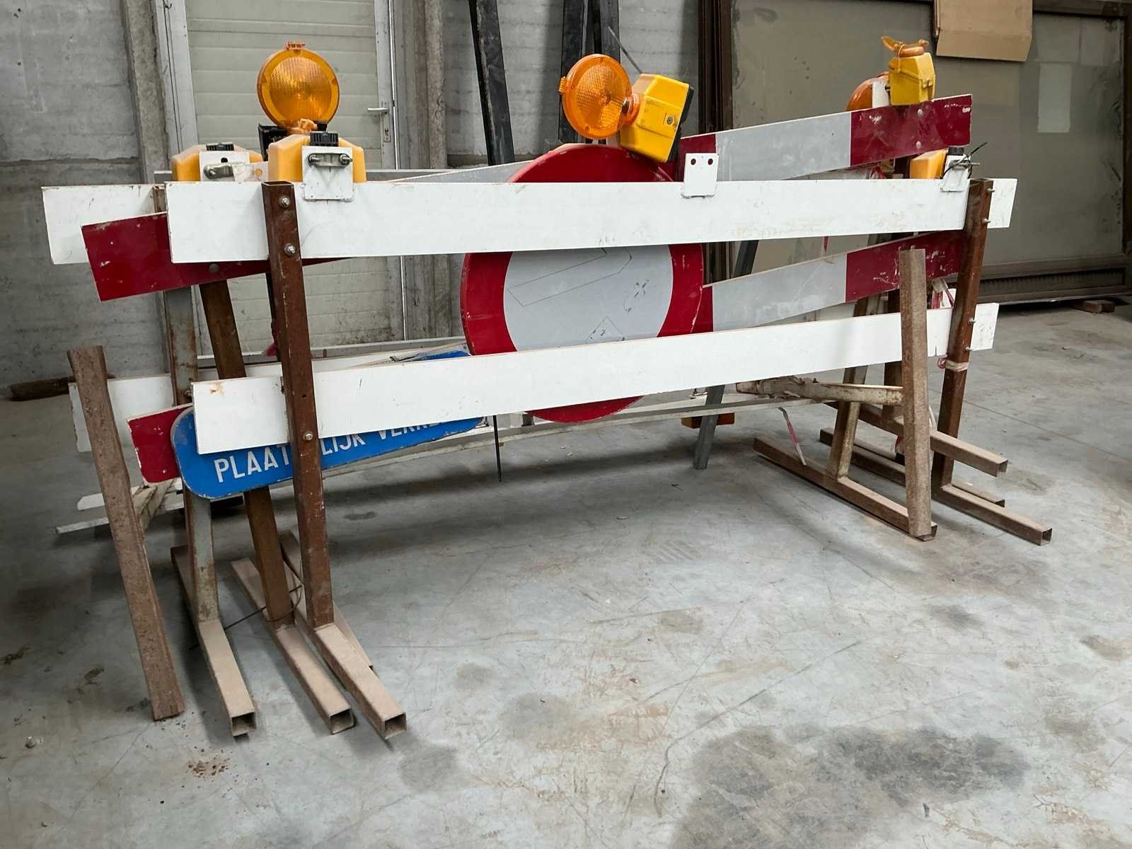 6 wegblokkades 2 pilaren voor verkeerslicht min 15st met paal pallet met diverse ronde borden (verboden parkeren - snelheidslimiet - …) Nee