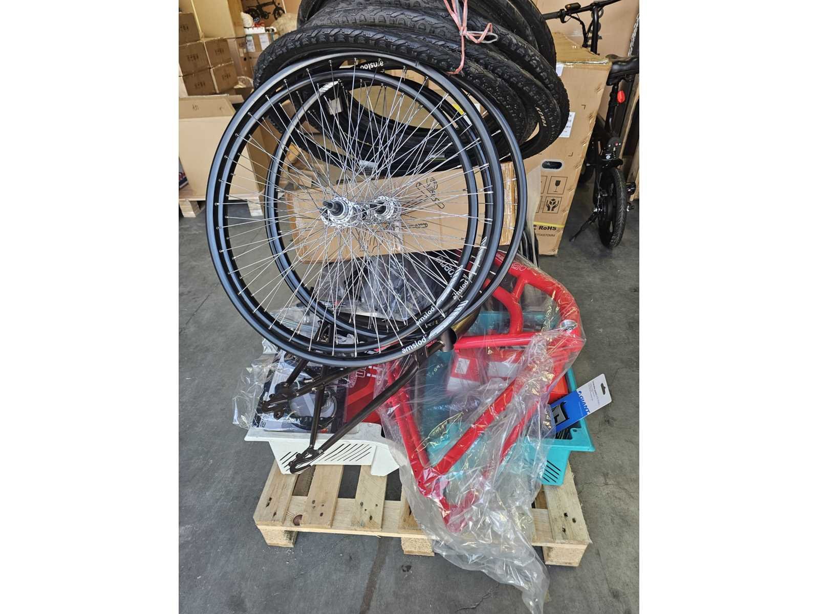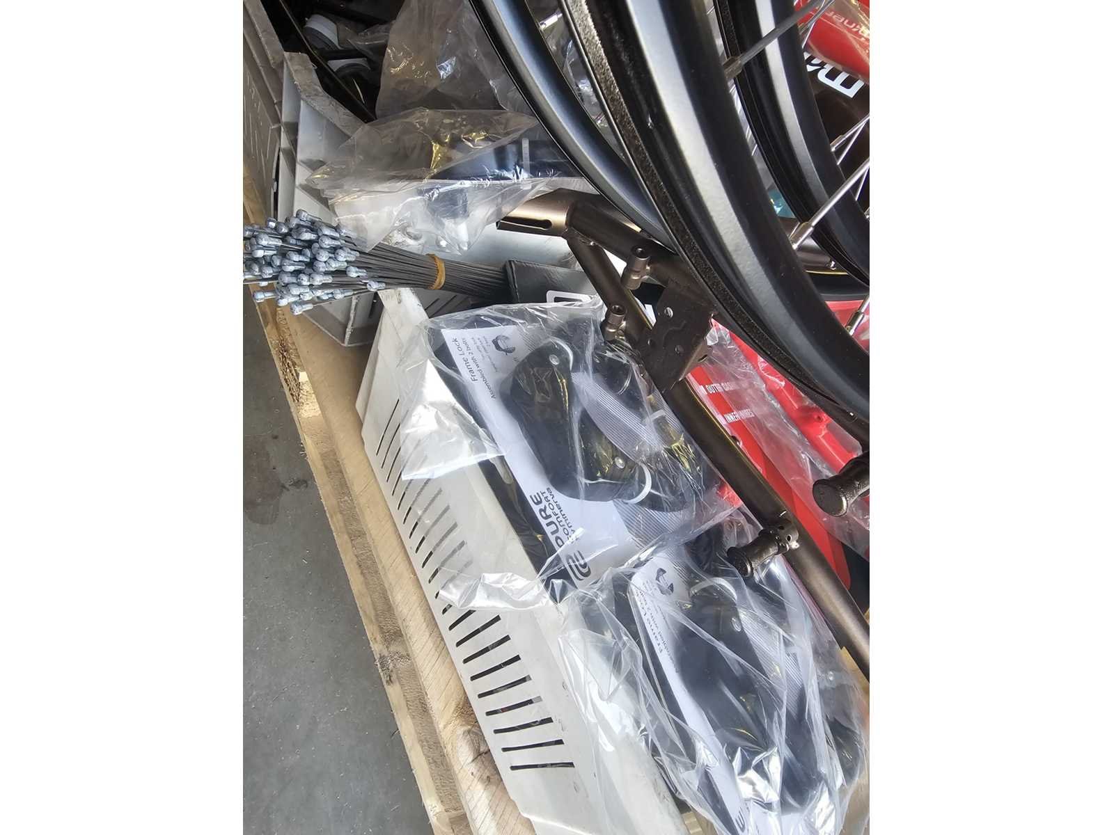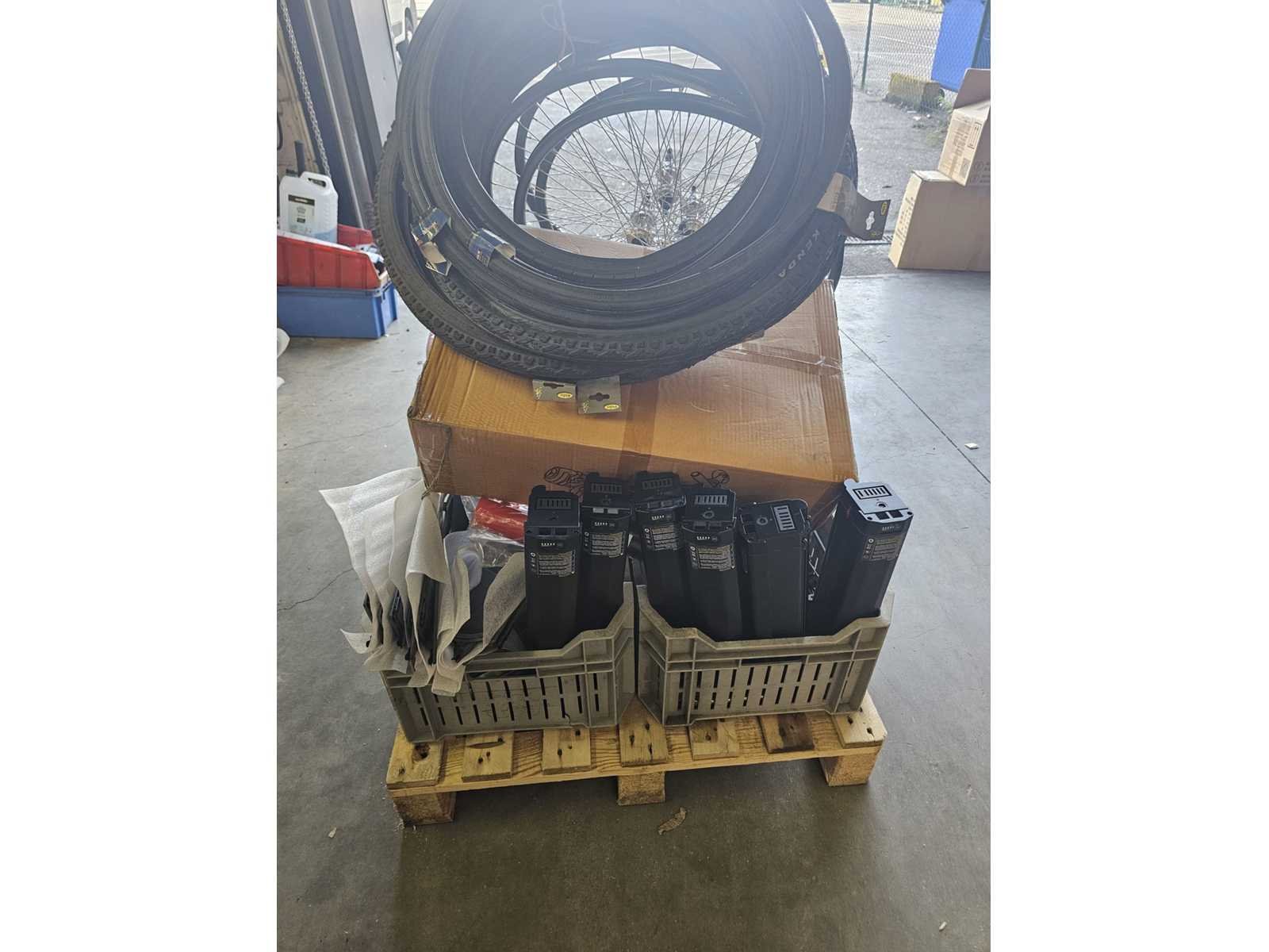 Verschillende fietsonderdelen en accesoires waaronder banden, wielen, versnellingen en nog meer. Inclusief pallet! Nee